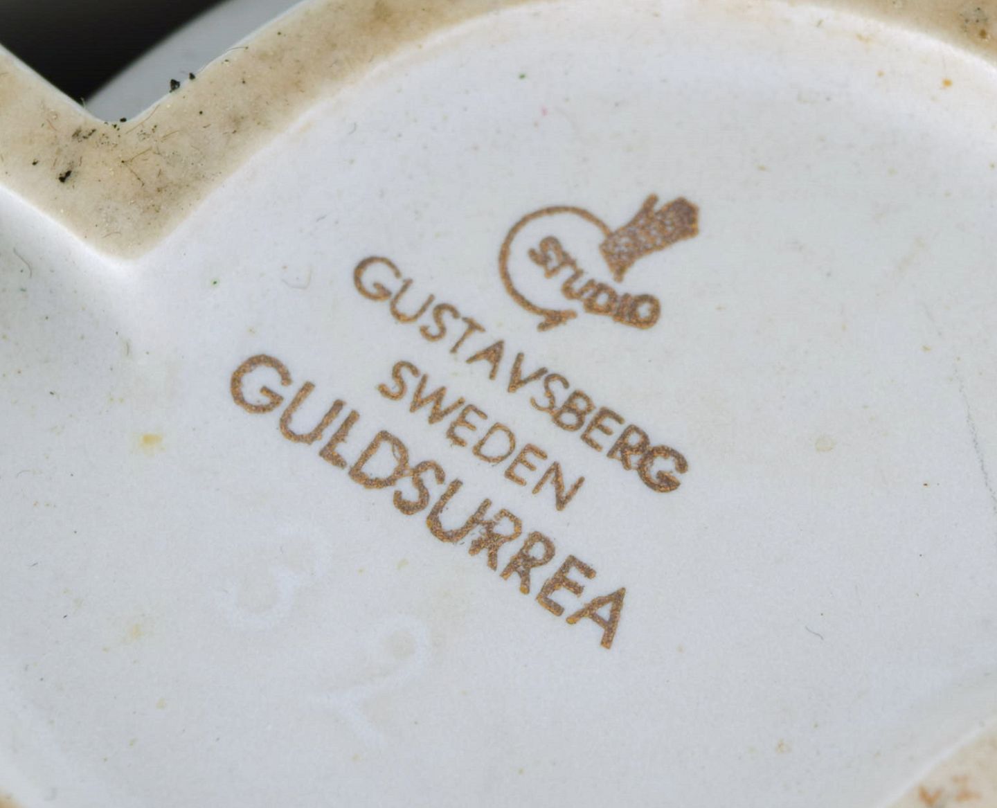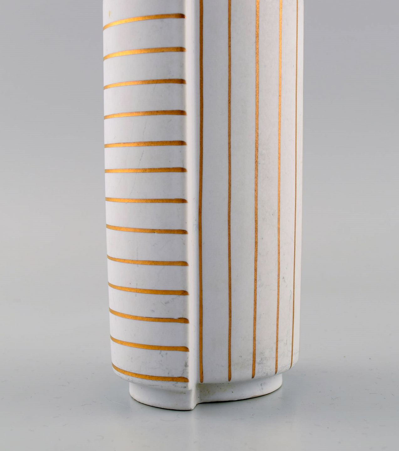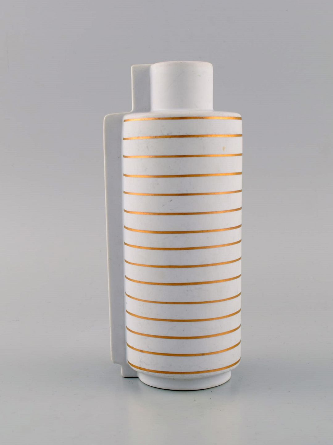 Wilhelm Kåge for Gustavsberg Studio Hand. Guldsurrea keramik dobbeltvase i mat hvid carrara-glasur med horisontale og vertikale guldstriber. Ikonisk og surrealistisk design. Surrea serien blev designet i 1936.