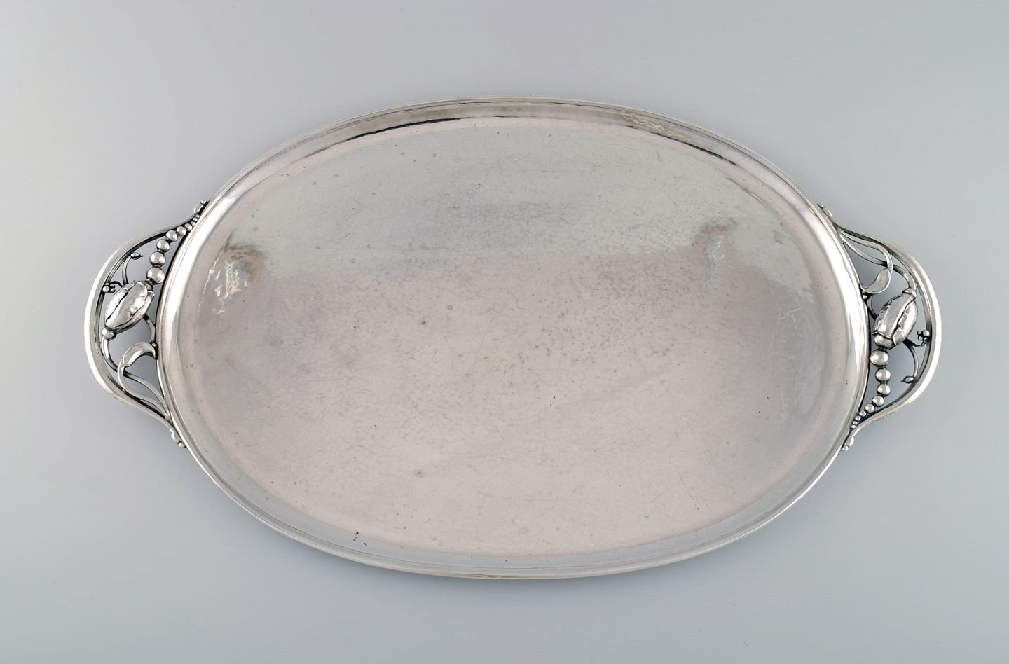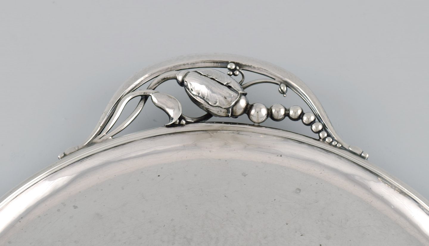 Kolossal Georg Jensen Magnolia serveringbakke i hammerslået sterlingsølv. Model 2E. Dateret 1915-1930.