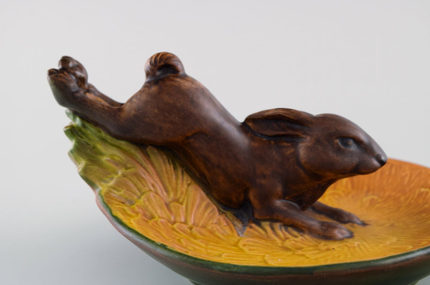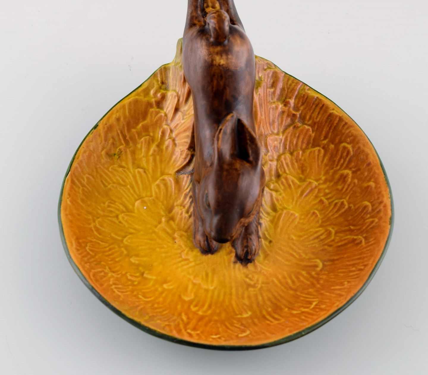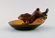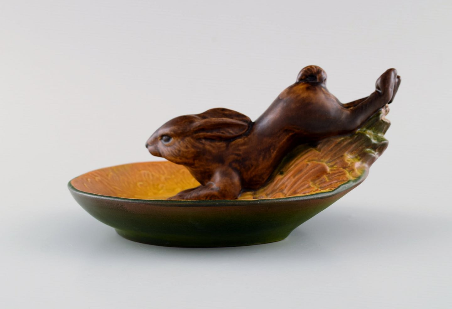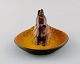 Ipsens enke, Danmark. Skål i håndmalet glaseret keramik modelleret med springende hare. 1920/30'erne. Modelnummer 206. Måler: 17 x 8 cm. I flot stand. Stemplet.