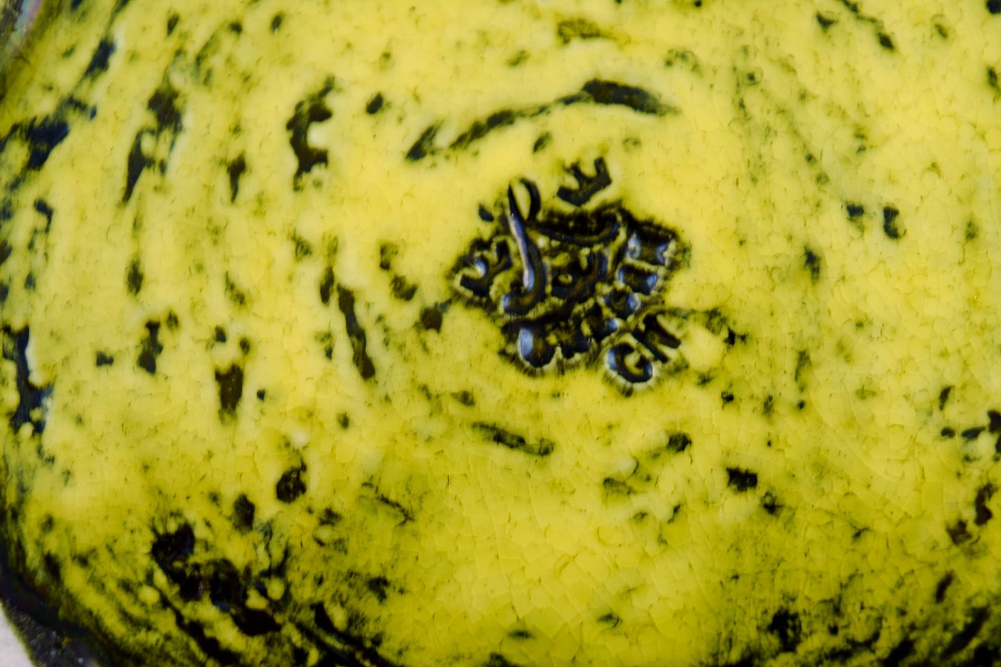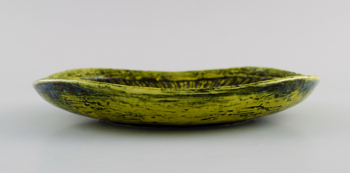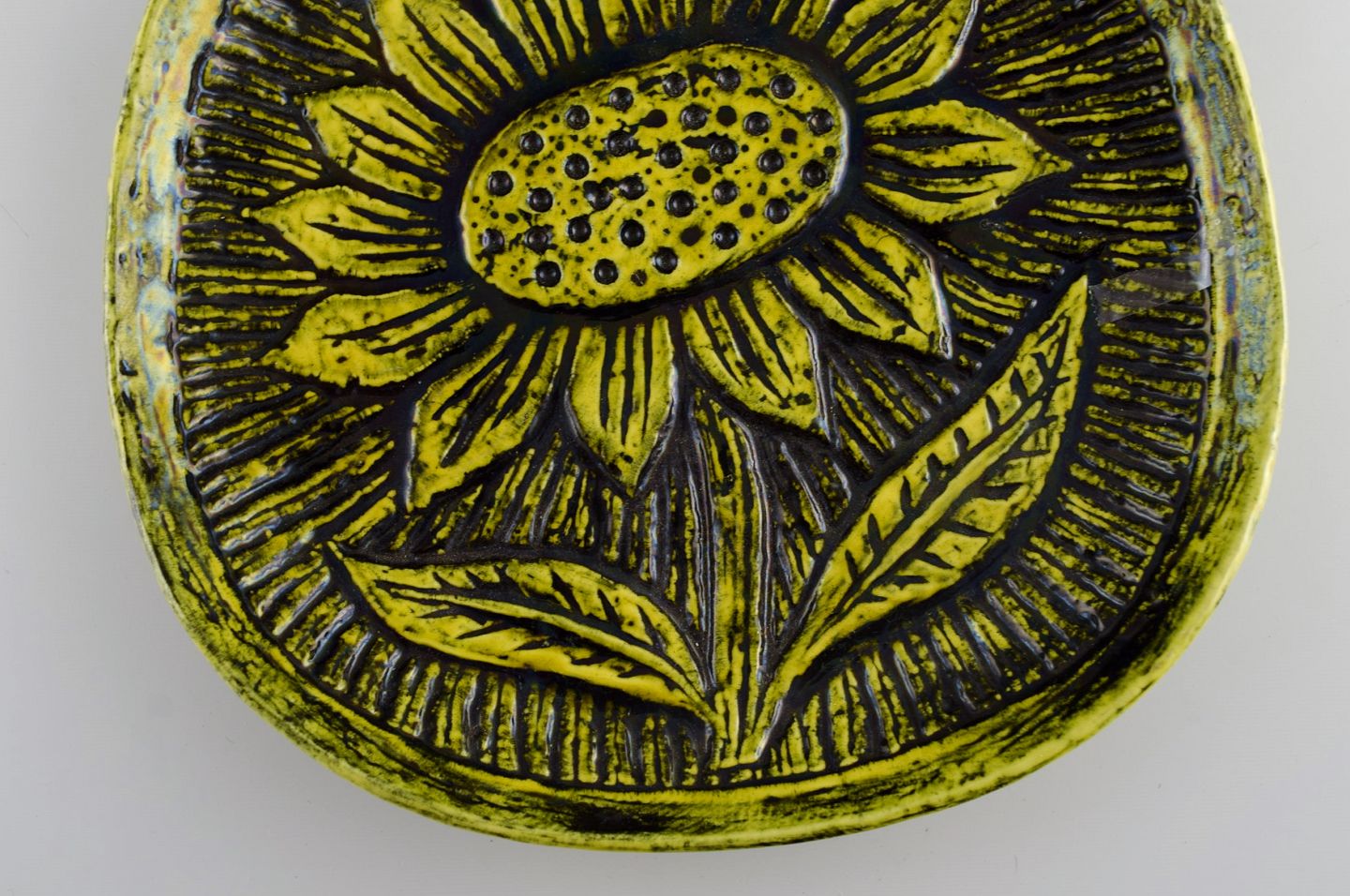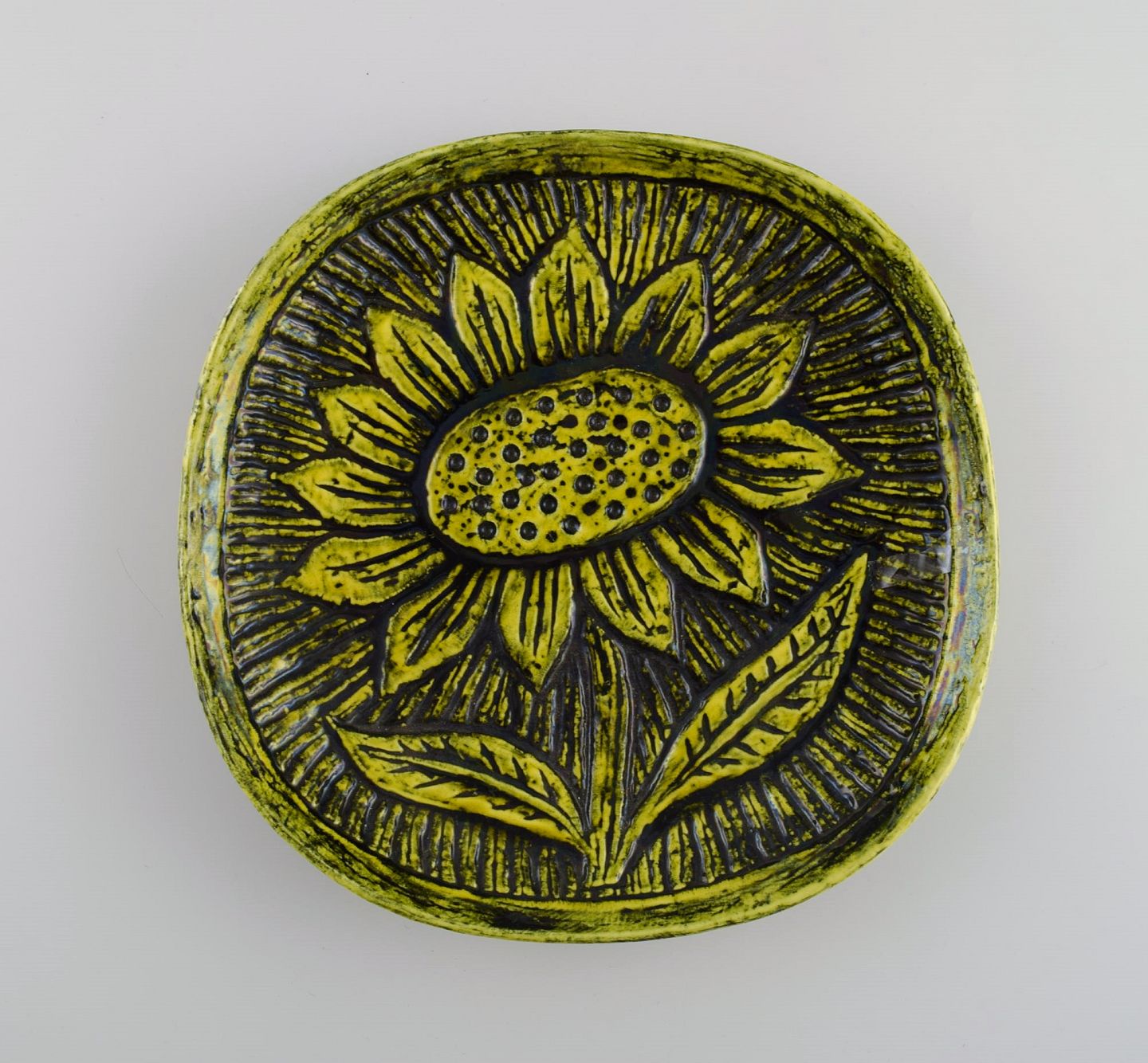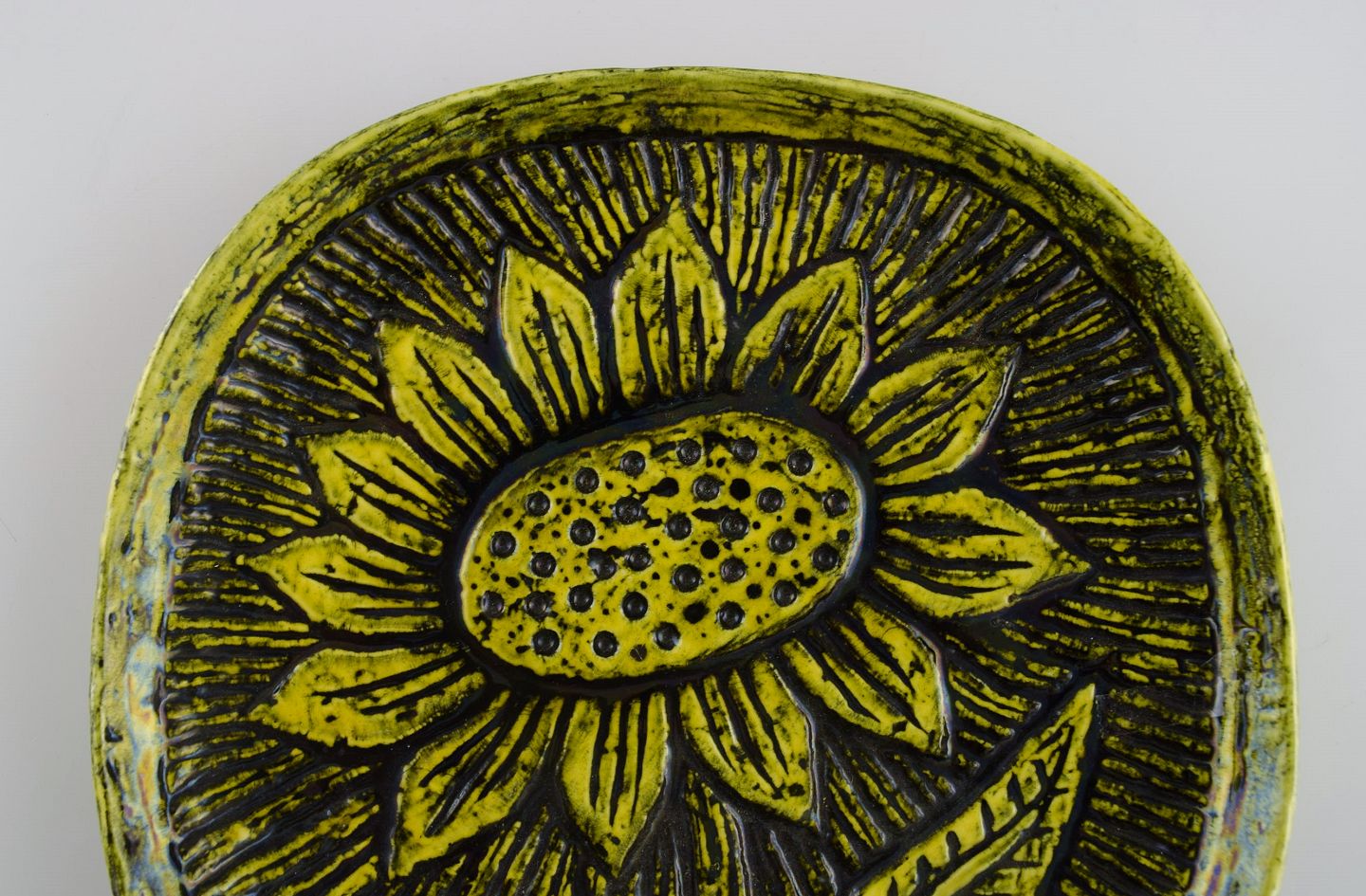 Gunnar Nylund for Rörstrand. Rundt fad / skål i glaseret keramik. Indridset solsikke på gul baggrund. Midt 1900-tallet. Måler: 20 x 3 cm. I flot stand. Signeret.