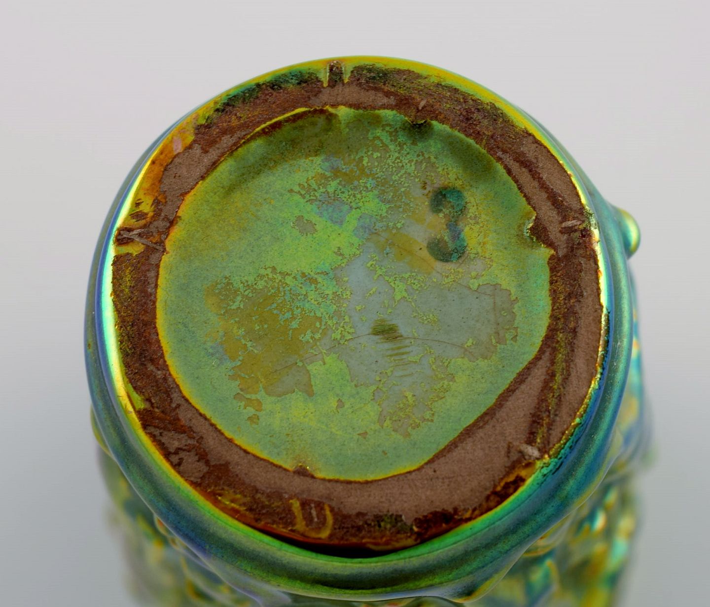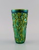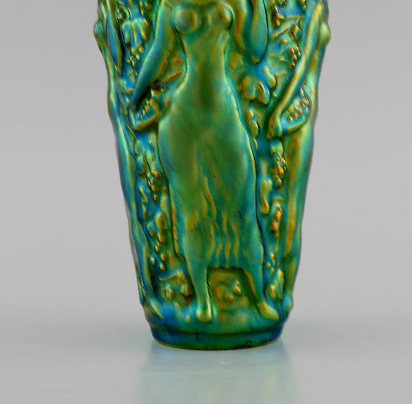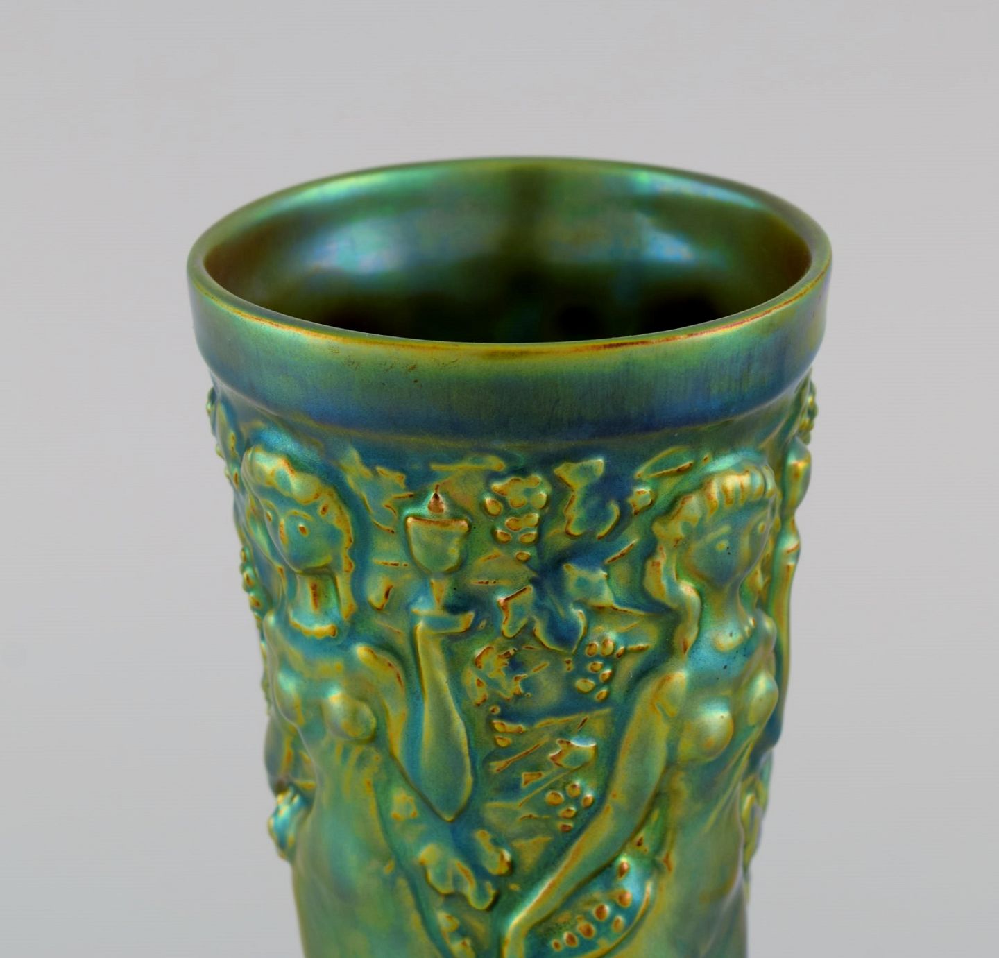 Zsolnay vase i glaseret keramik modelleret med kvinder der plukker druer. Smuk lustreglasur. Midt 1900-tallet. Måler: 16 x 8,5 cm. I flot stand. Stemplet.