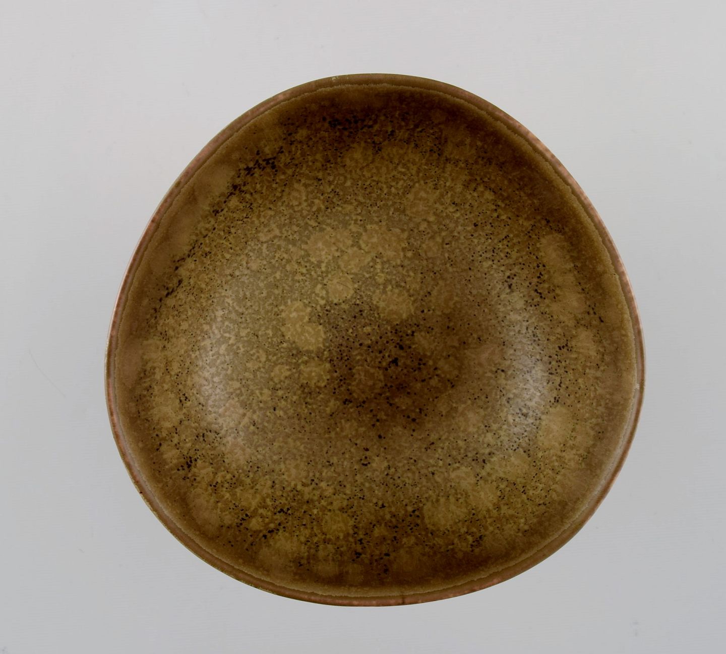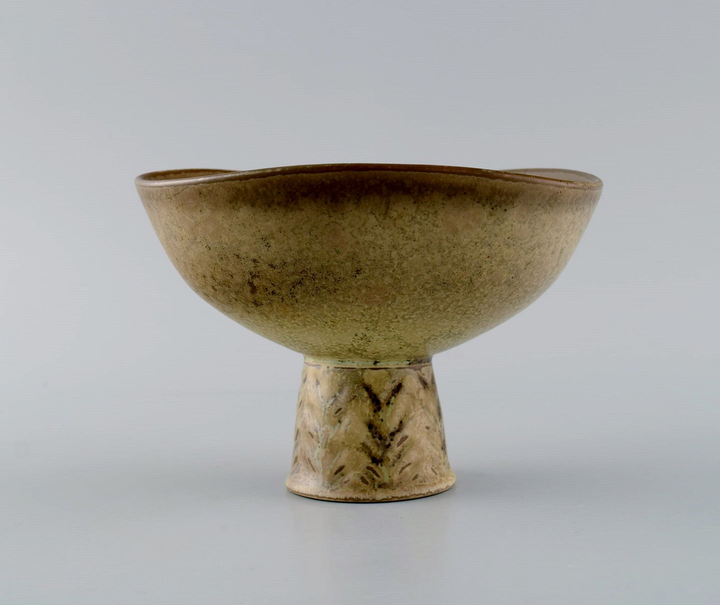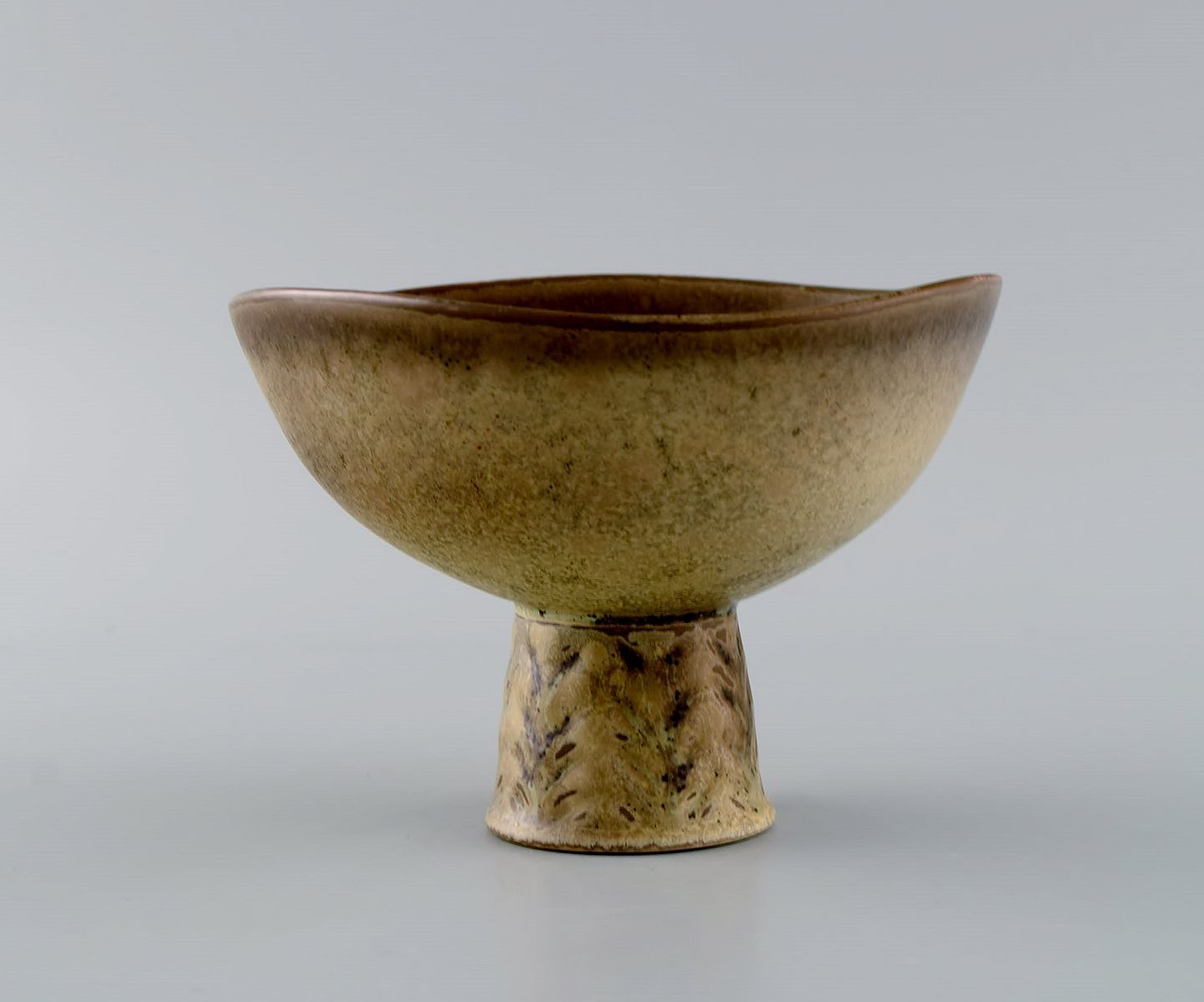Carl Harry Stålhane (1920-1990) for Rörstrand. Skål på fod i glaseret keramik. Smuk glasur i lyse jordnuancer. Midt 1900-tallet. Måler: 14 x 10 cm. I flot stand. Stemplet. 1. Sortering.