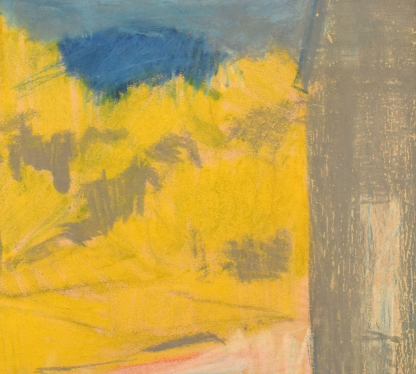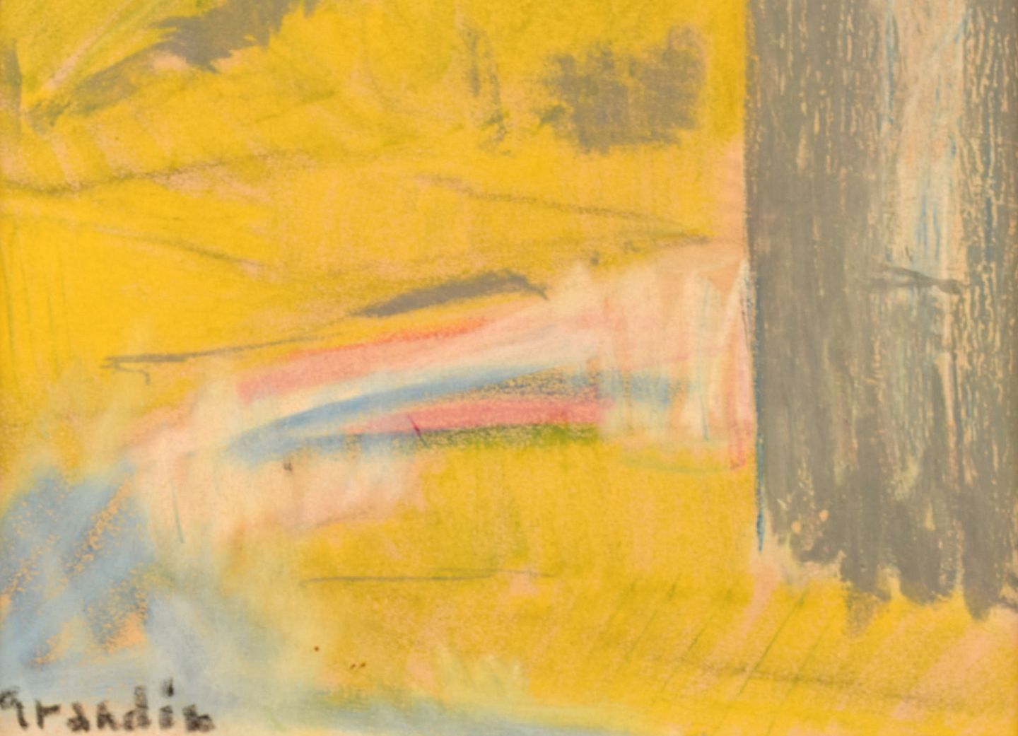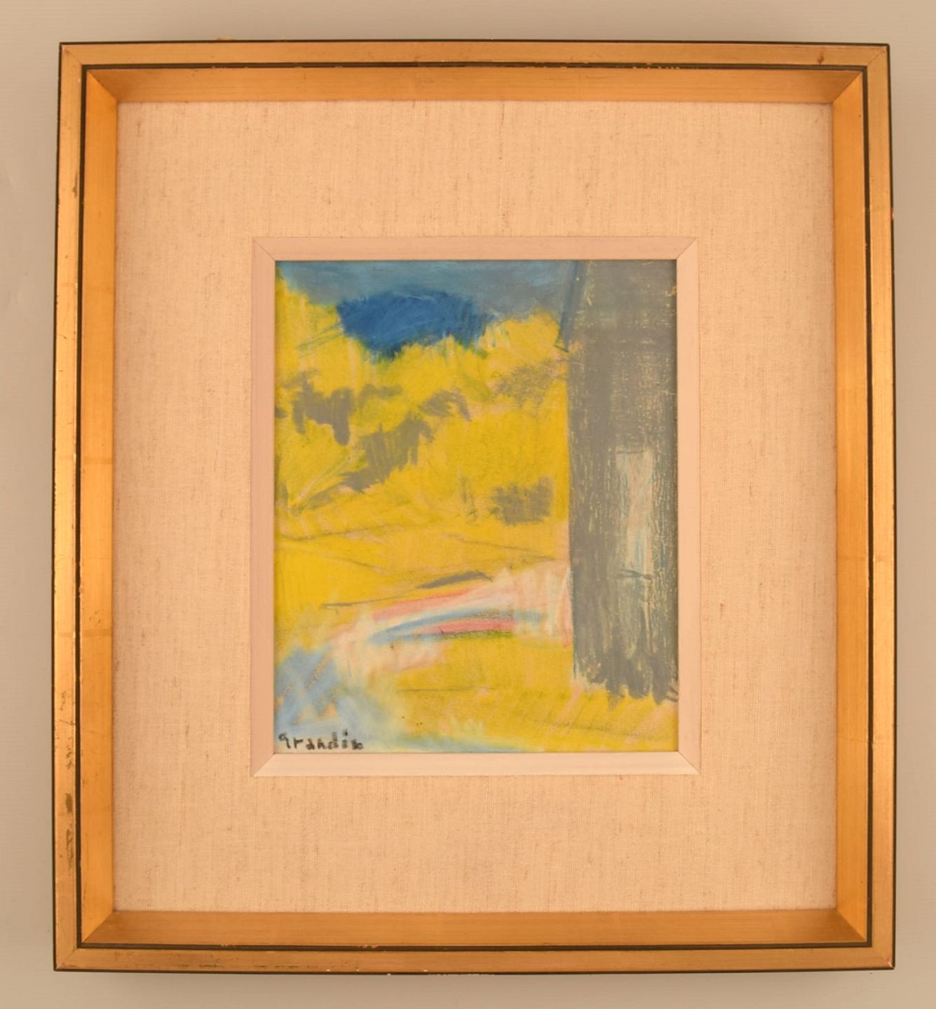 Svän Grandin (1906-1982), svensk kunstner. Olie på plade. Modernistisk landskab. Midt 1900-tallet. Lysmål: 21,5 x 17 cm. Totalmål: 35,5 x 31,5 cm. Rammen måler: 2,5 cm. I flot stand. Signeret.