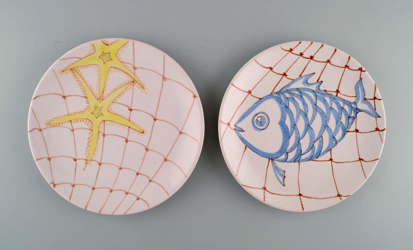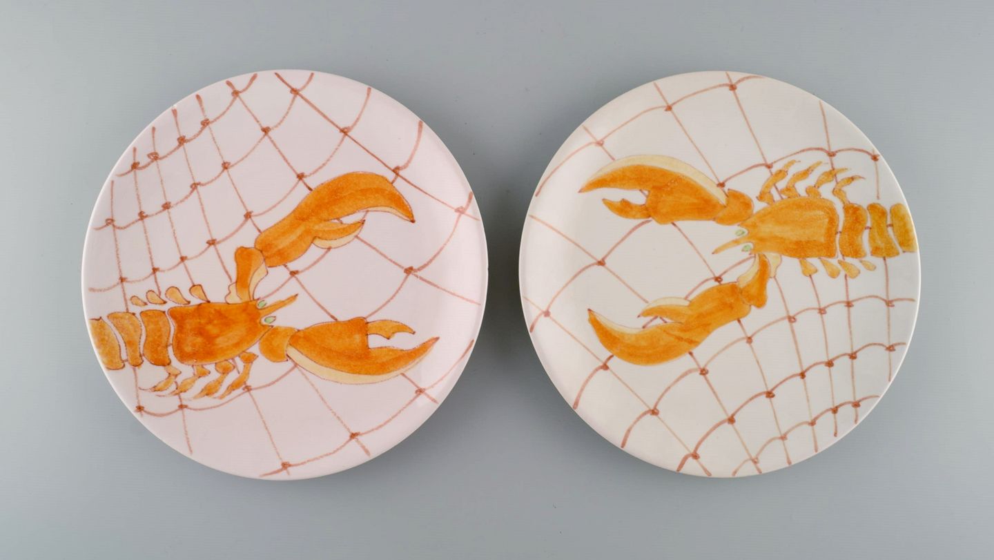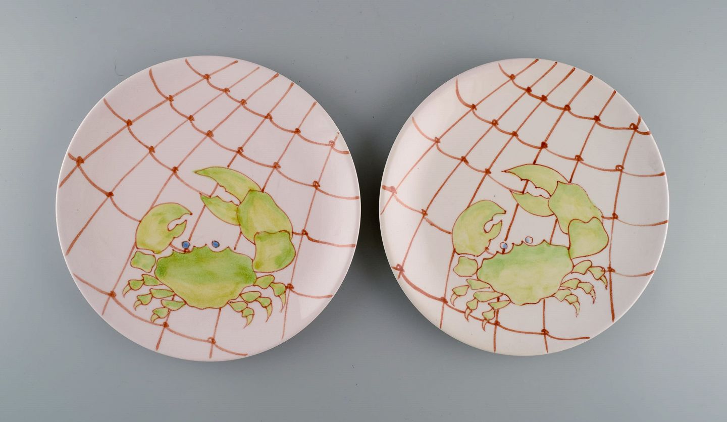 Ernestine, Salerno. Seks tallerkener i glaseret fajance med håndmalede fisk og skaldyr. Italiensk design. Dateret 1955. Diameter: 21,7 cm. I flot stand. Signeret.