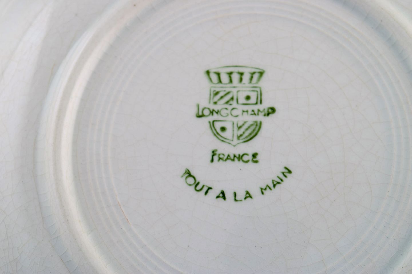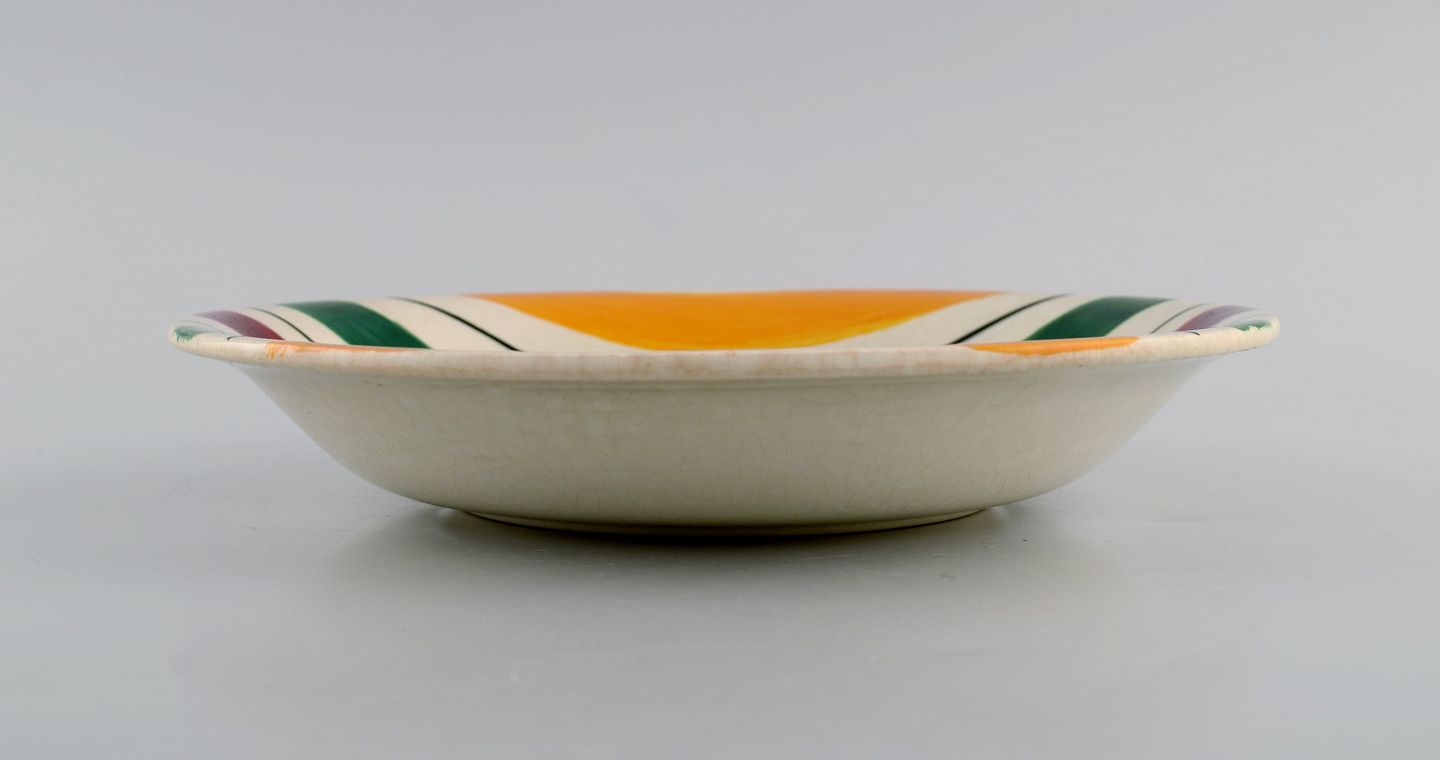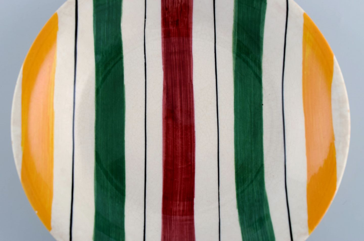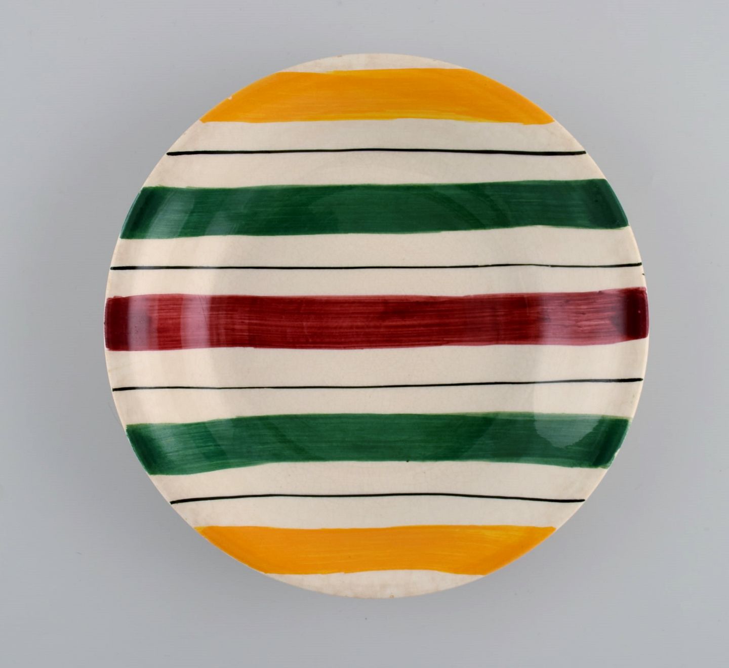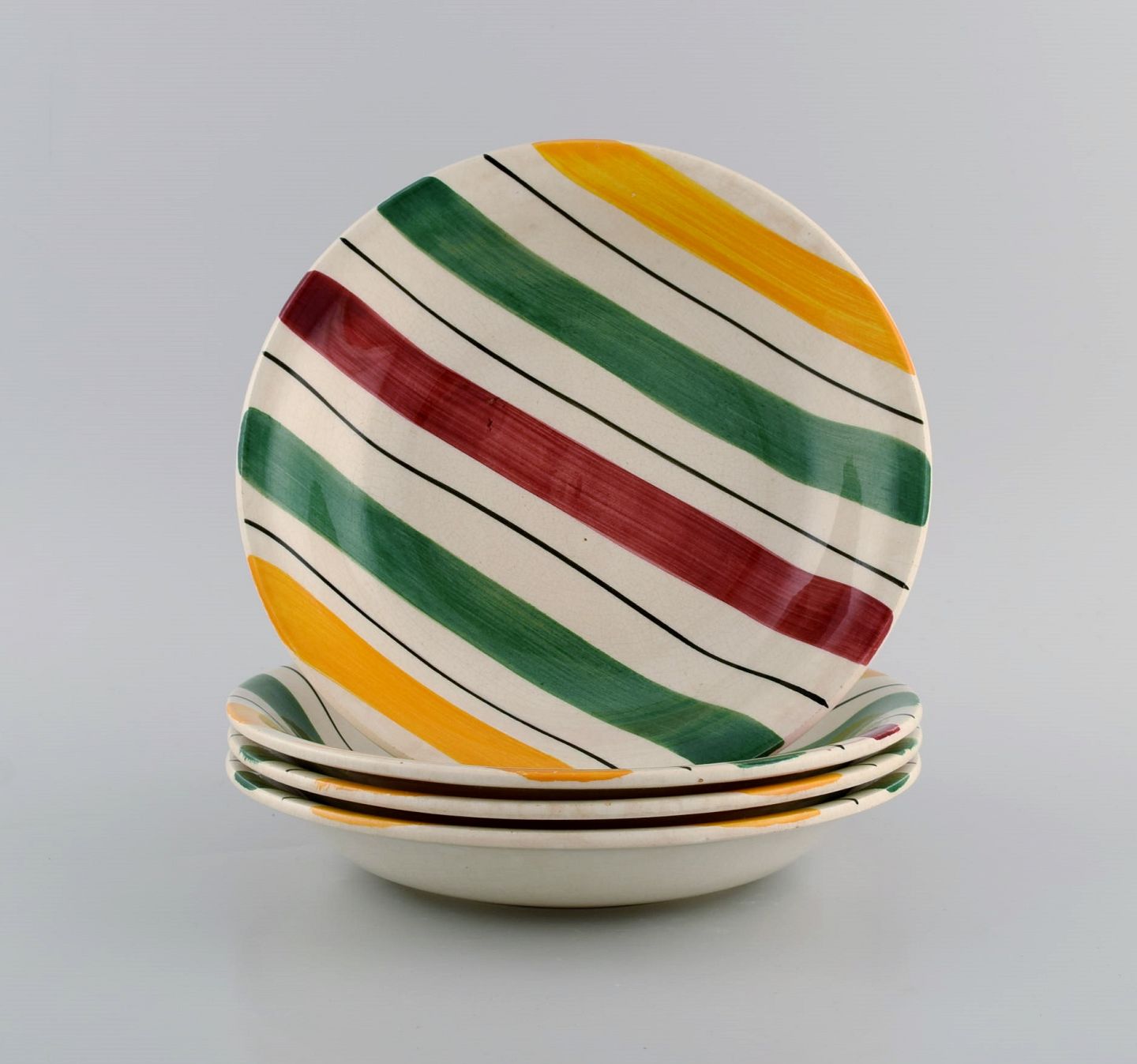 Longchamp, Frankrig. Fire dybe tallerkener i glaseret fajance med håndmalet stribet dekoration. Midt 1900-tallet. Måler: 20 x 3,5 cm. I flot stand. Stemplet.