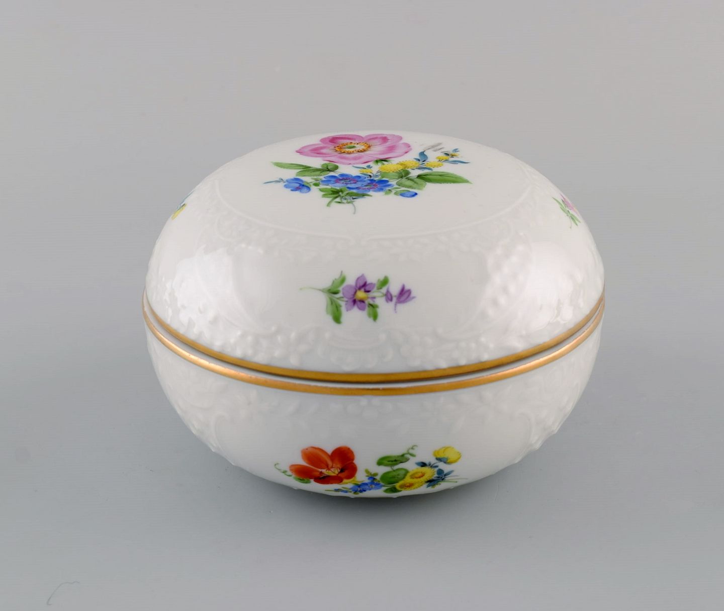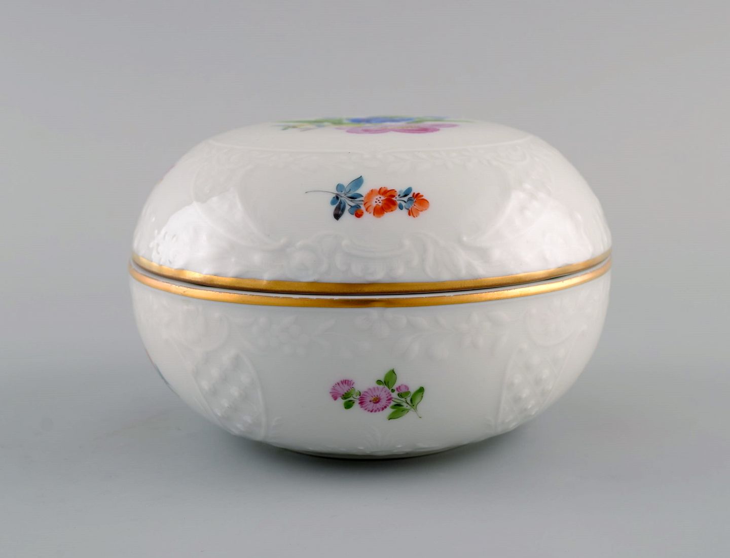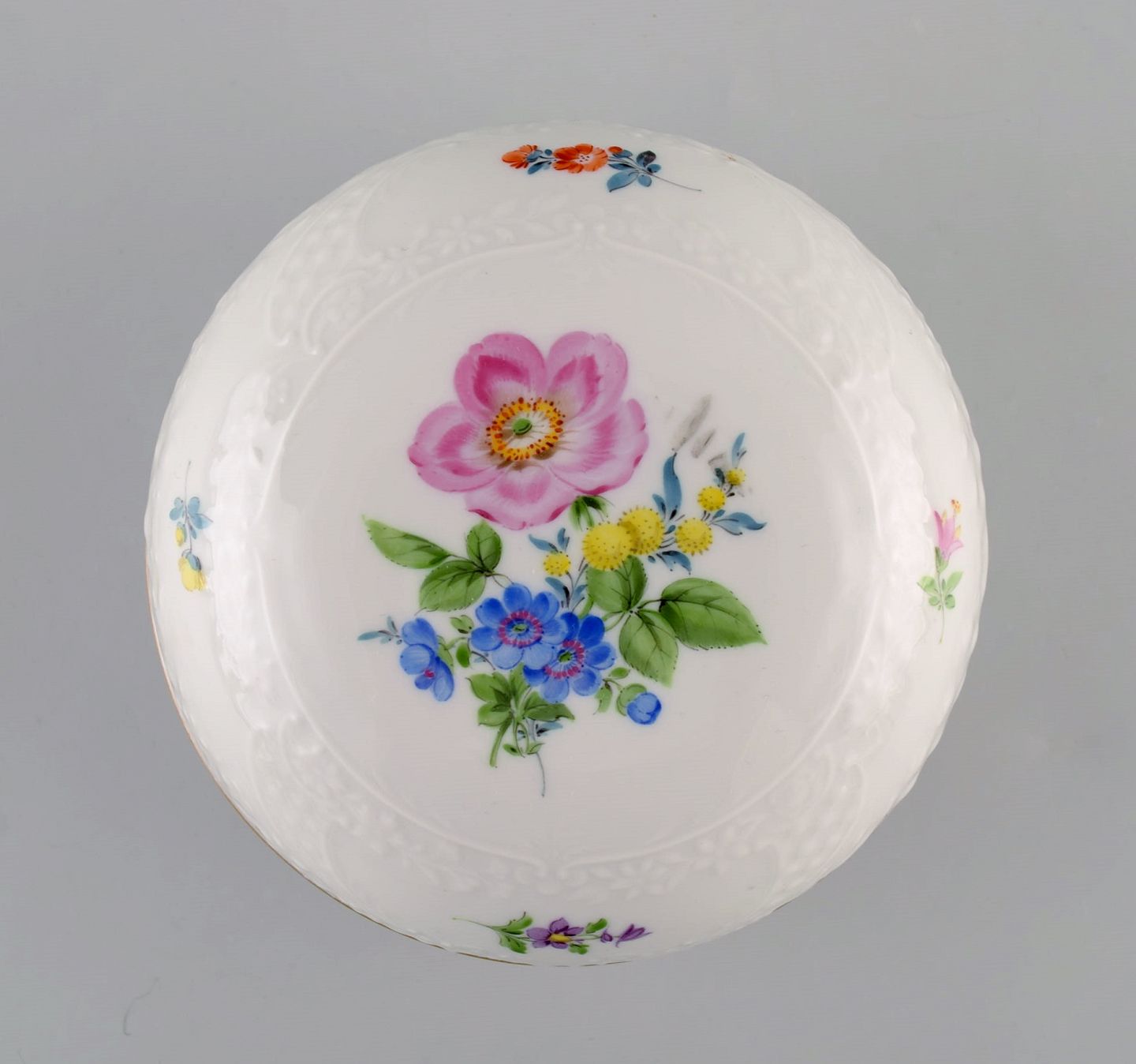 Antik Meissen lågskål i porcelæn med håndmalede blomster og guldkant. 1920/30'erne. Måler: 12,5 x 8 cm. I flot stand. Stemplet. 1. Sortering.