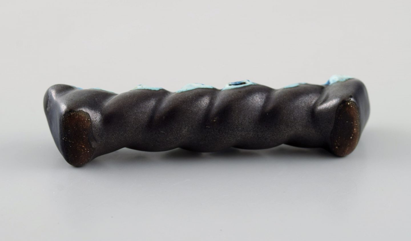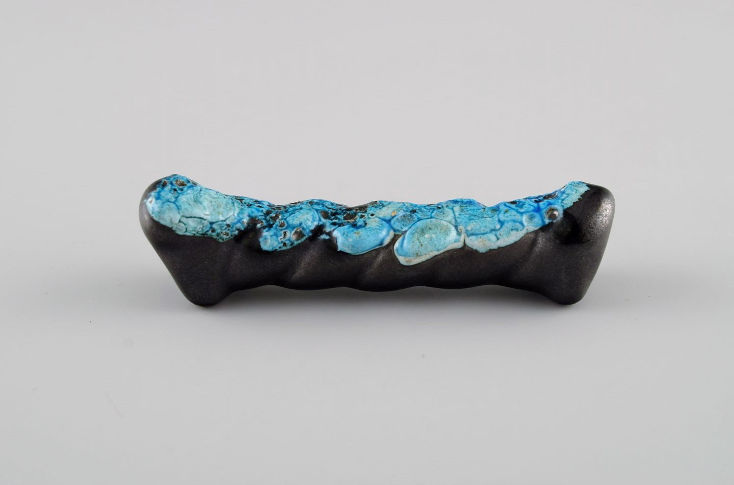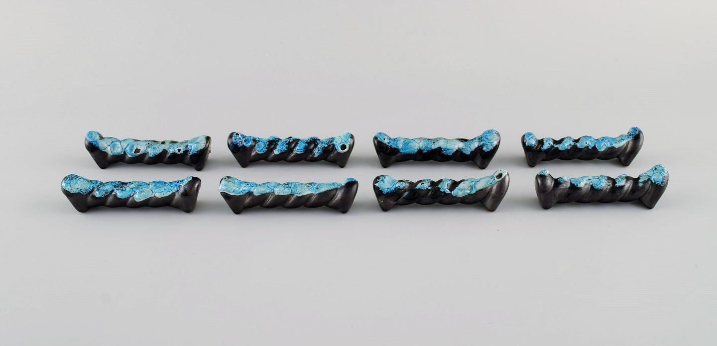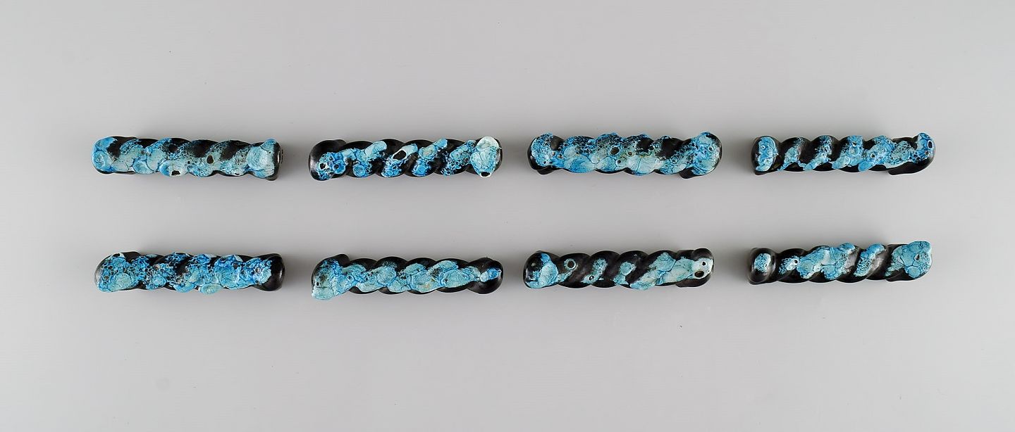 Fransk keramiker. Otte knivblokke i glaseret stentøj. Smuk glasur i azurblå nuancer. Unika keramik af høj kvalitet. Midt 1900-tallet. Måler: 8,5 x 2,5 cm. I flot stand.
