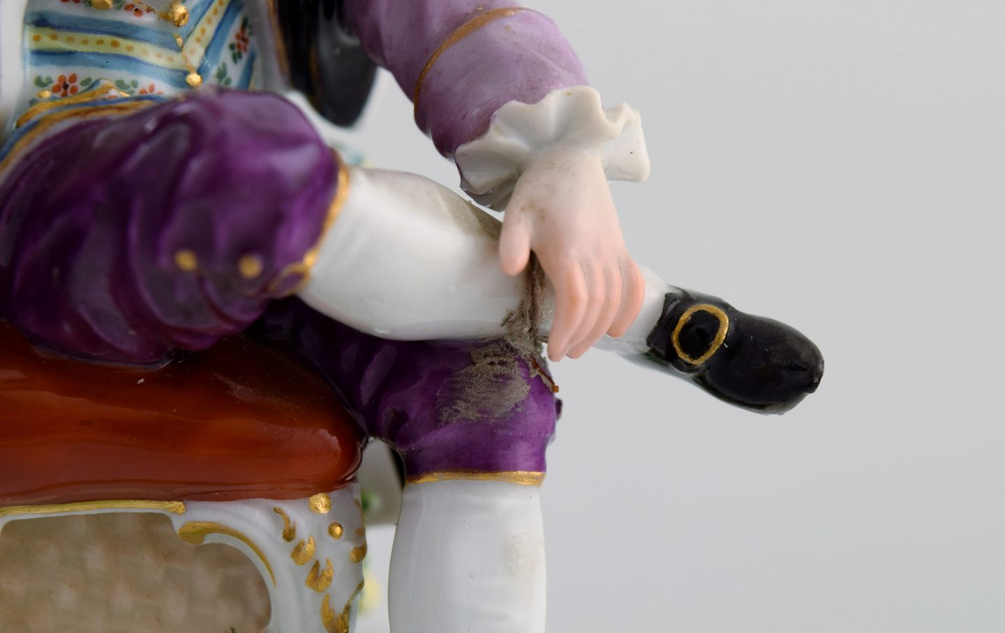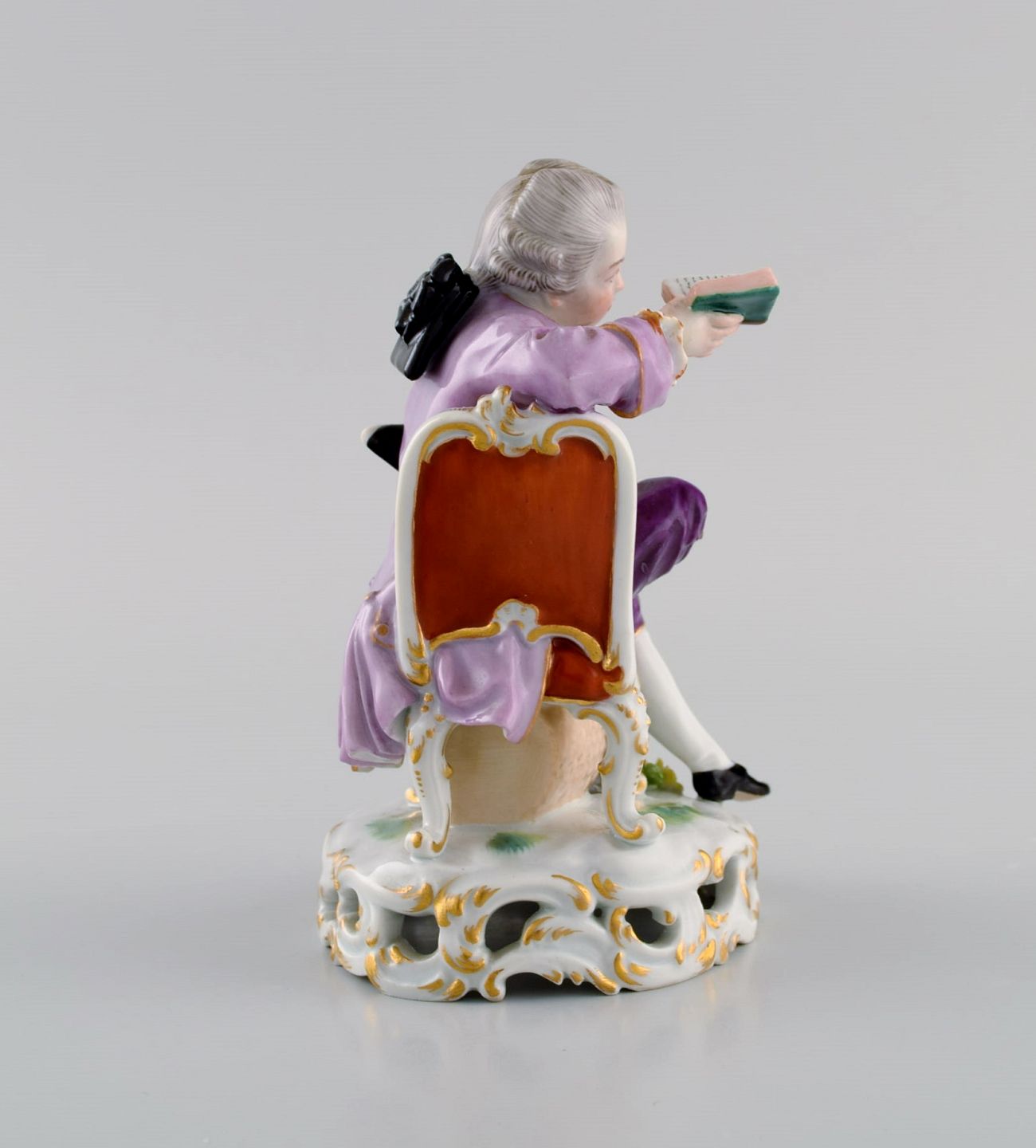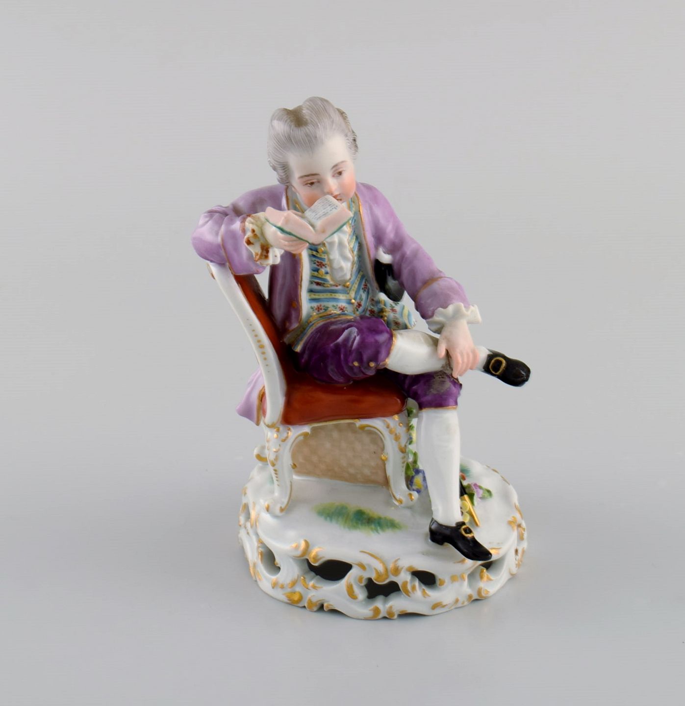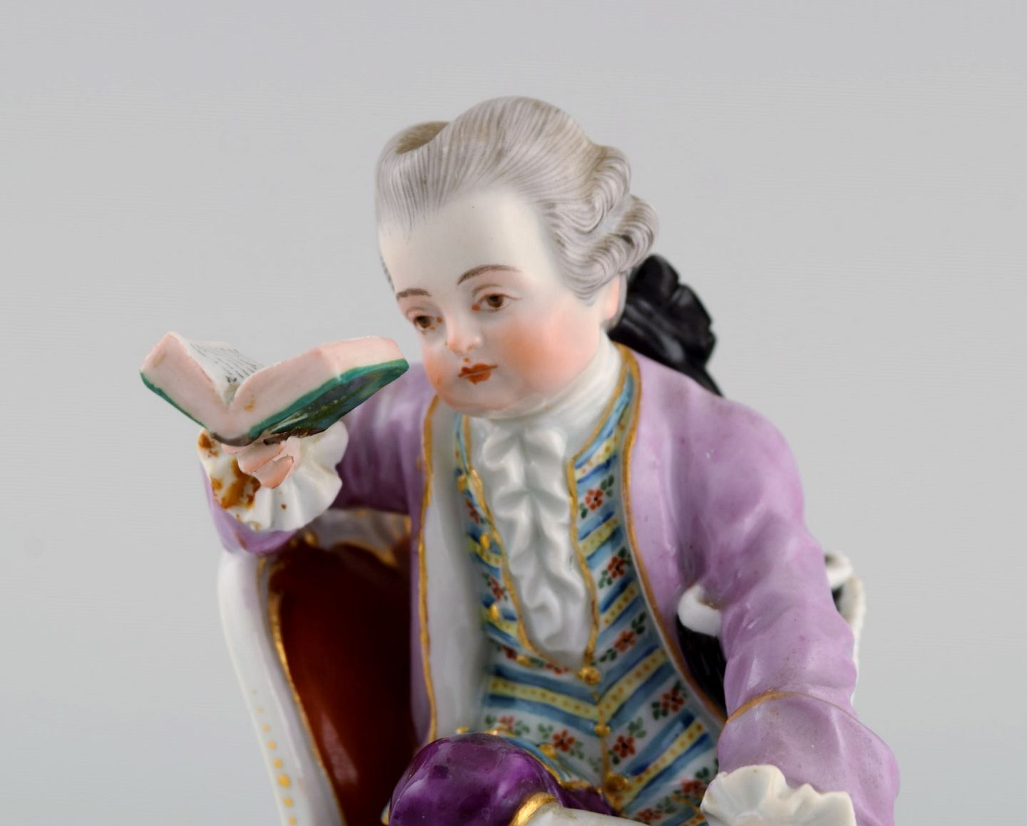 Meissen, Tyskland. Antik håndmalet porcelænsfigur. Adelig dreng med bog. Ca. 1900. Måler: 13 x 8,5 cm. I flot stand. Fod restaureret. Stemplet. 1. Sortering.