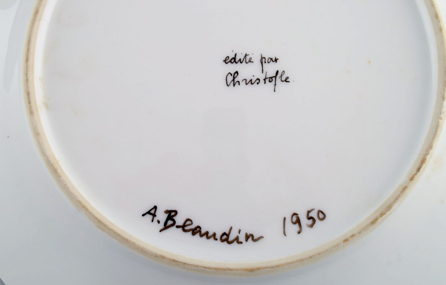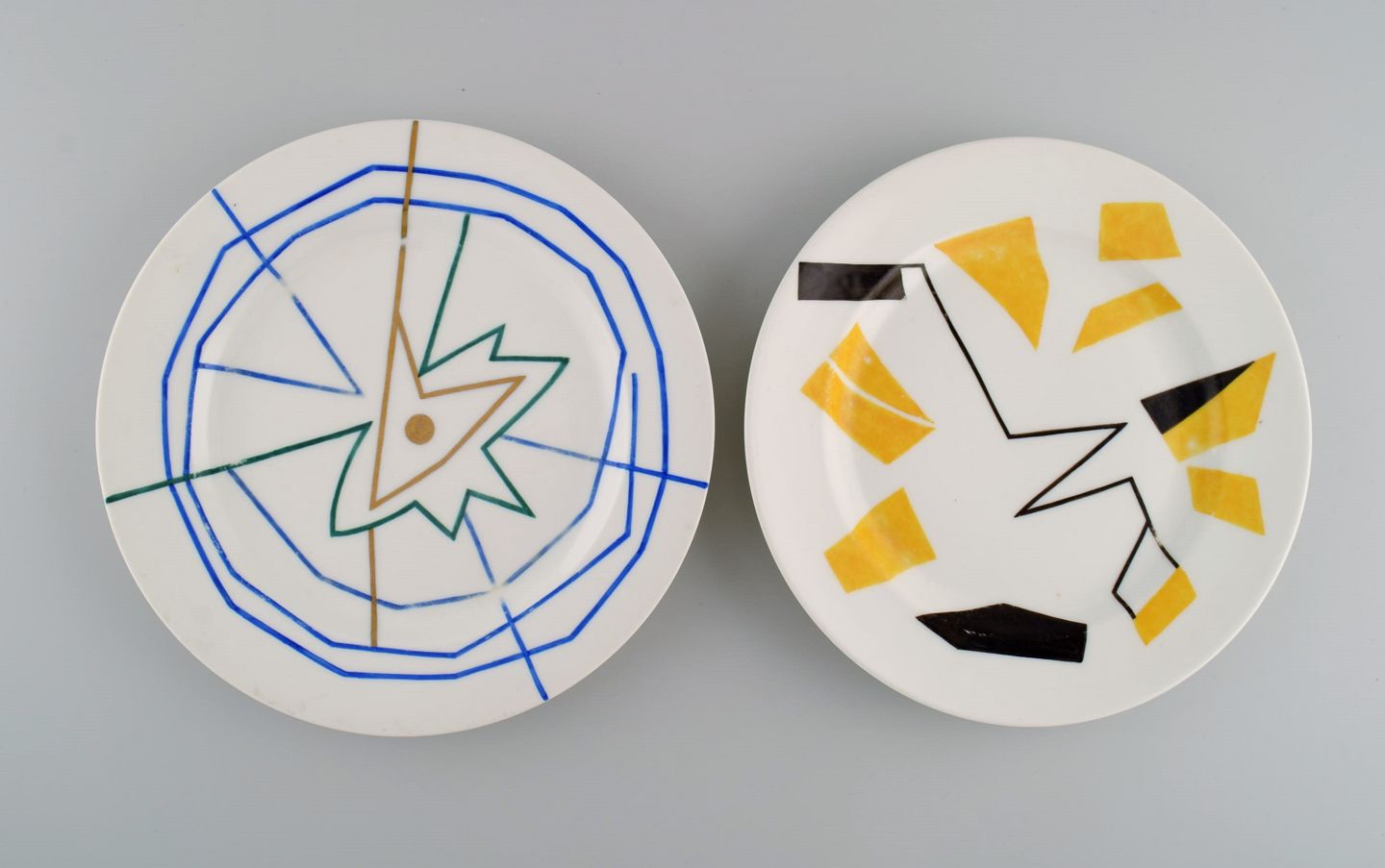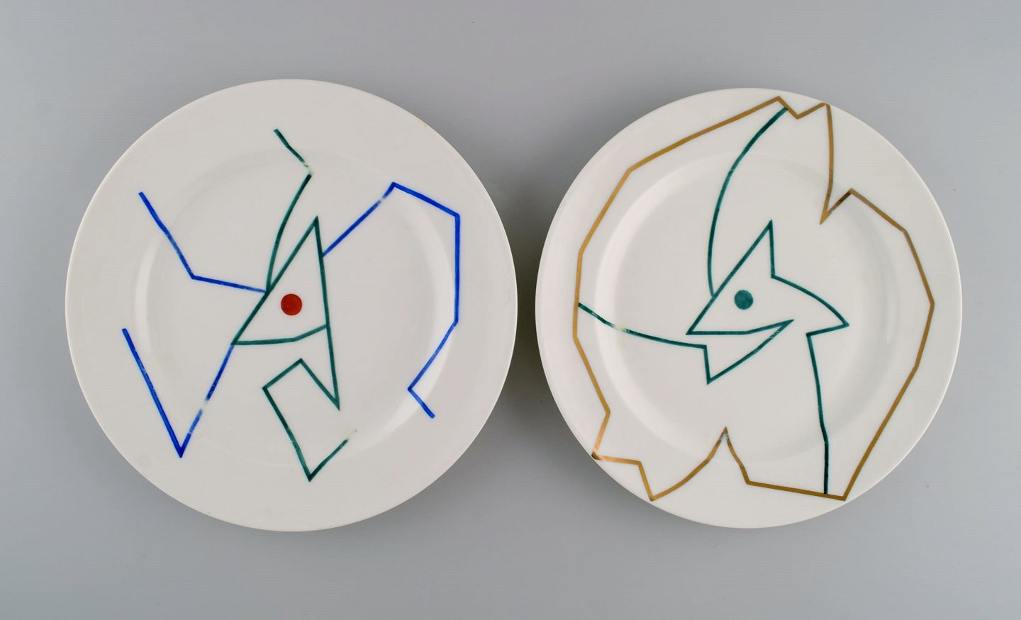 A. Beaudin for Christofle. Fire middagstallerkener i håndmalet porcelæn. Kubistisk stil. Frankrig. Dateret 1950. Diameter: 24,5 cm. I flot stand. Signeret og dateret.
