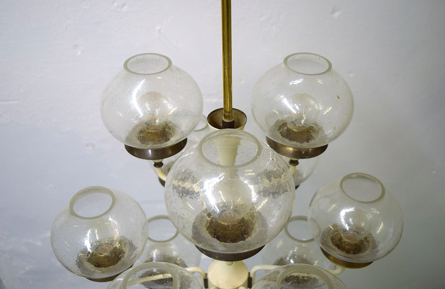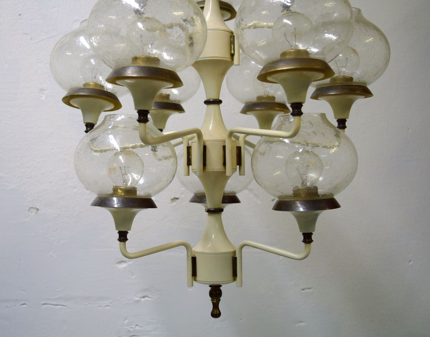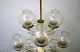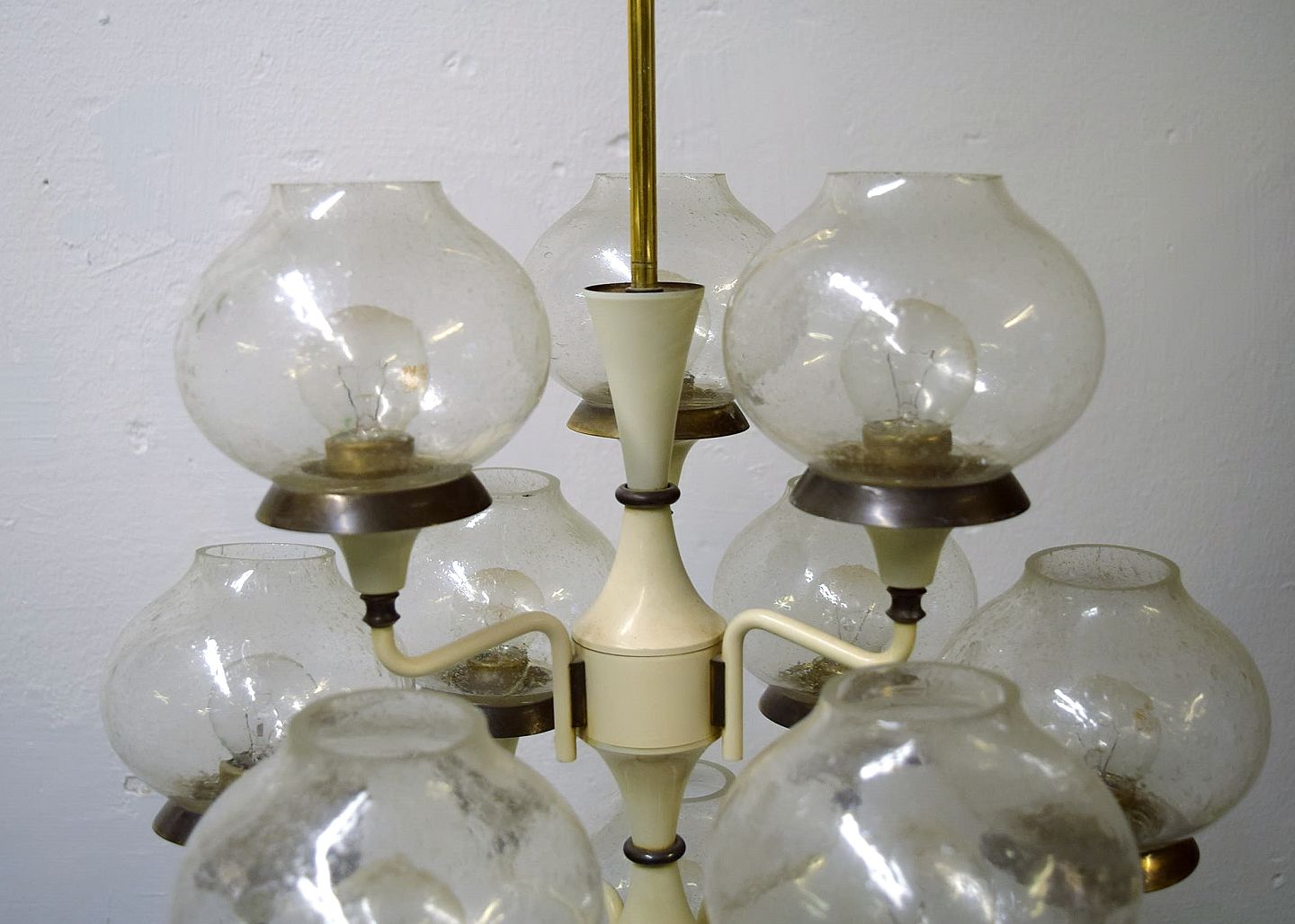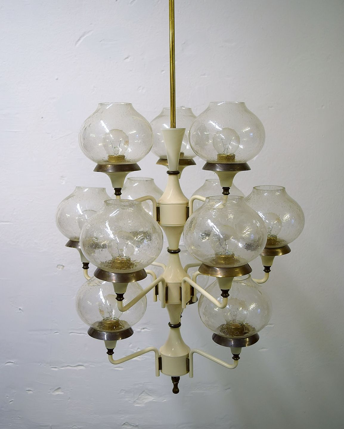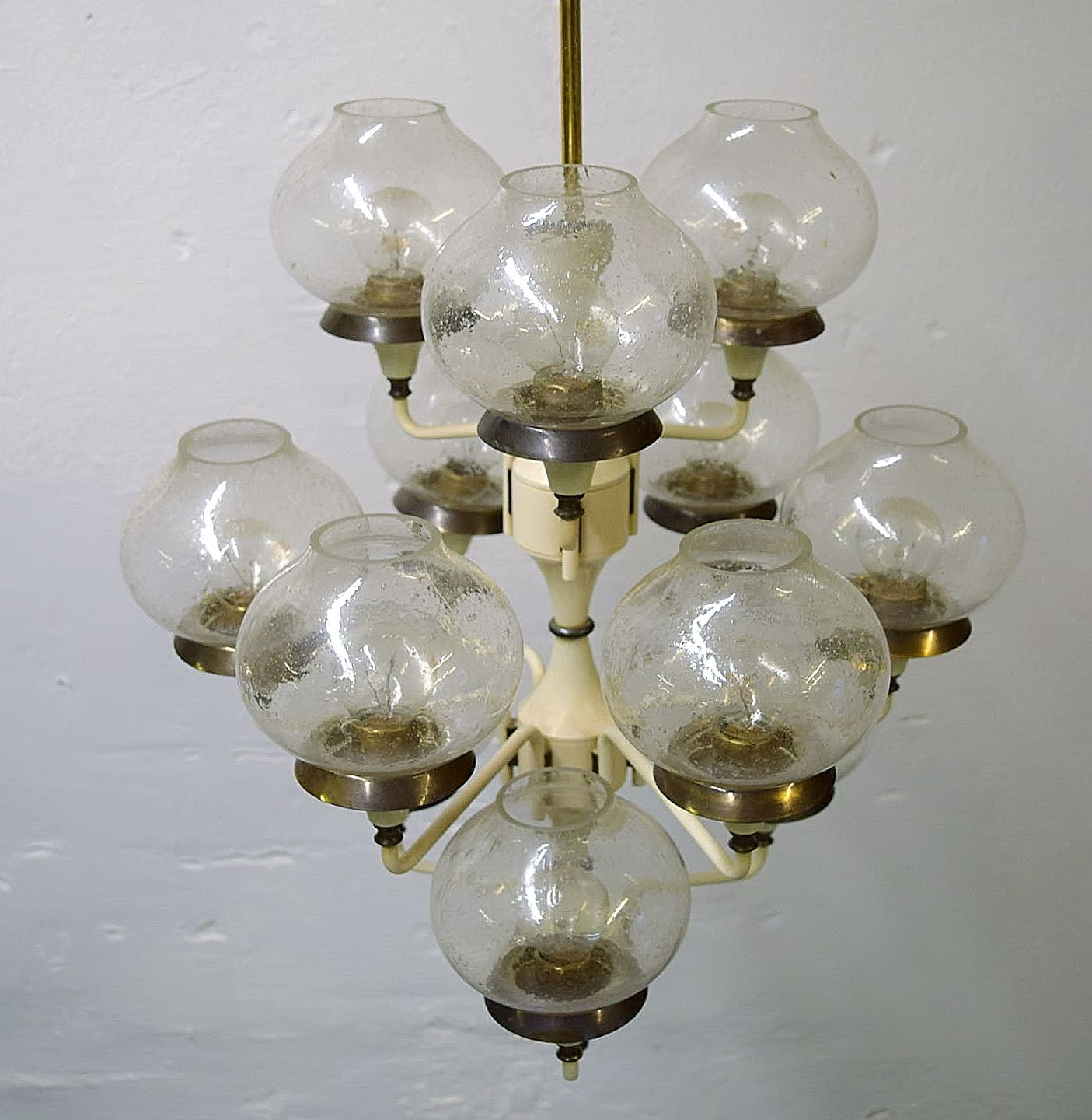 Hans Agne Jakobsson for A/B Markaryd. Stor imponerende lysekrone / loftlampe. Stel i delvist lakeret messing med 11 skærme i mundblæst kunstglas. 1960'erne.