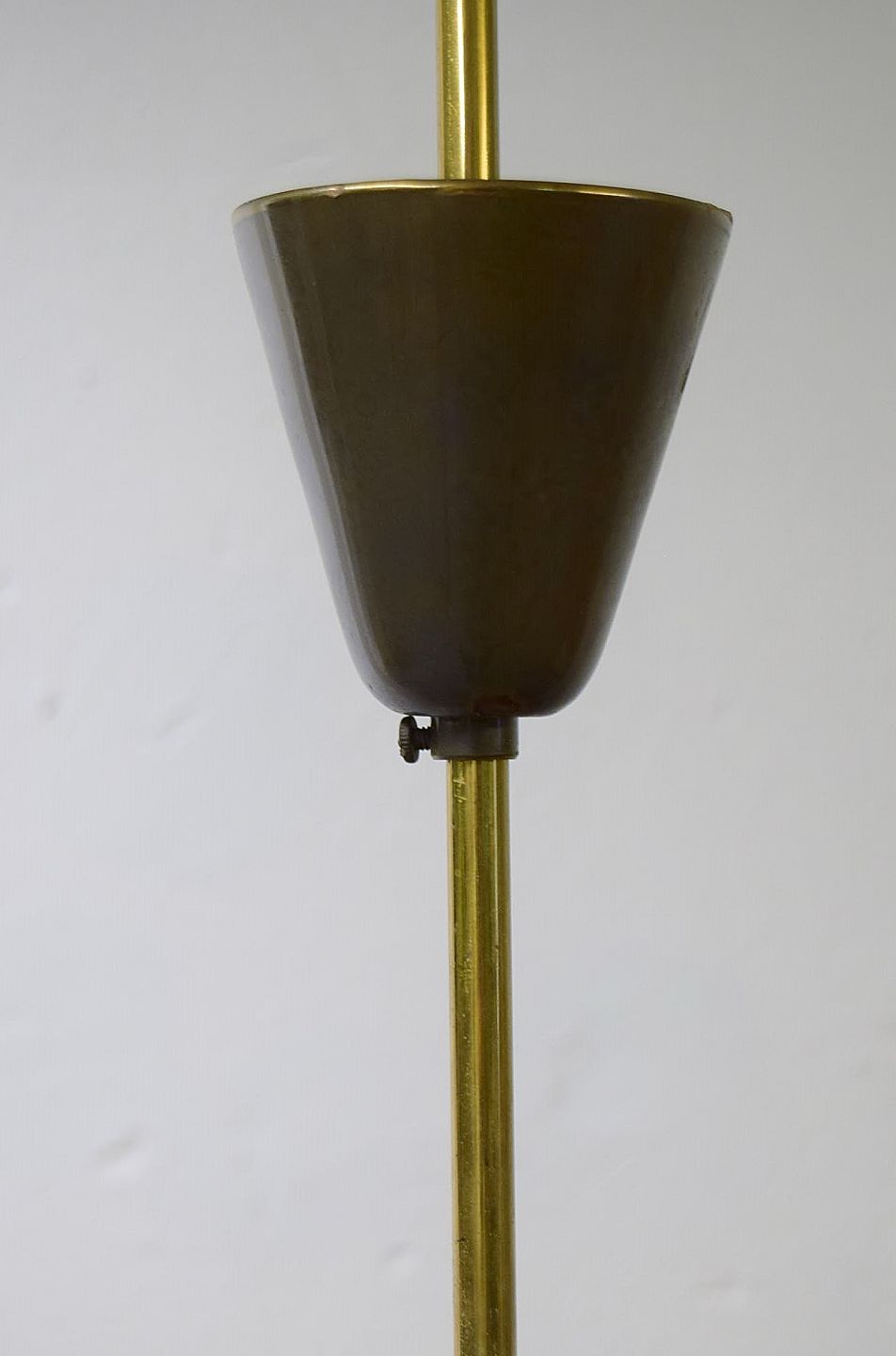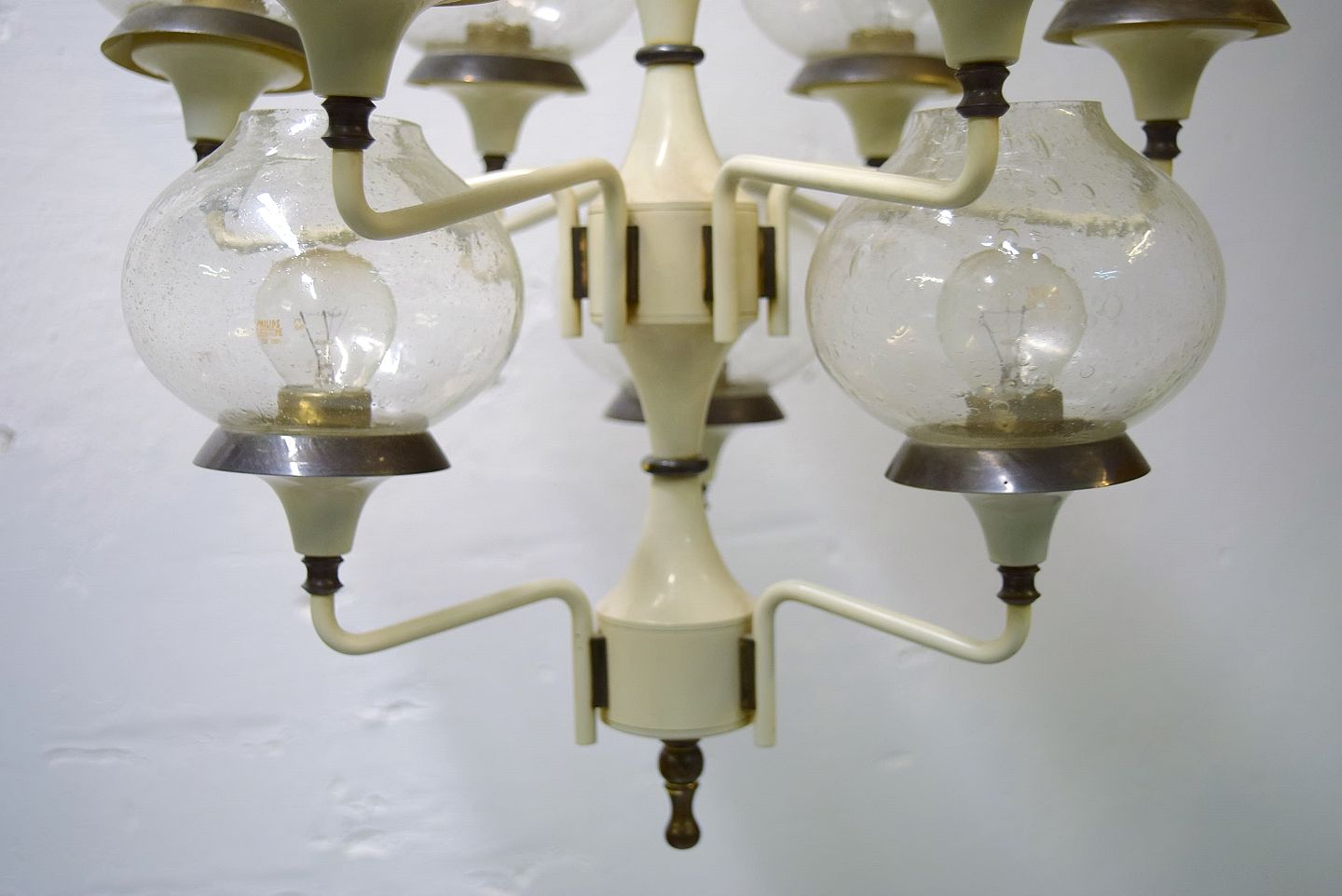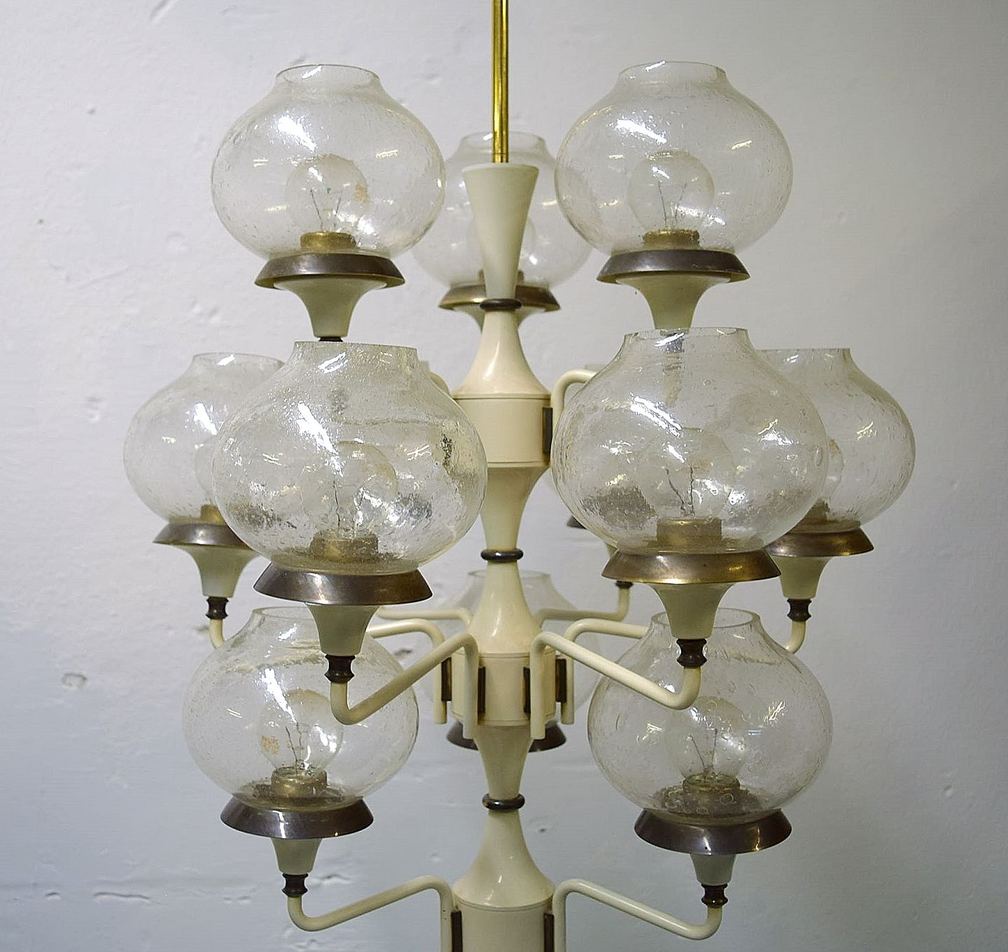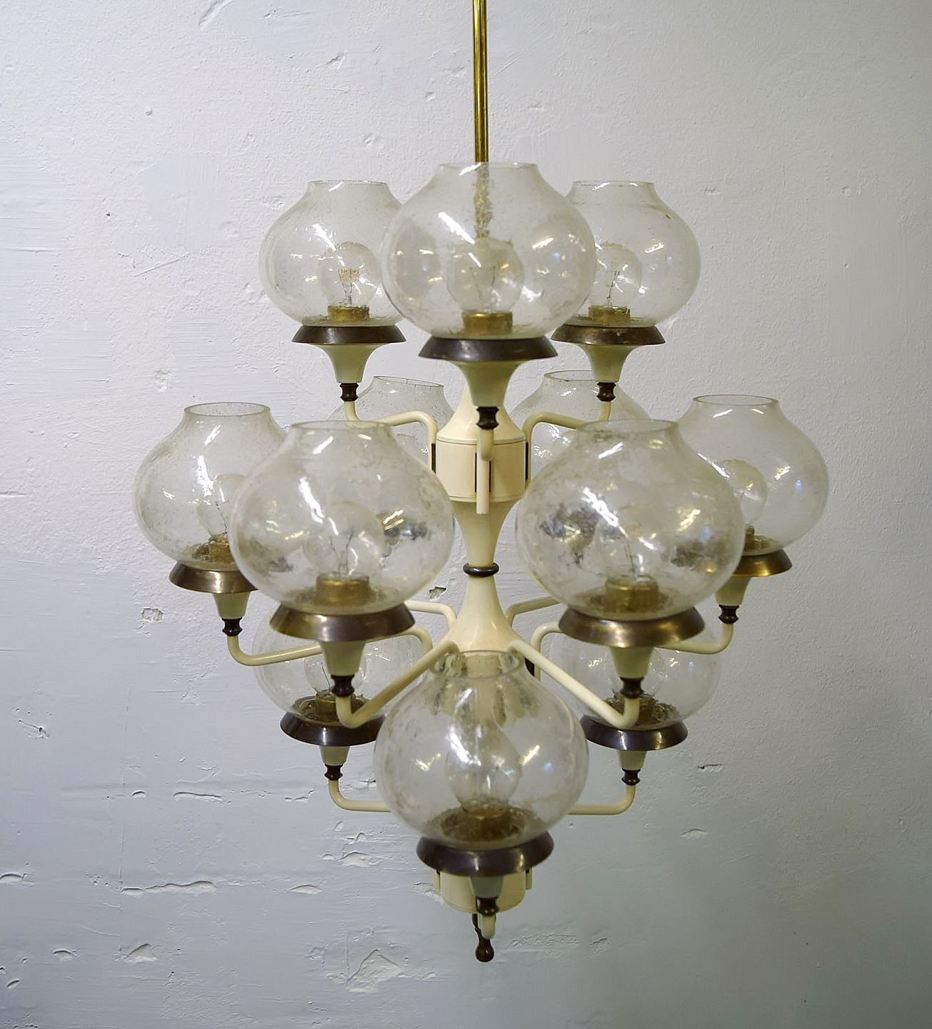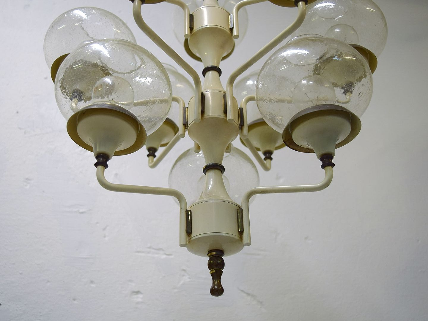Hans Agne Jakobsson for A/B Markaryd. Stor imponerende lysekrone / loftlampe. Stel i delvist lakeret messing med 11 skærme i mundblæst kunstglas. 1960'erne.