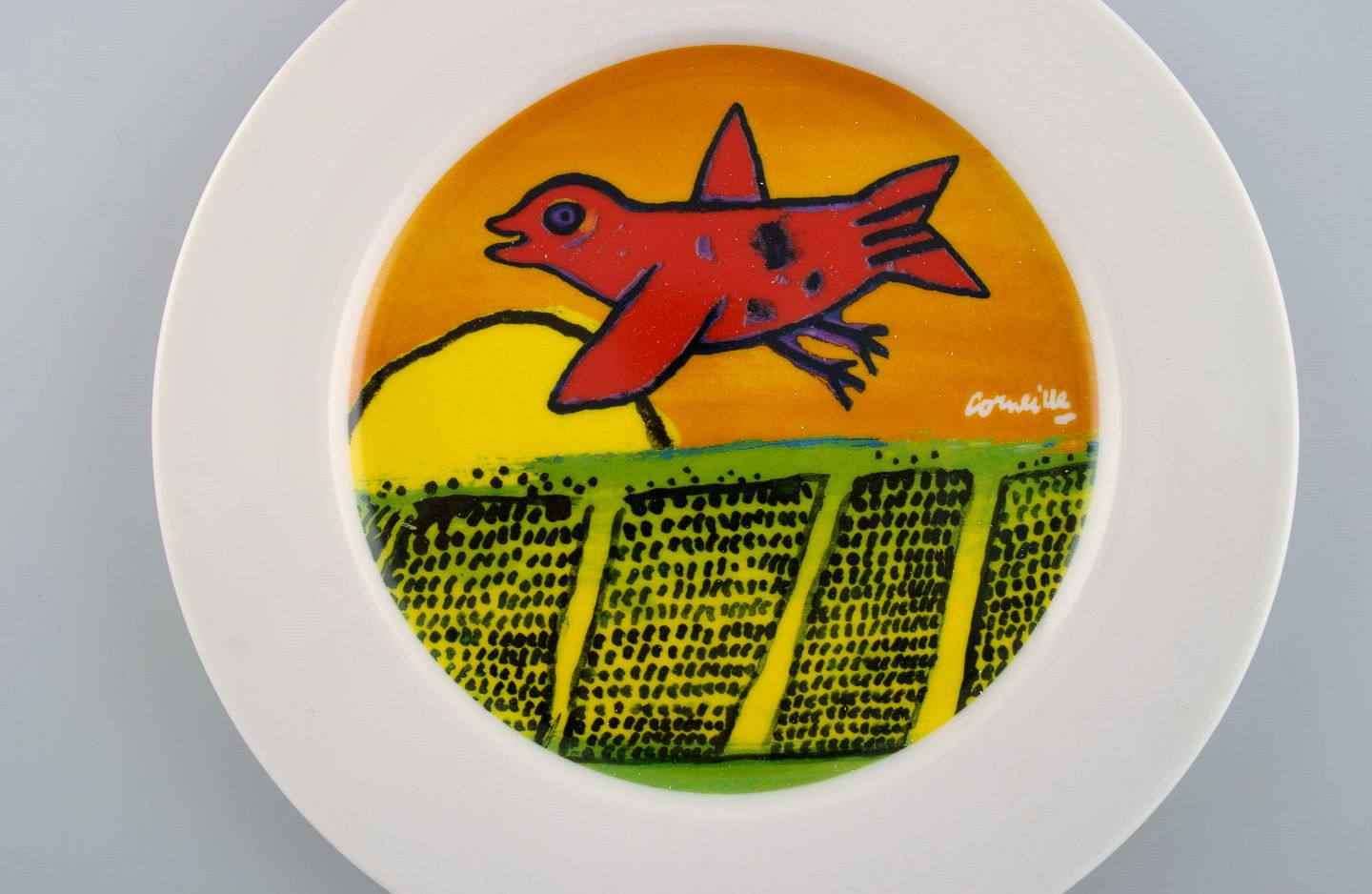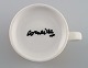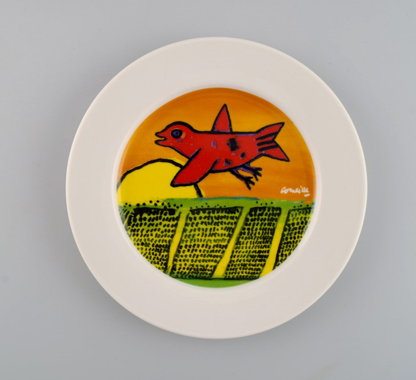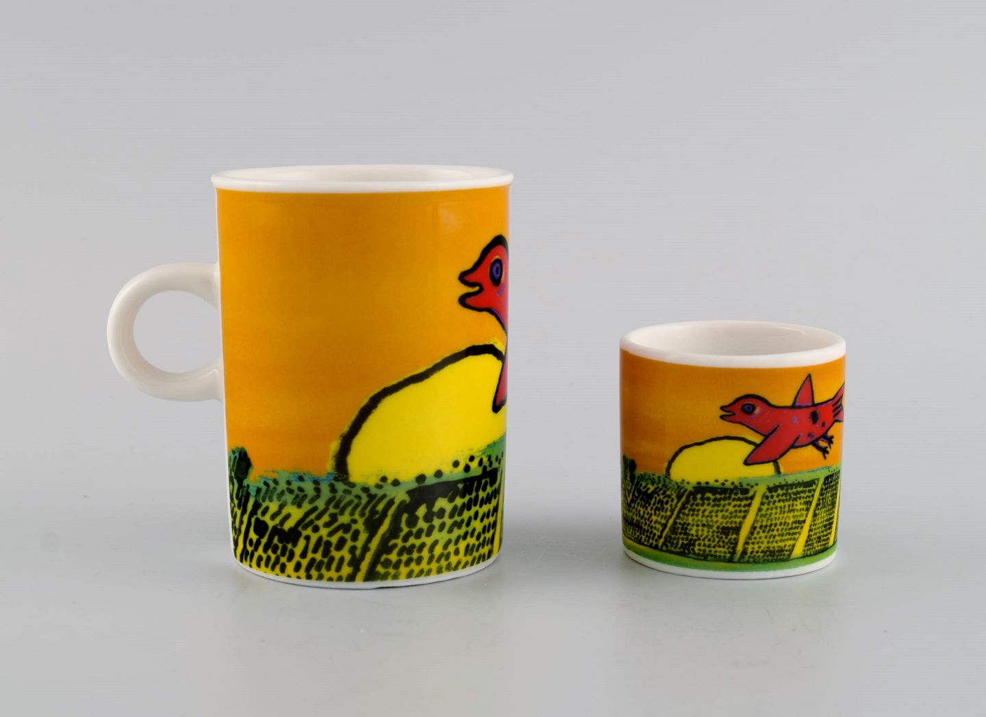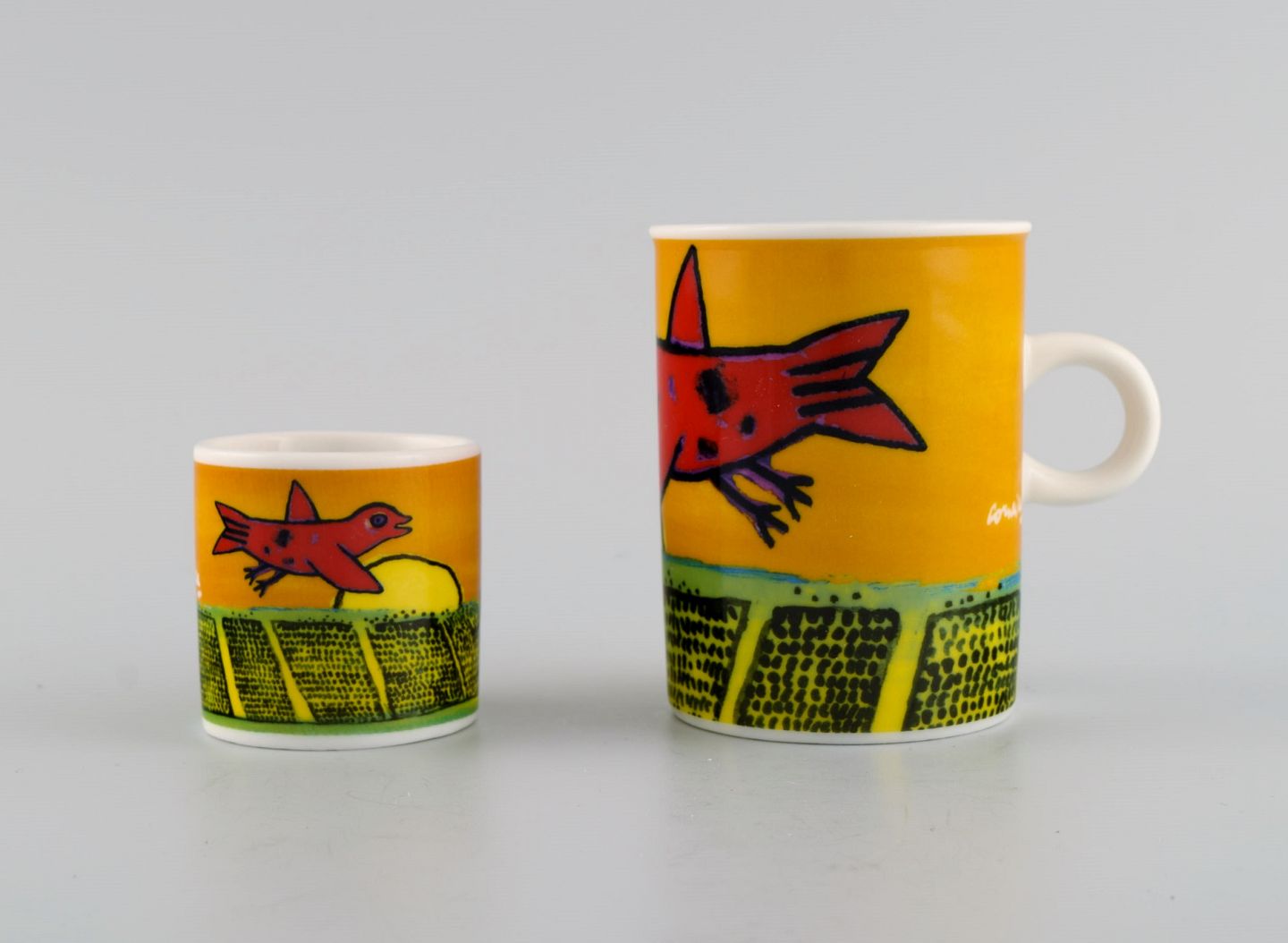 Corneille (Guillaume Cornelis van Beverloo), Hollandsk CoBrA kunstner (1922-2010). Kaffekop, tallerken og æggebæger i porcelæn dekoreret med fugle over mark med solopgang. 1980/90'erne.