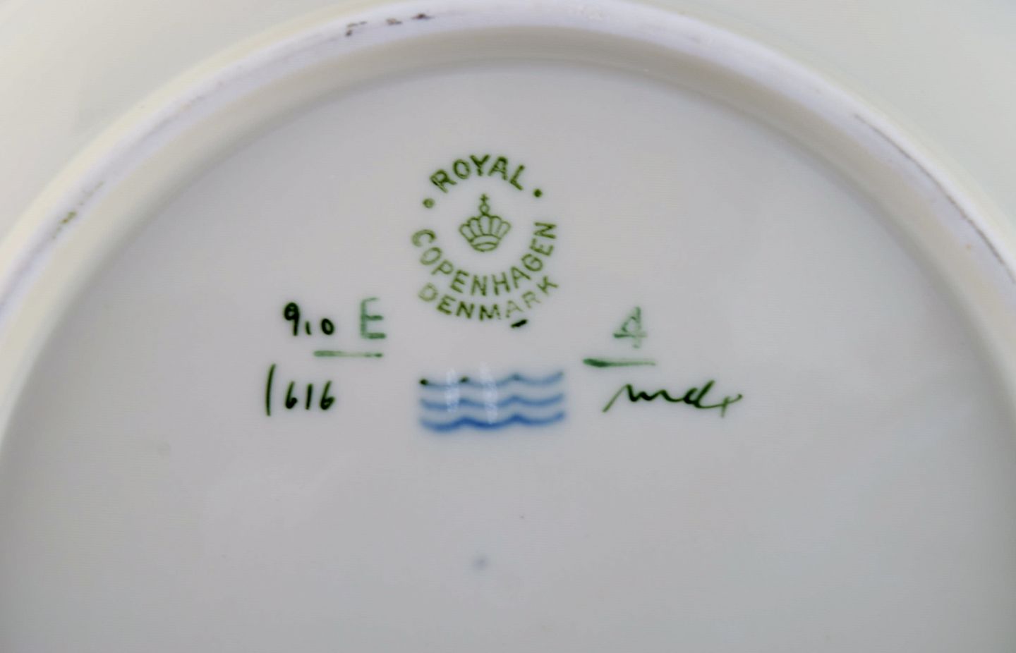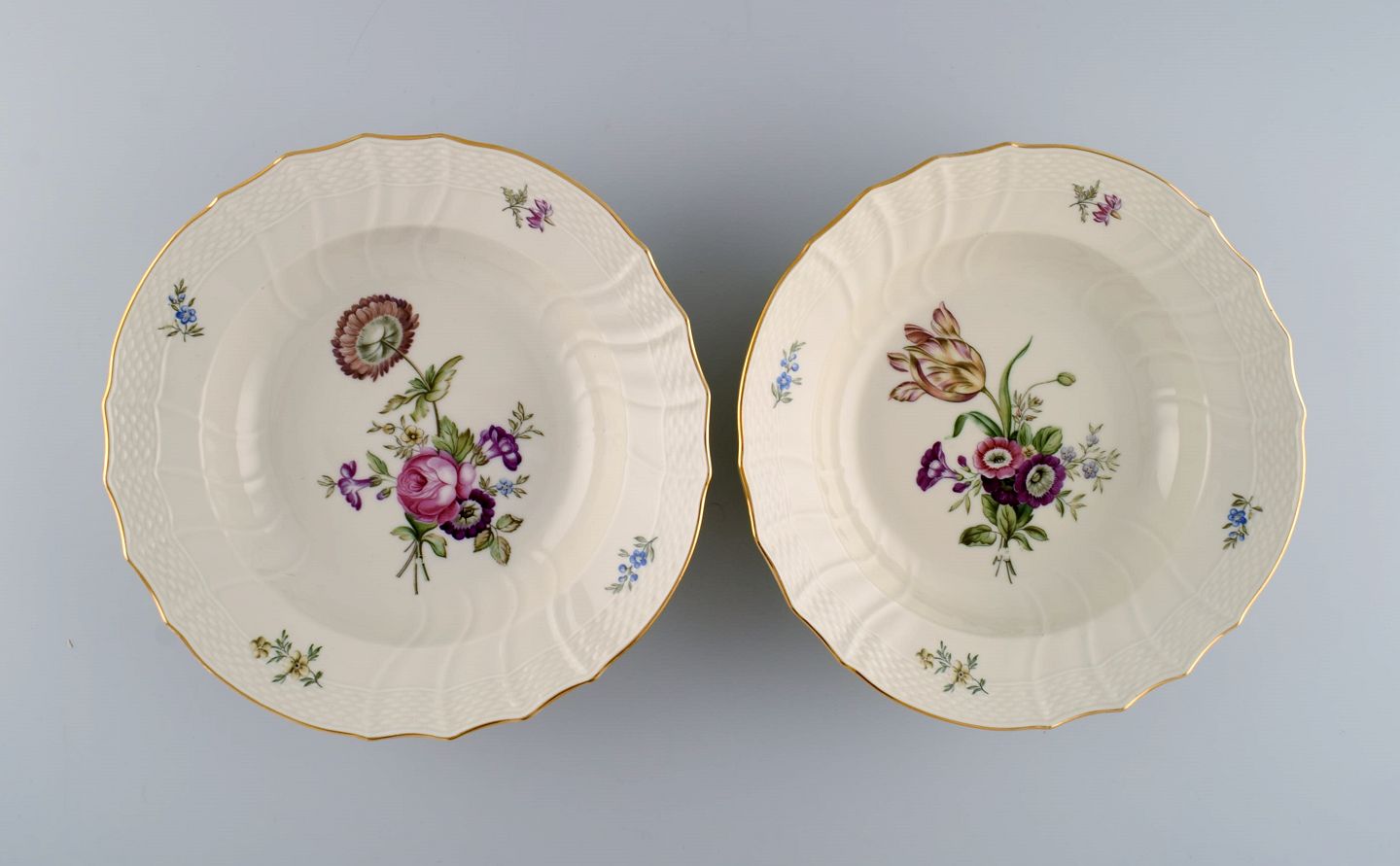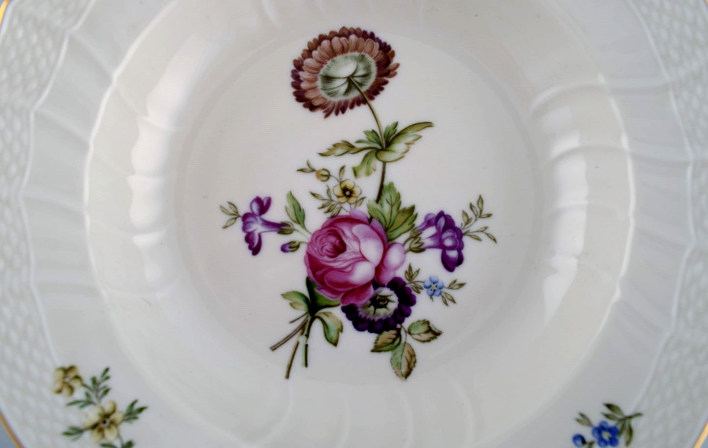 Seks Royal Copenhagen Frijsenborg dybe tallerkener i håndmalet porcelæn med blomster og guldkant. 1950'erne. Måler: 22 x 5 cm. I flot stand. Stemplet. 3. Sortering. Modelnummer 910/1616.