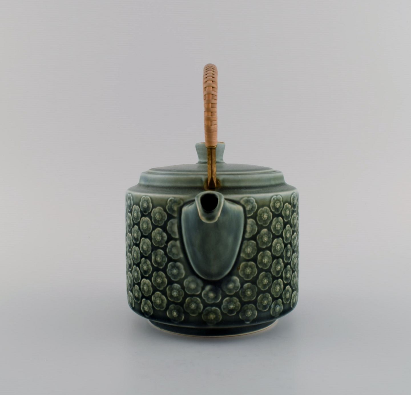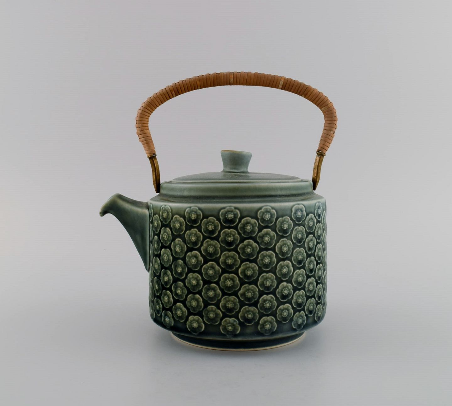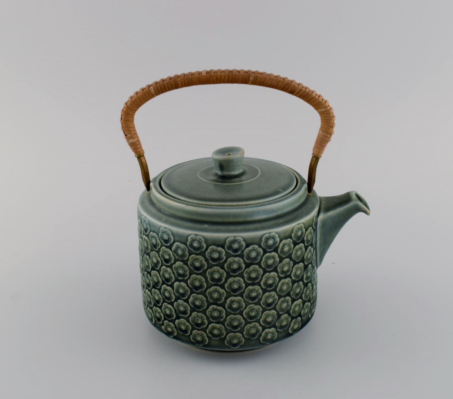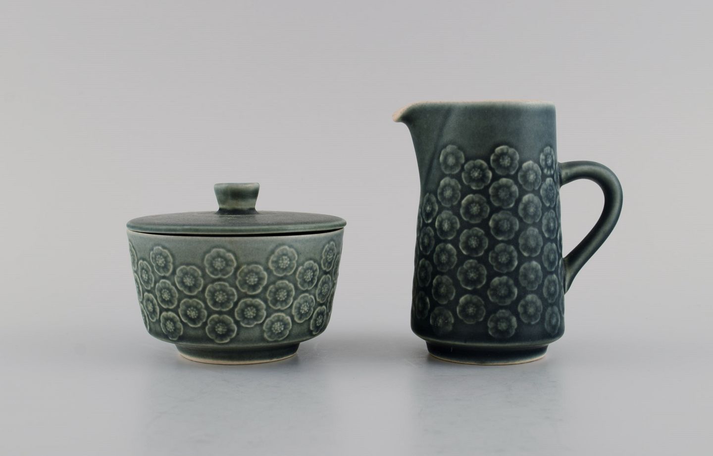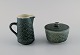Jens H. Quistgaard (1919-2008) for Nissen Kronjyden. Azur tekande med flettet hank, sukkerskål og flødekande i glaseret stentøj. 1960'erne.