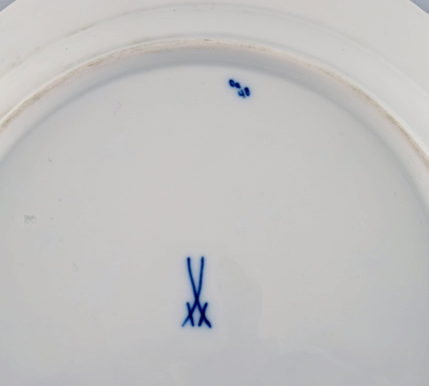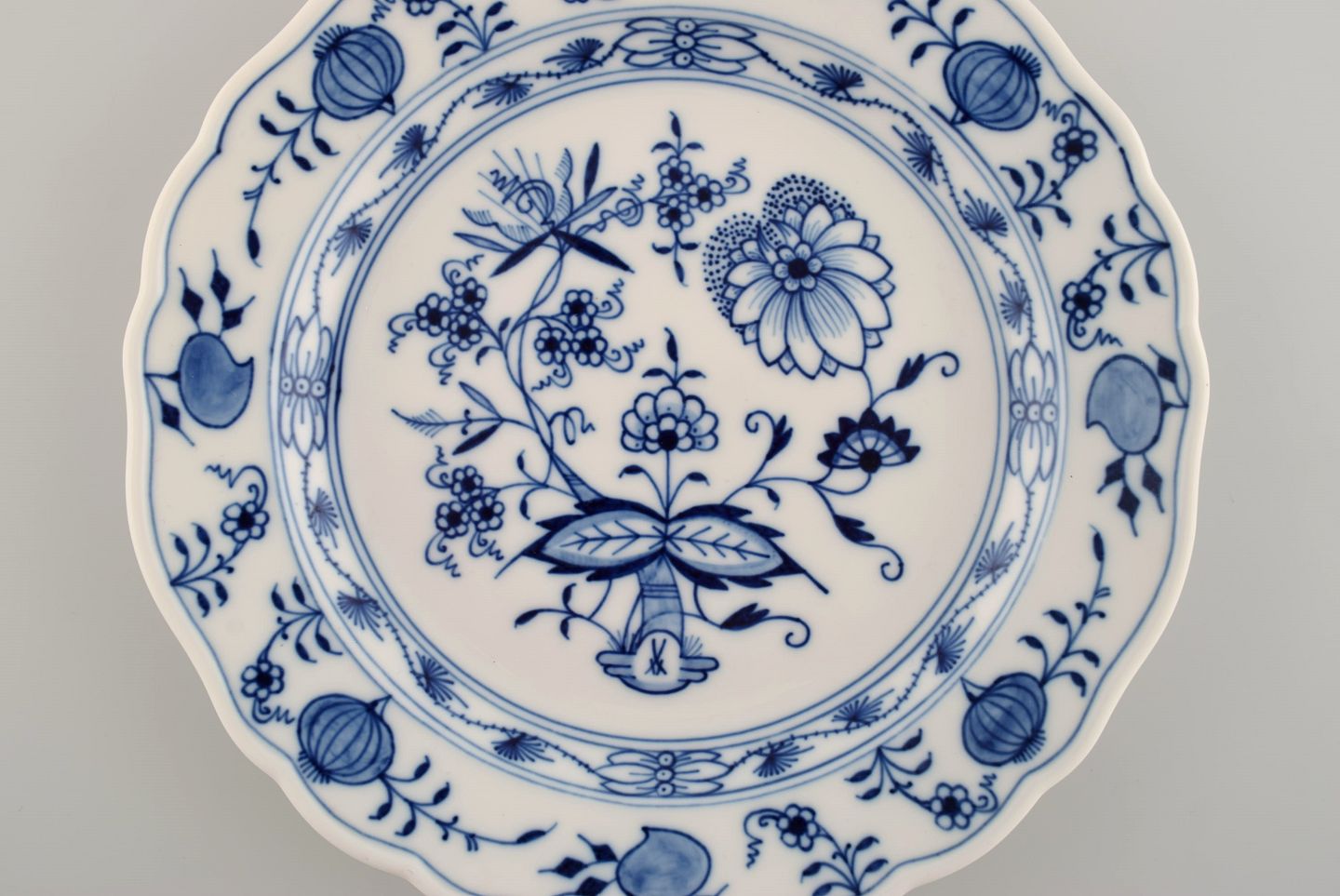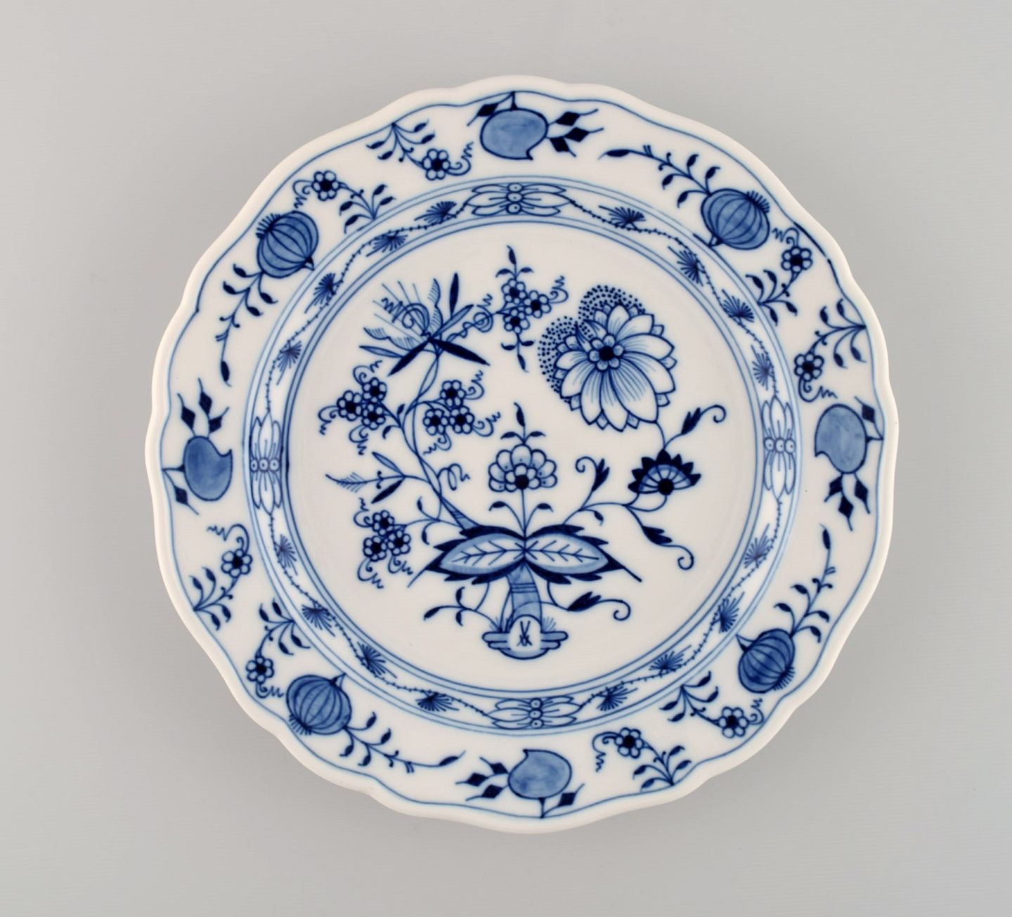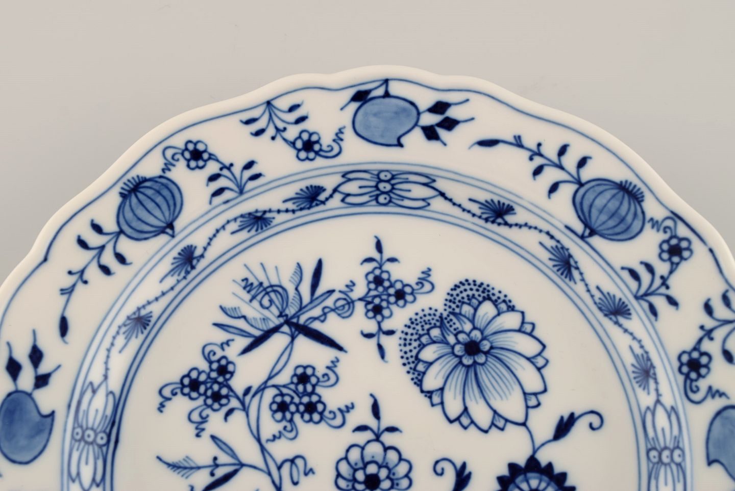 Fem antikke Meissen Løgmønstret frokosttallerkener i håndmalet porcelæn. Ca. 1900. Diameter: 22 cm. I flot stand. Stemplet. 1. Sortering.