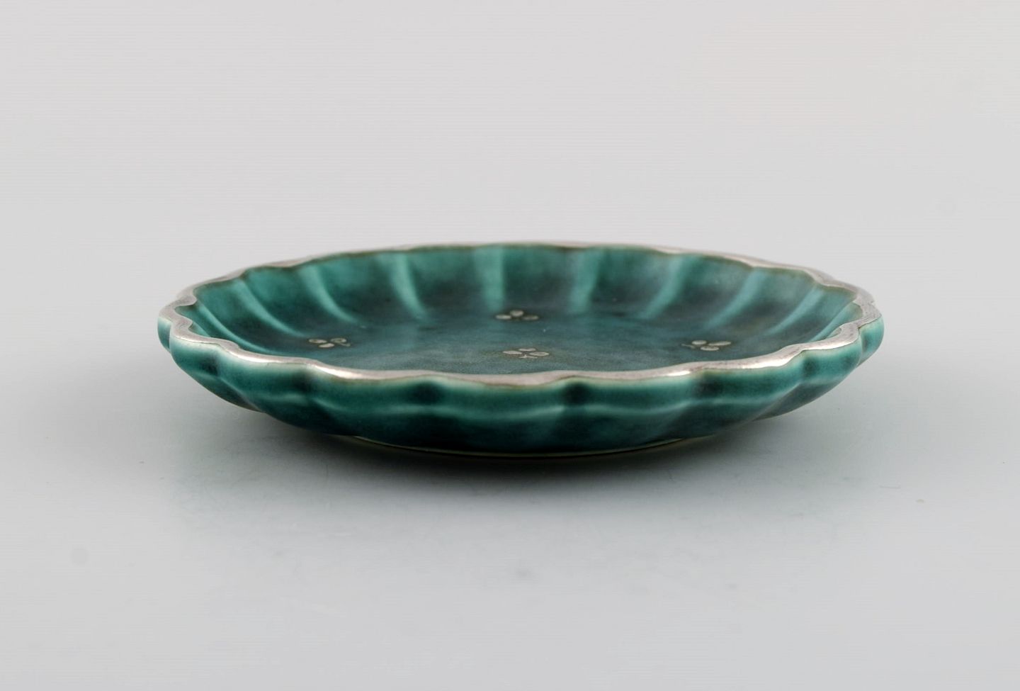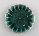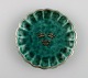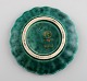Wilhelm Kåge (1889-1960) for Gustavsberg. Tre små Argenta fade i glaseret keramik. Smuk glasur i grønne nuancer med sølvindlæg i form af kroner og blade. Midt 1900-tallet.
