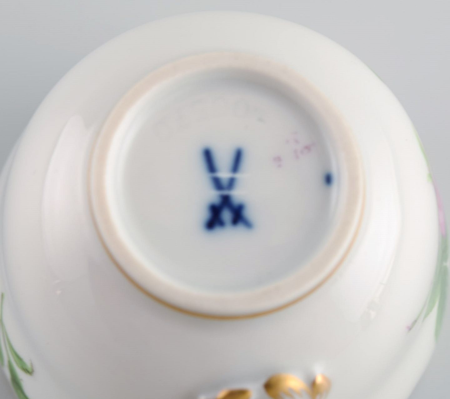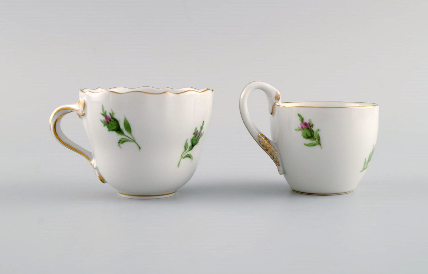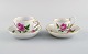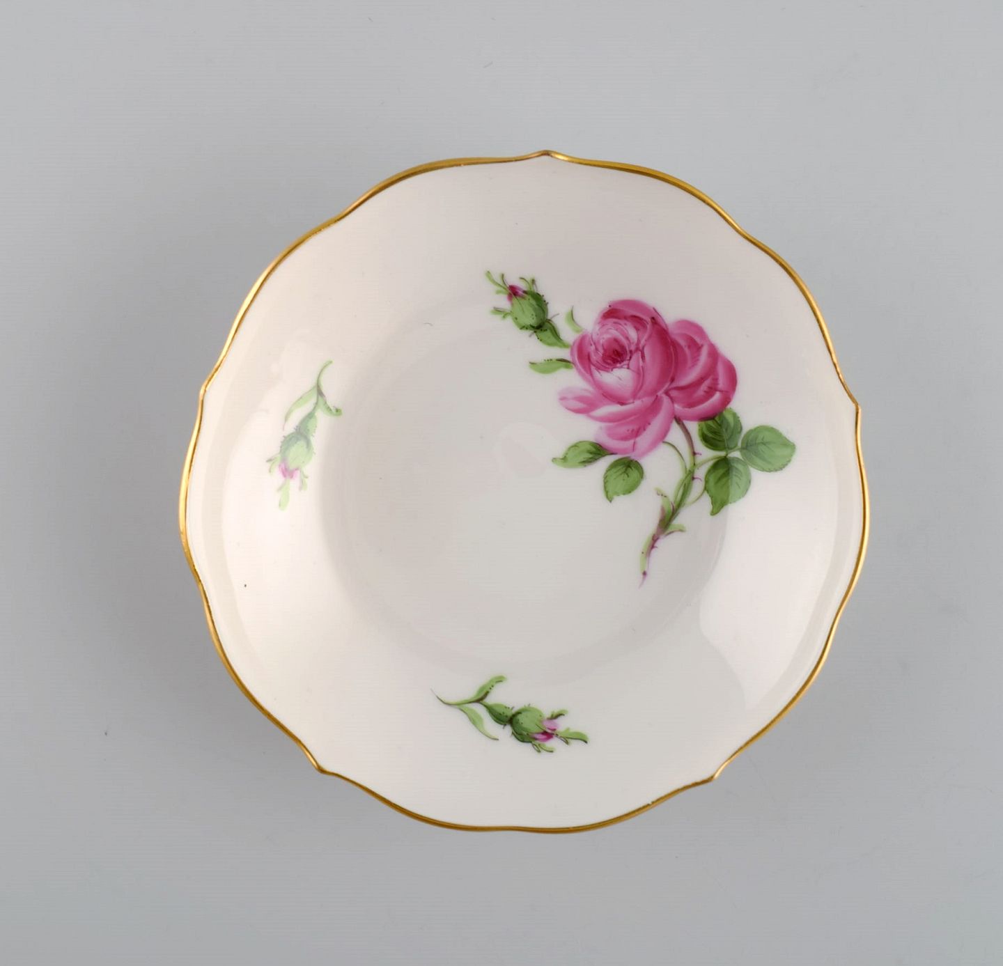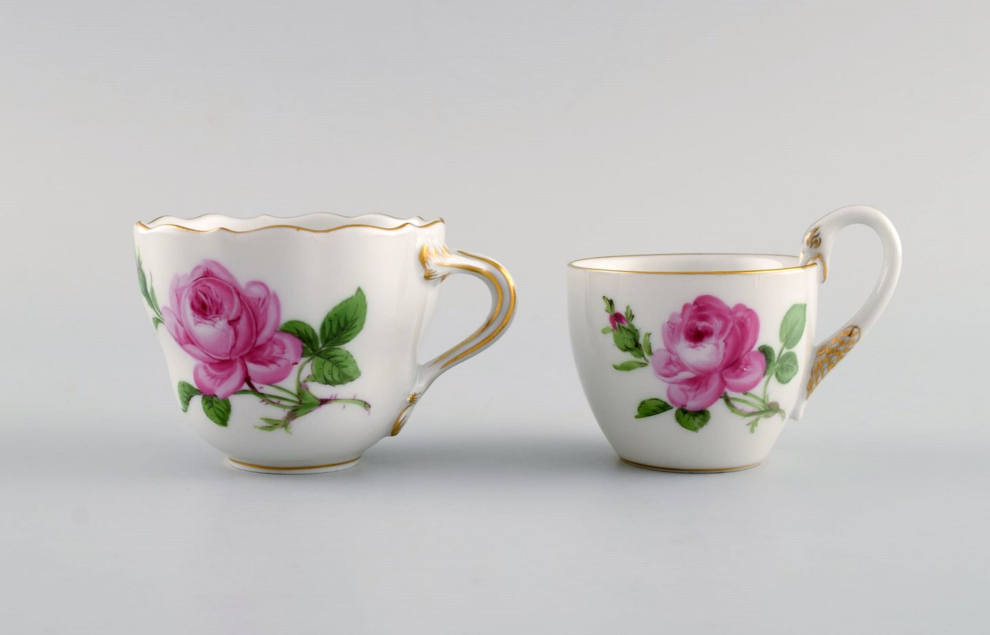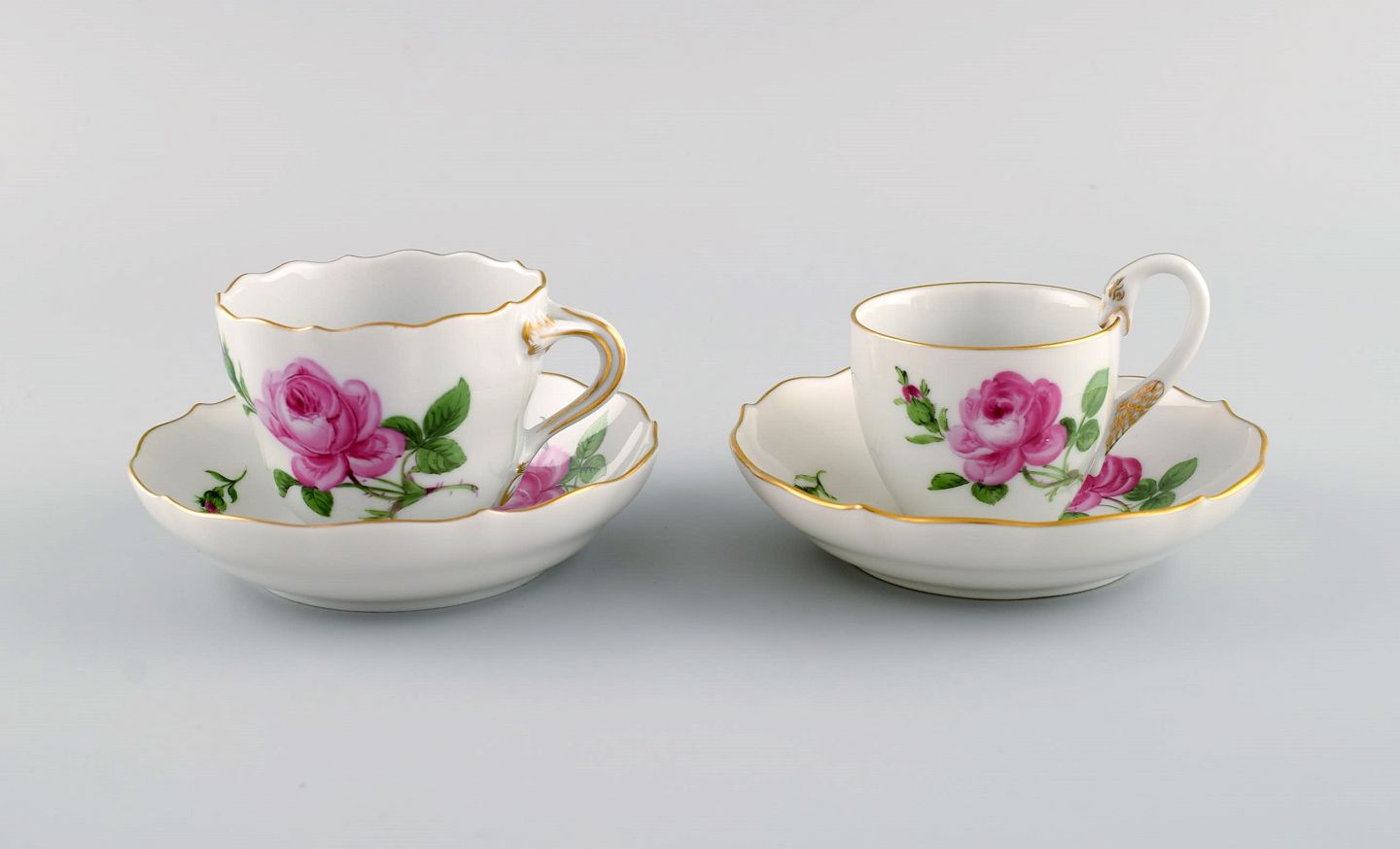 Meissen Pink Rose. Tre kaffekopper med underkopper i håndmalet porcelæn med guldkant. Tidligt 1900-tallet. Største kop måler: 6,5 x 5,5 cm. Underkop diameter: 11 cm. I flot stand. Stemplet. 3. Sortering.