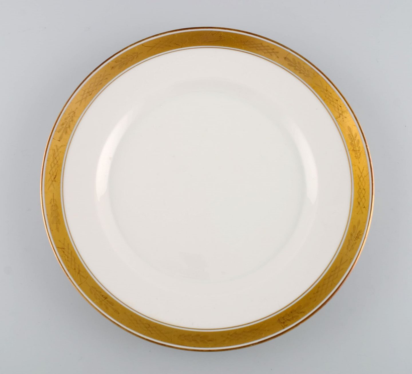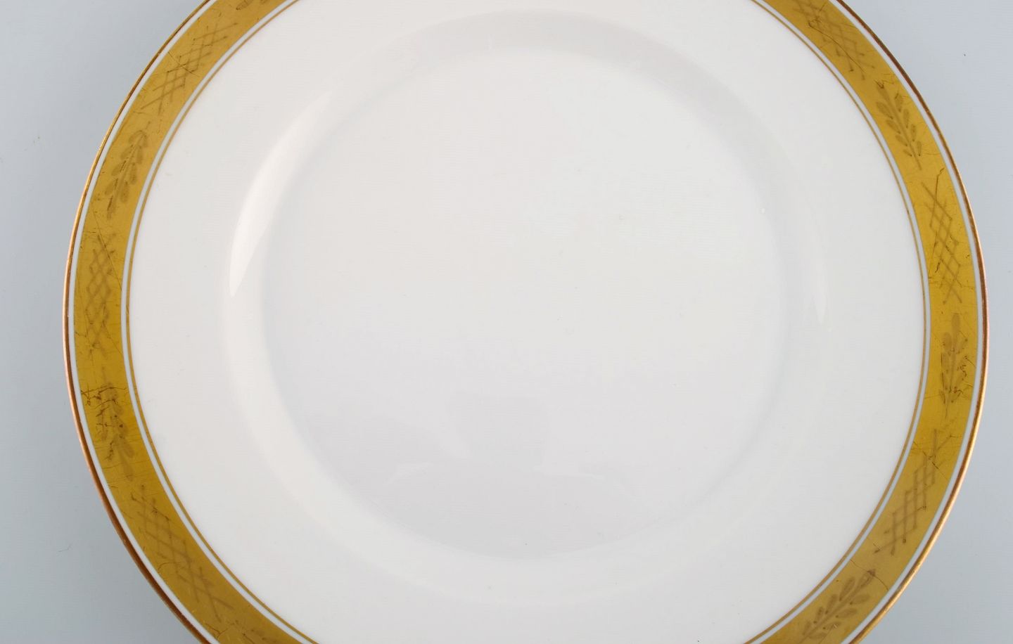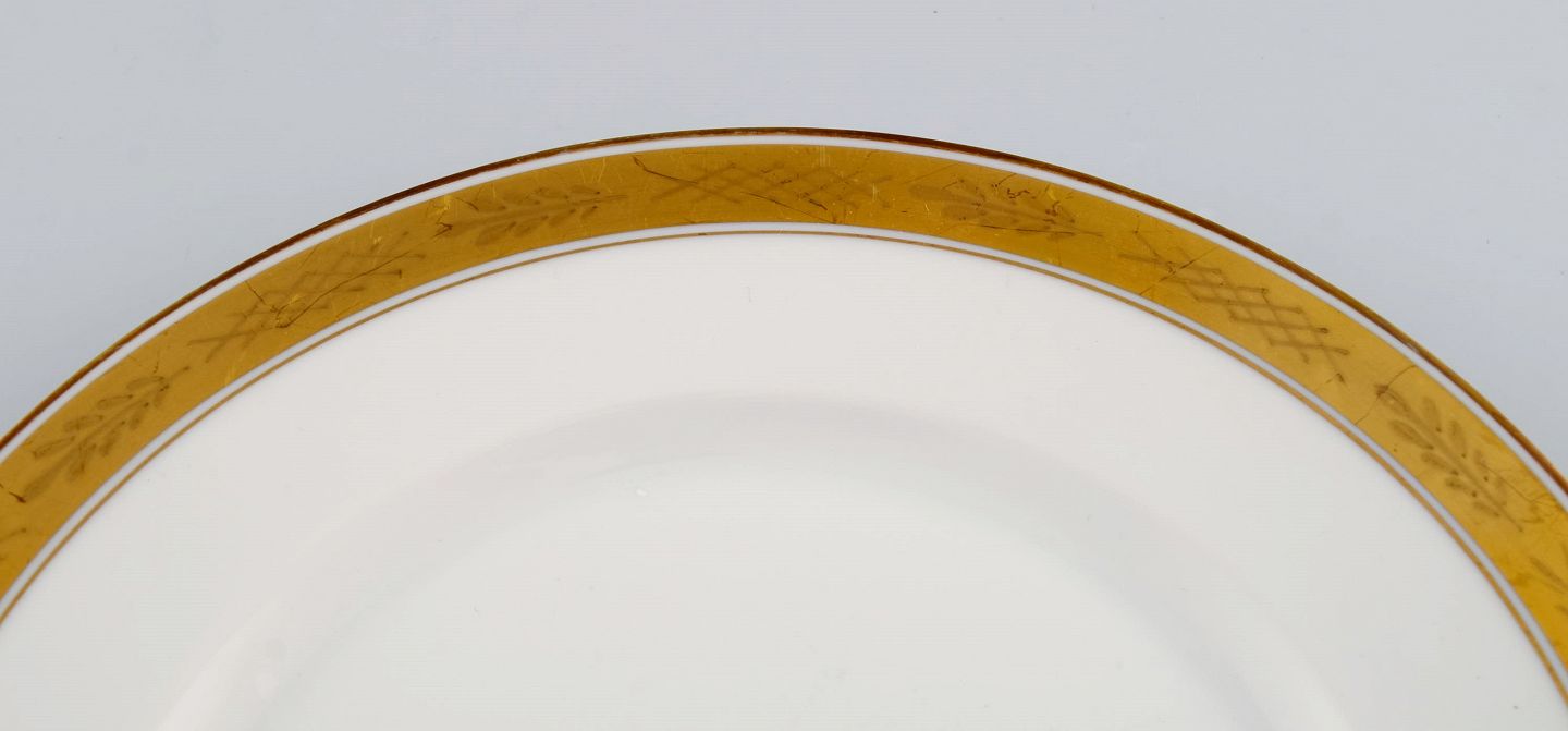 Royal Copenhagen stel nr. 607. Otte middagstallerkener i porcelæn. Guldkant med bladværk. Modelnummer 607/9586. Dateret 1944. Diameter: 25 cm. I flot stand. Stemplet. 1. Sortering.