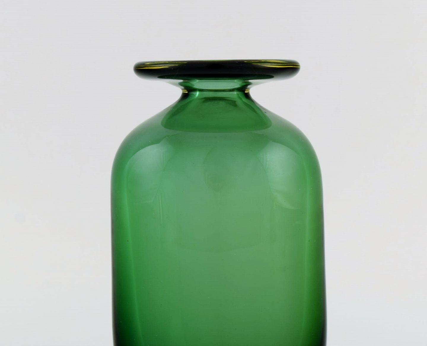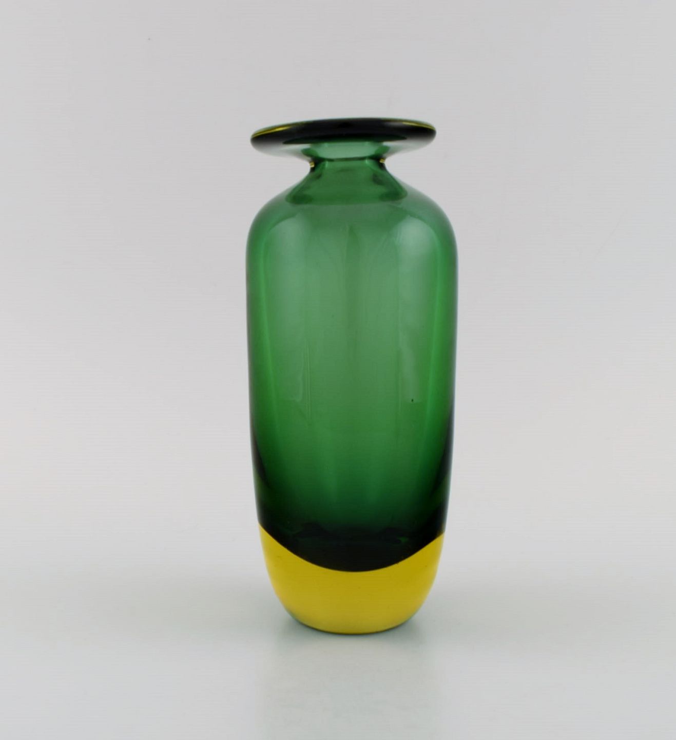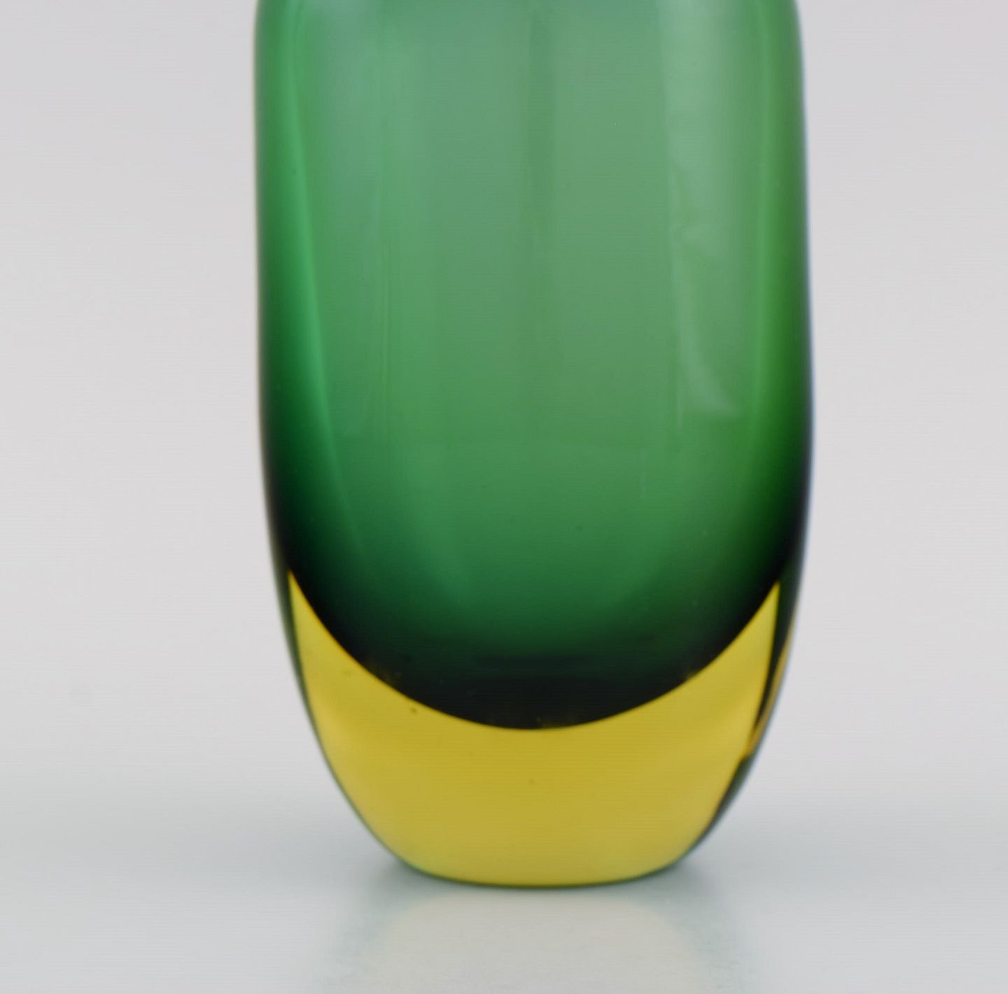 Murano vase i gult og grønt mundblæst kunstglas. Sjælden form. Italiensk design, 1960'erne. Måler: 19,5 x 9 cm I flot stand.