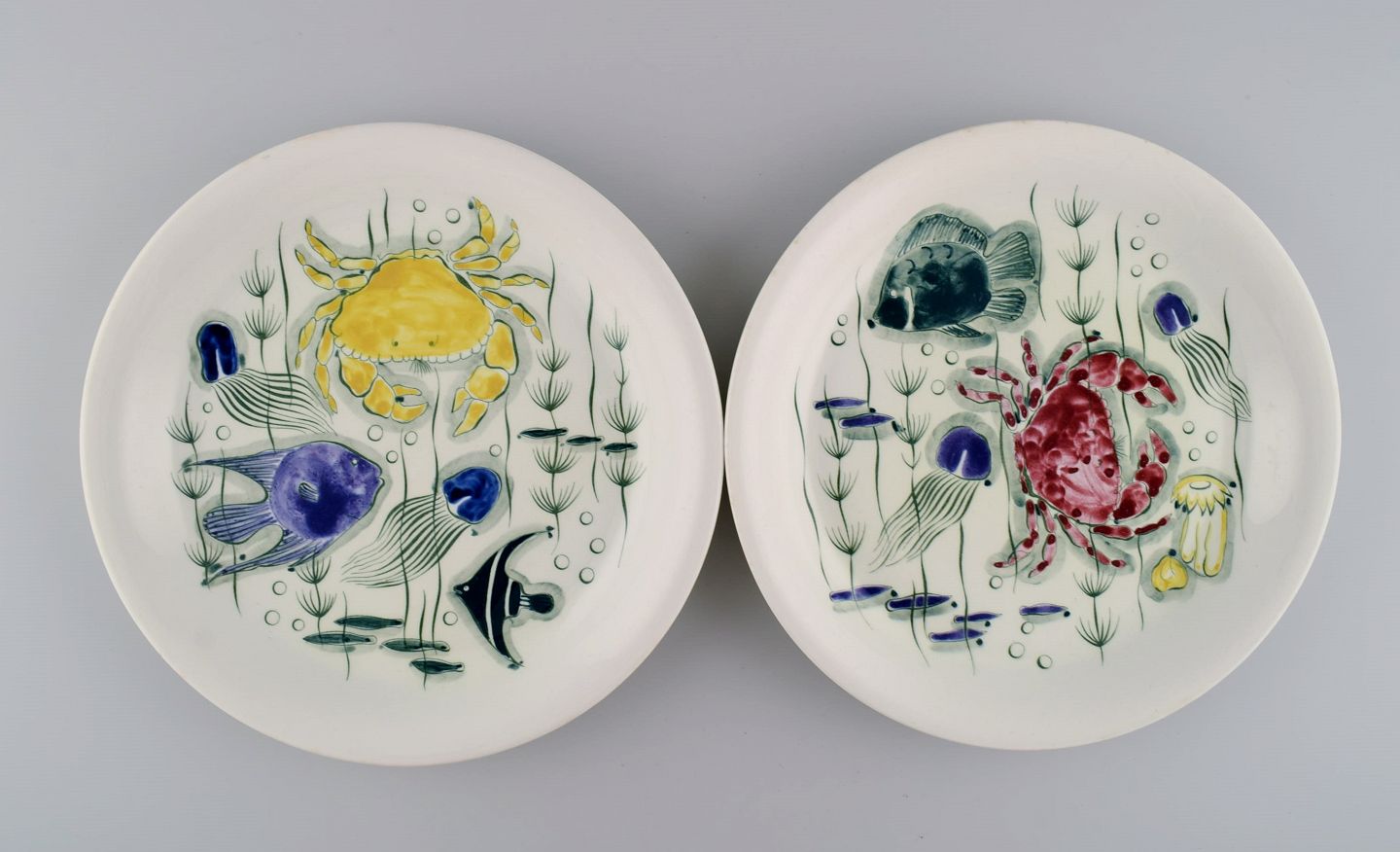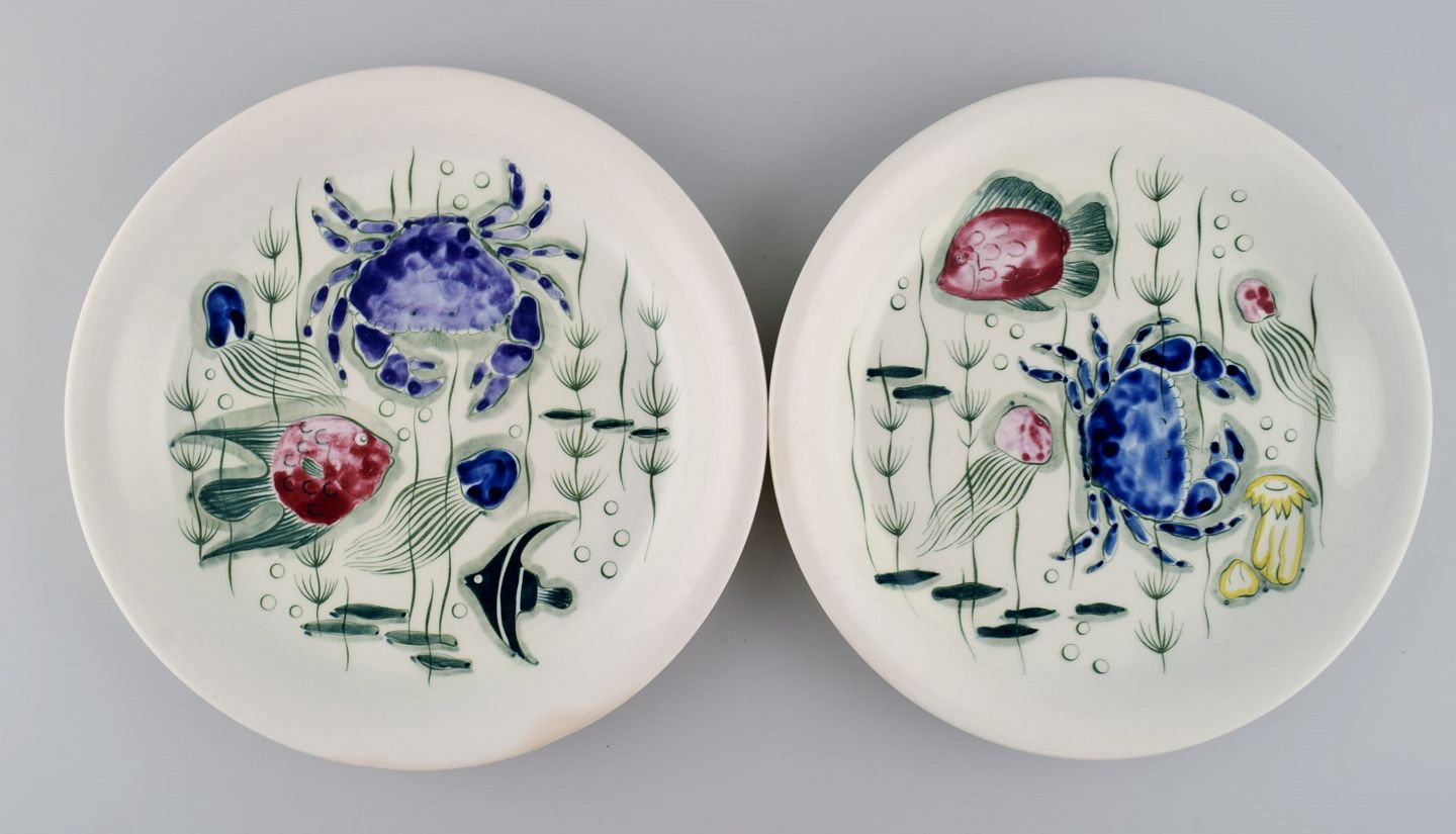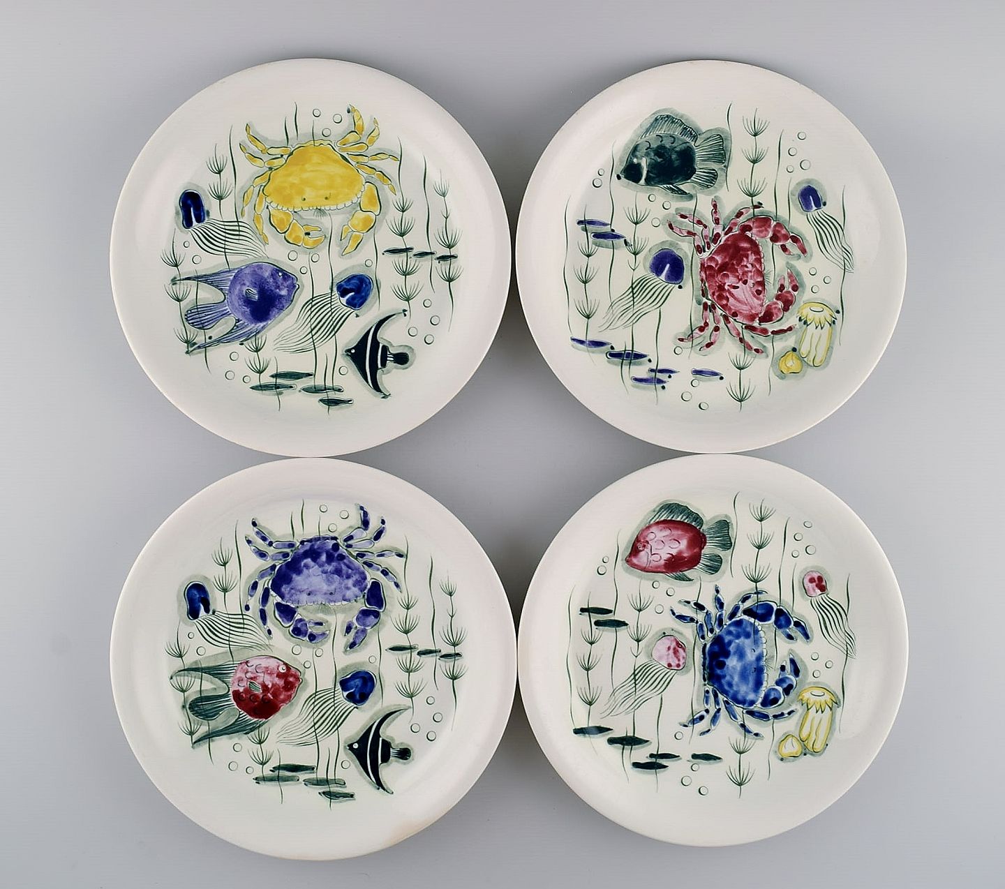 Anja Juurikkala for Arabia. Fire "Crayfish" middagstallerkener i håndmalet stentøj. Undervandsscene med fisk og krabber. Midt 1900-tallet. Diameter: 25 cm. I flot stand. Stemplet.