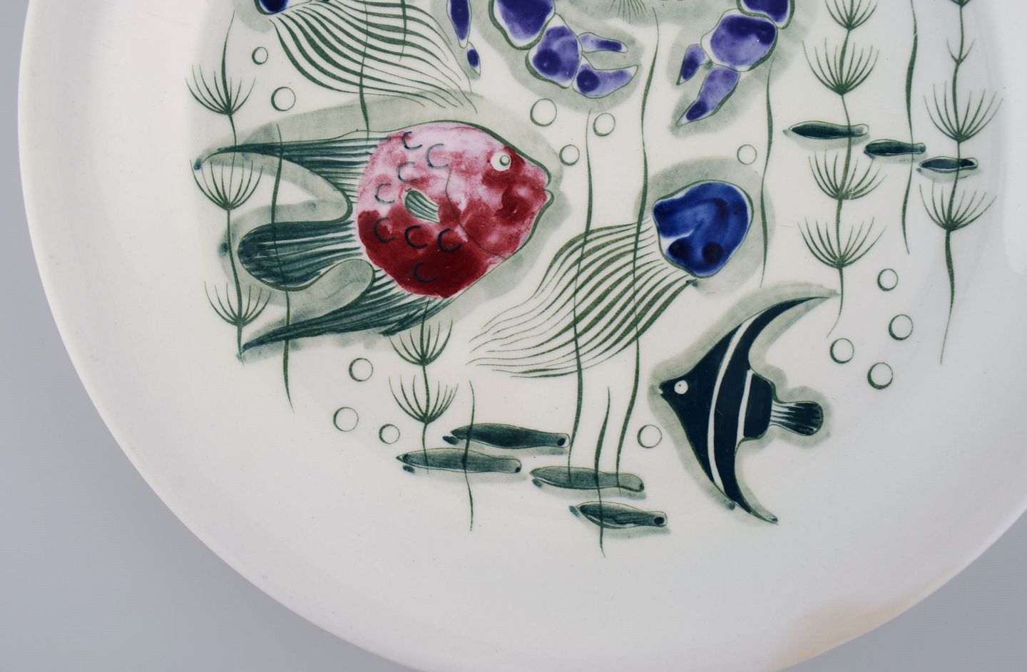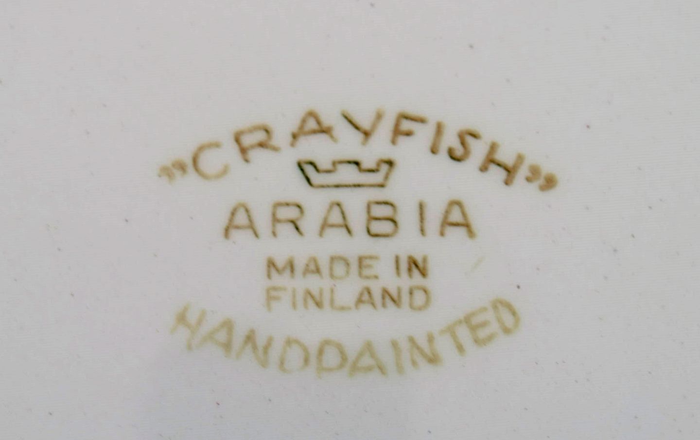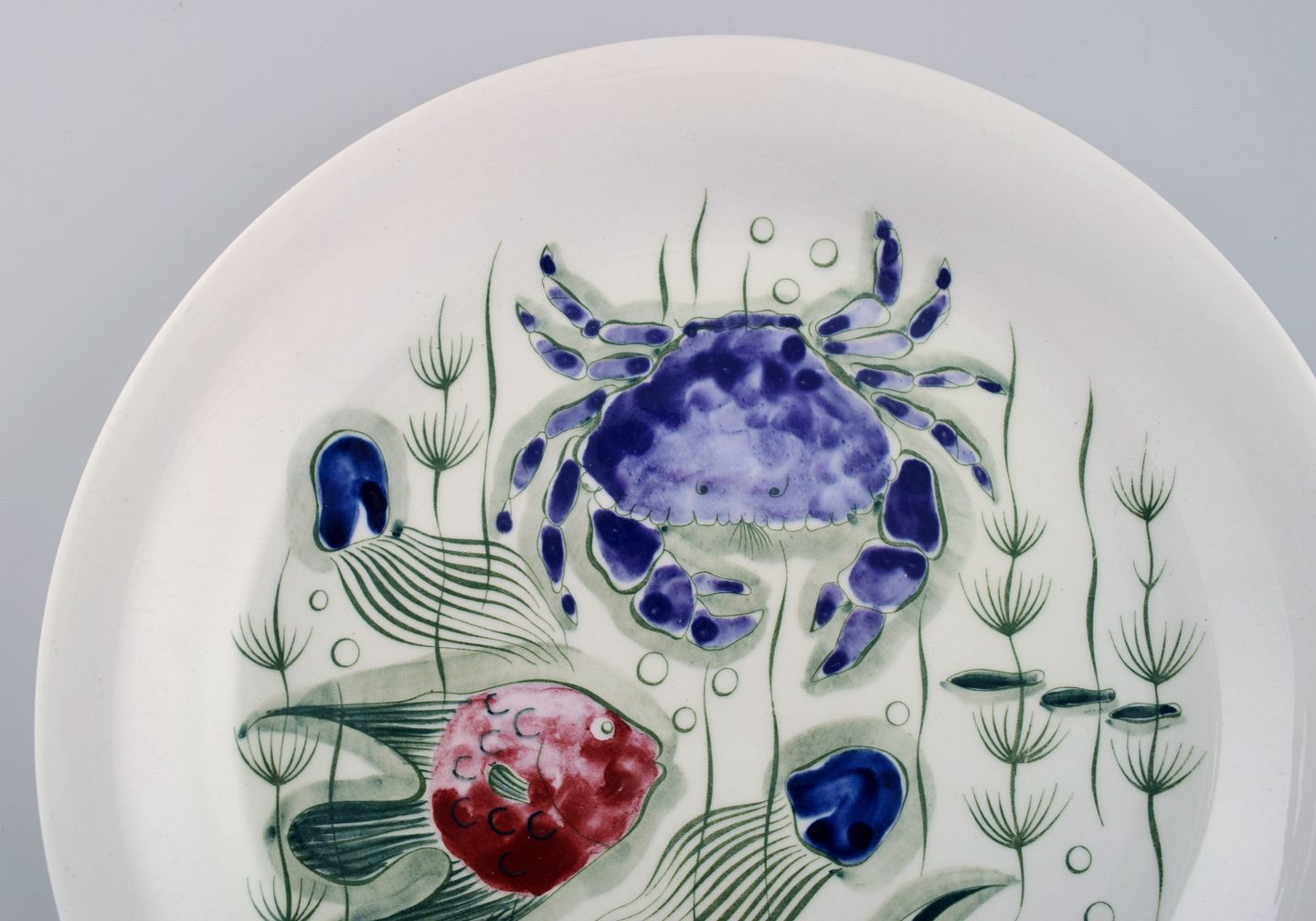 Anja Juurikkala for Arabia. Fire "Crayfish" middagstallerkener i håndmalet stentøj. Undervandsscene med fisk og krabber. Midt 1900-tallet. Diameter: 25 cm. I flot stand. Stemplet.