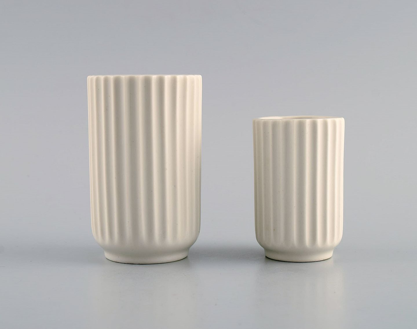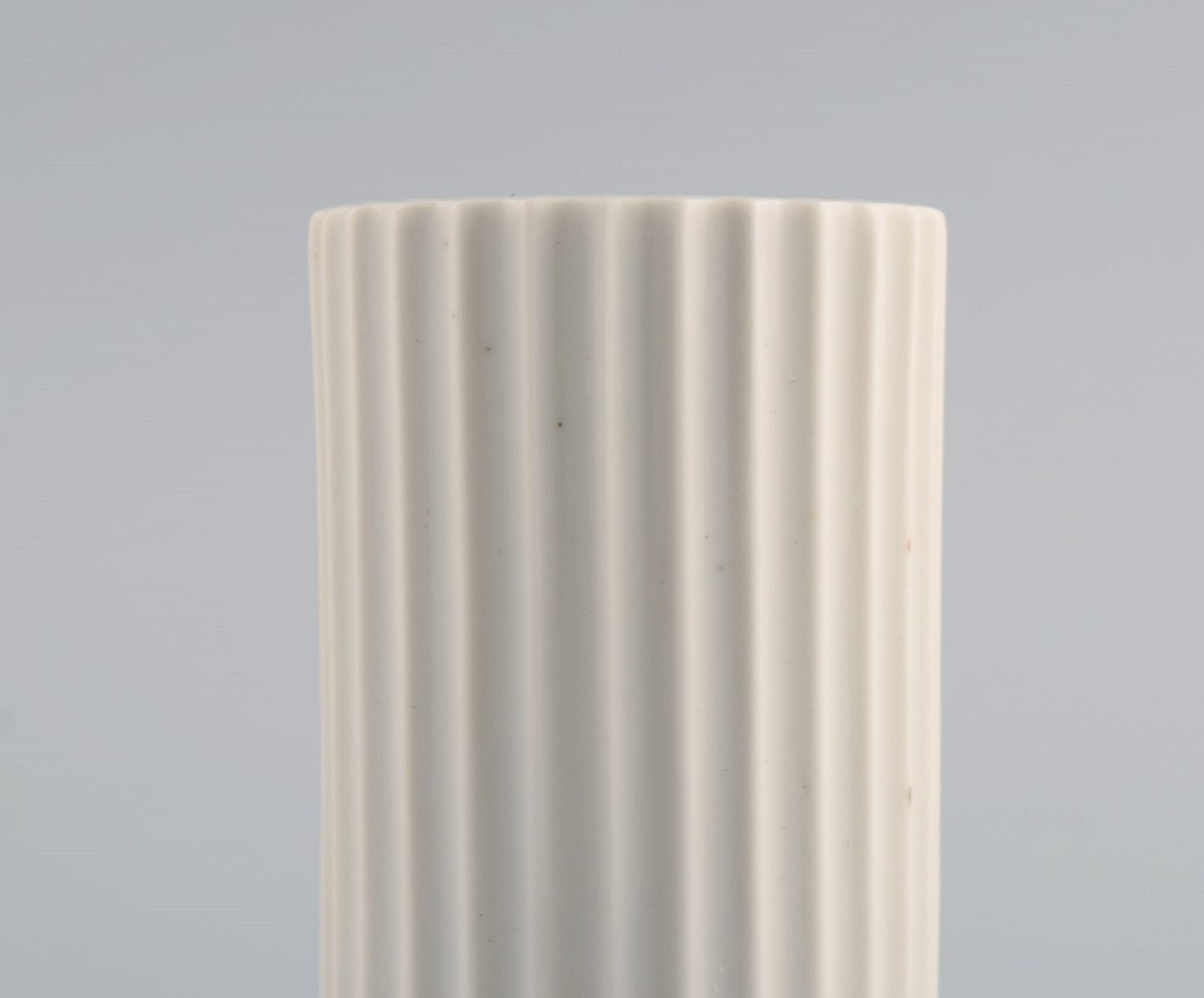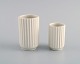 Et par tidlige Lyngby porcelænsvaser med kanneleret korpus. Dateret 1936-1940. Måler: 8,2 x 5 cm. I flot stand. Stemplet.