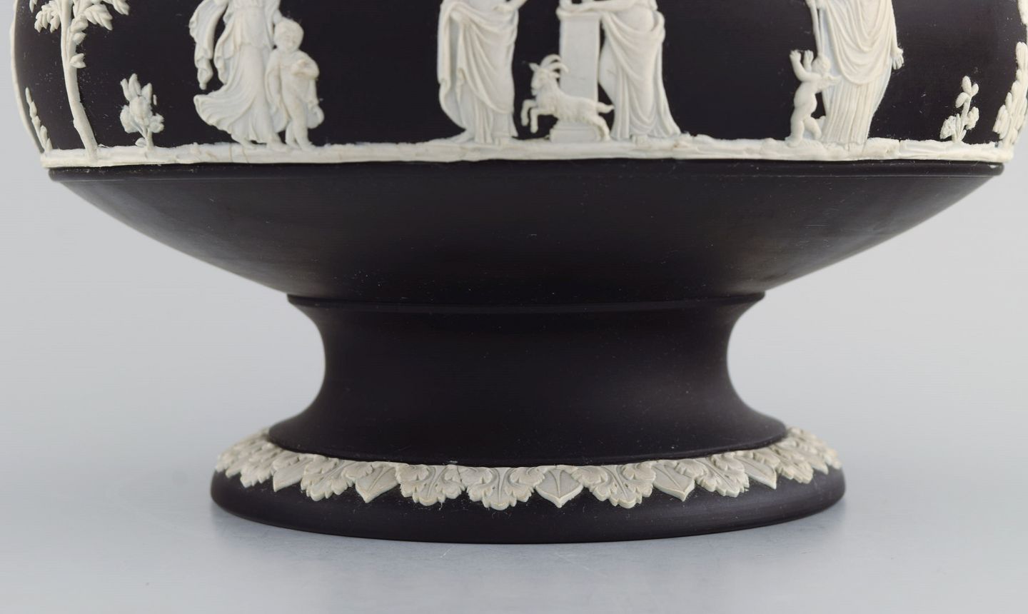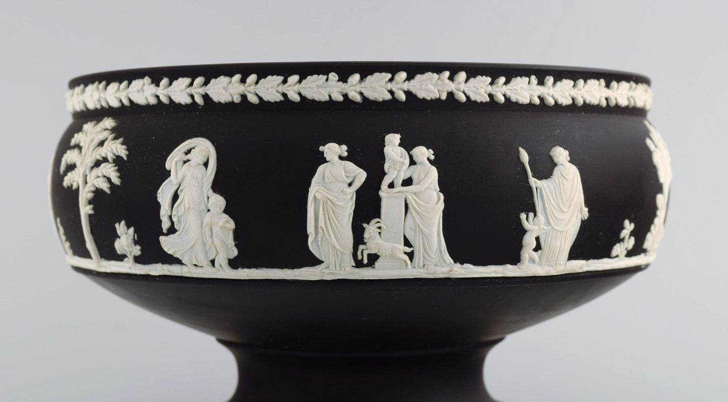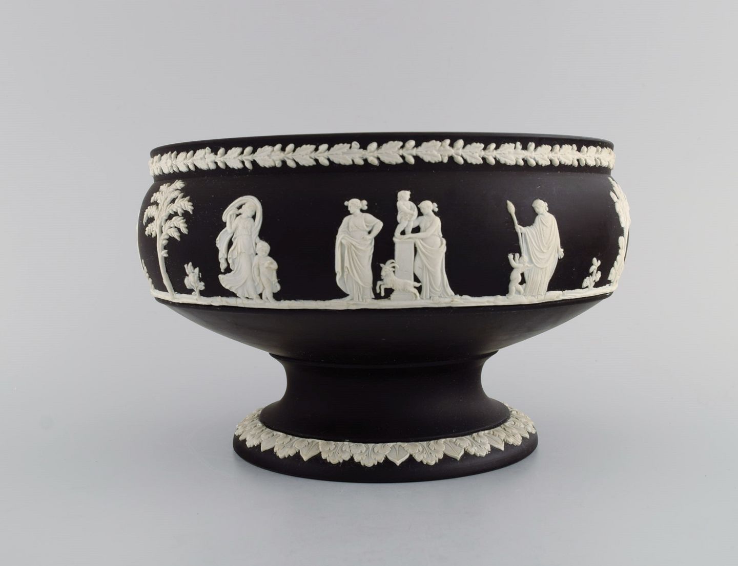 Wedgwood, England. Sjælden skål i sort stentøj med klassicistiske scener i hvidt. 1930'erne. Måler: 22 x 15 cm. Stemplet. I flot stand.