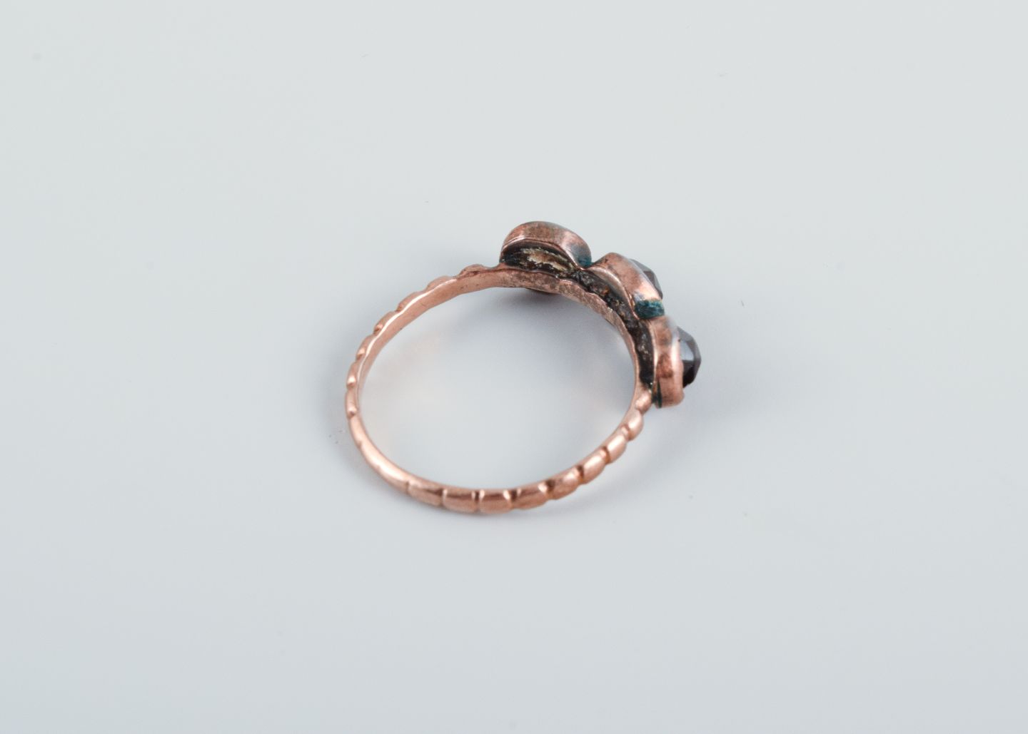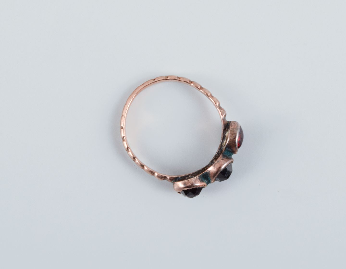 Skandinavisk guldsmed, ældre guldring prydet med tre rød sten. 1920/30erne. Ustemplet. Målt til 14 karat. Ringstørrelse 15mm.