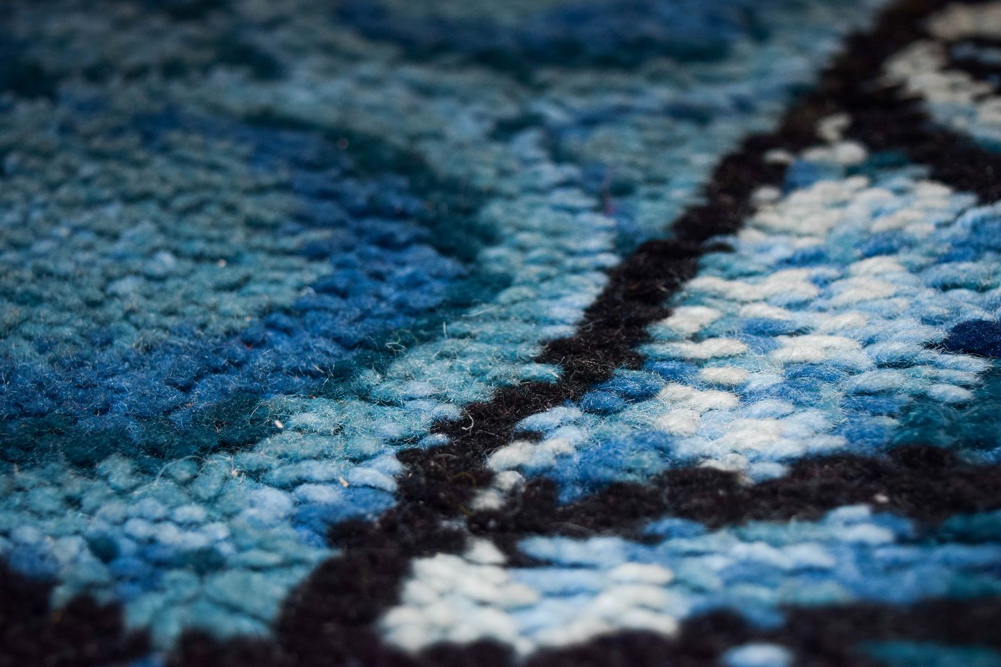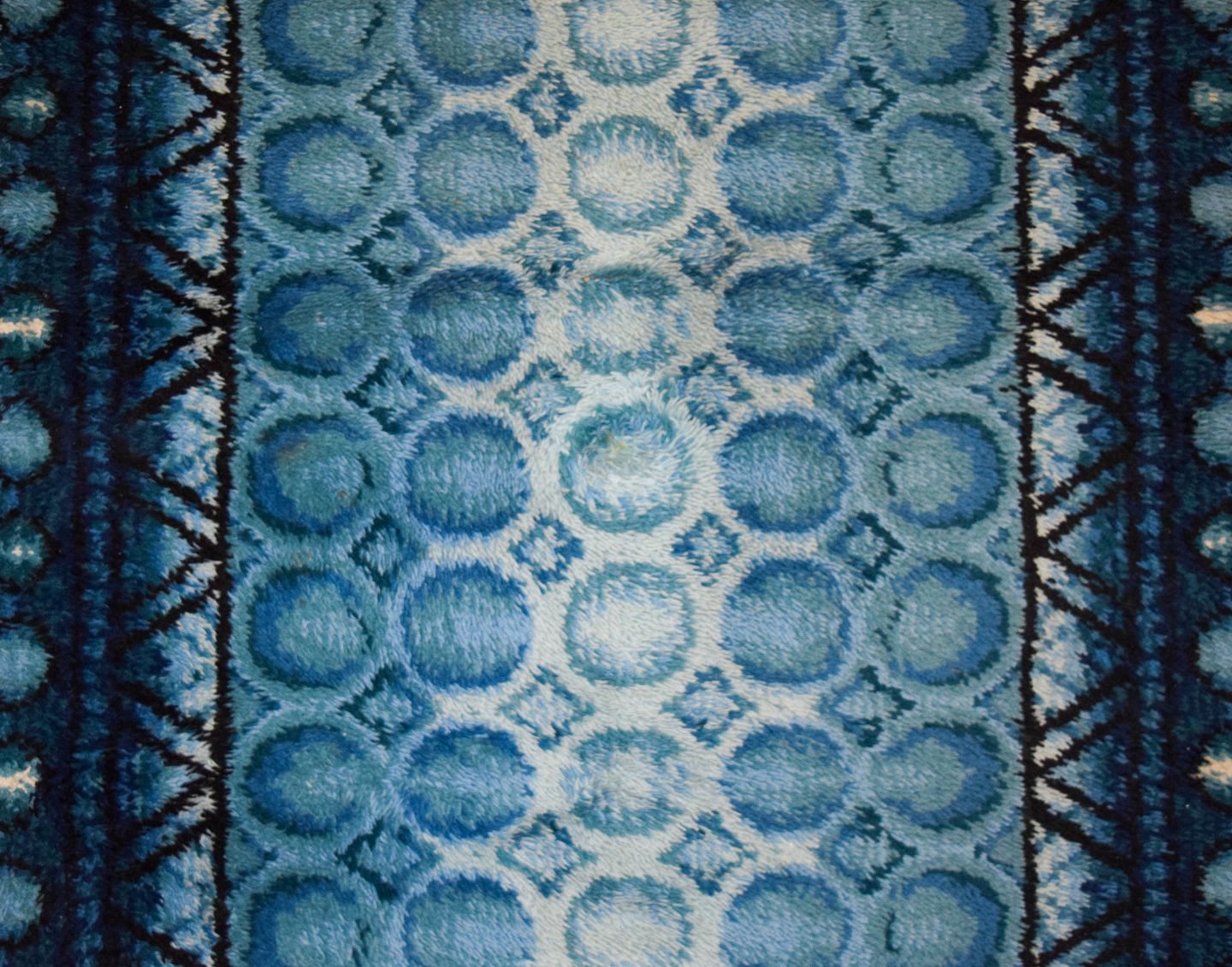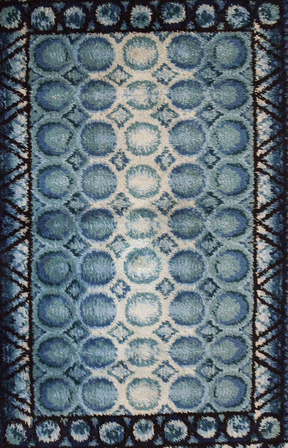 Ryatæppe i ren uld. Geometriske felter i blå og hvide nuancer. 1960/70'erne. Måler: 195 x 137 cm. I flot stand.