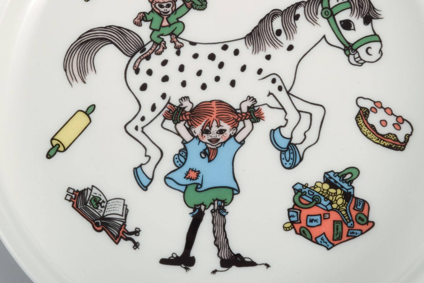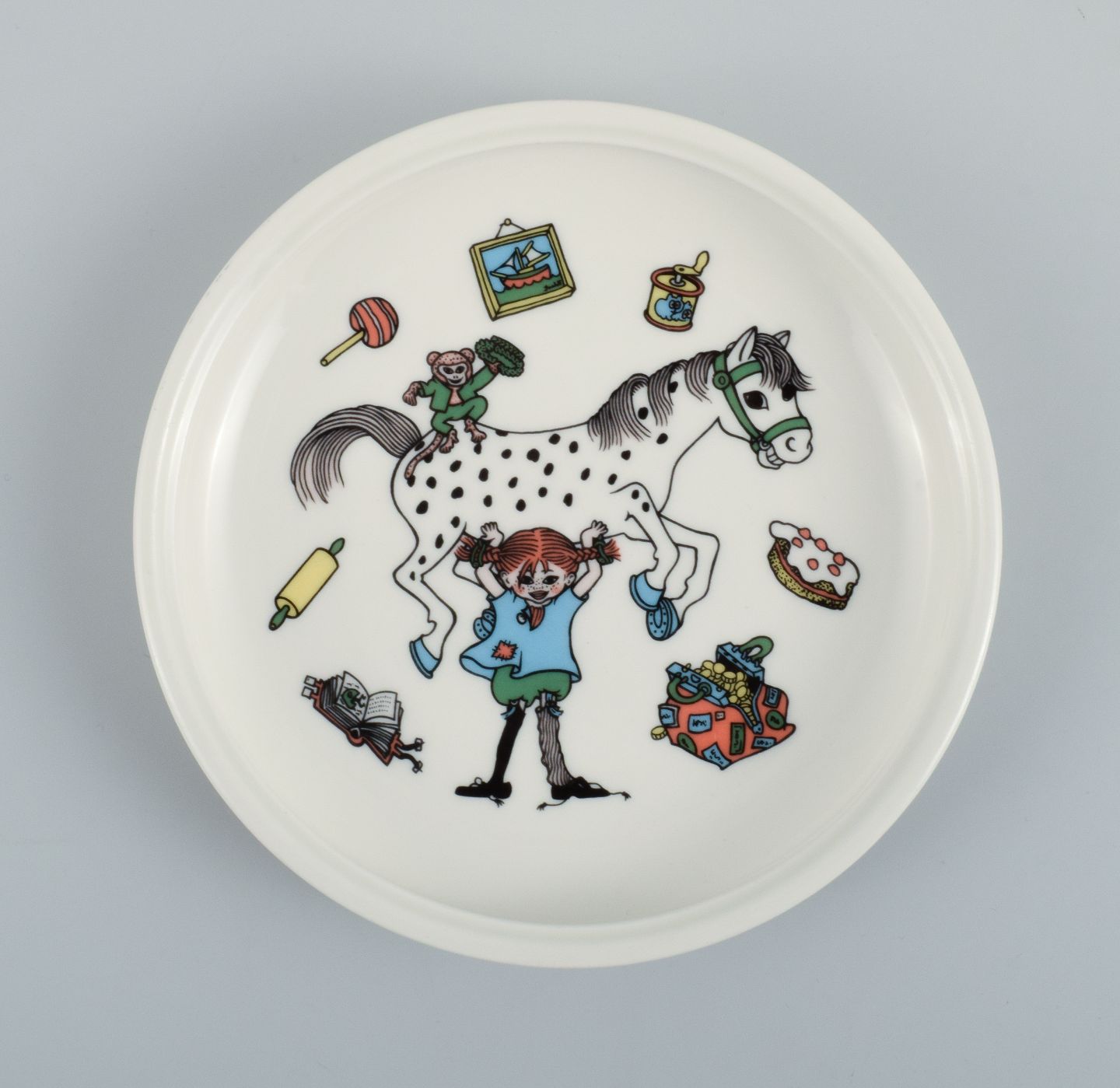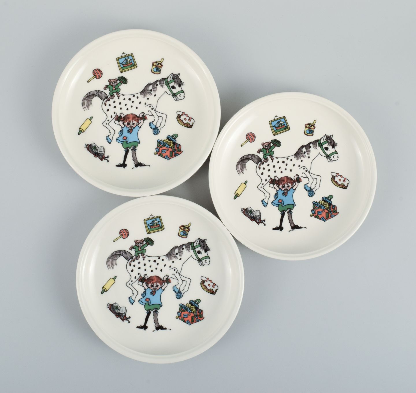 Rörstrand. Tre tallerkner i porcelæn med Pippi Langstrømpe motiv. Sent 1900-tallet. I flot stand. Stemplet. Tallerken måler: 18,0 x 3,0 cm.