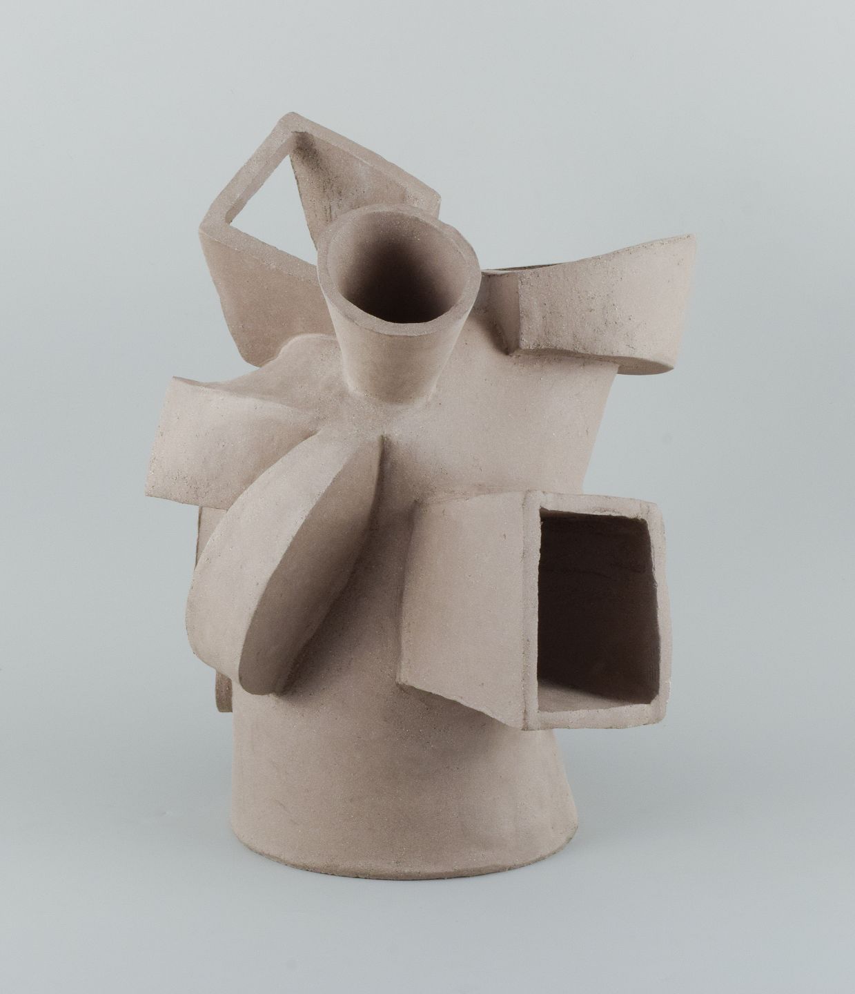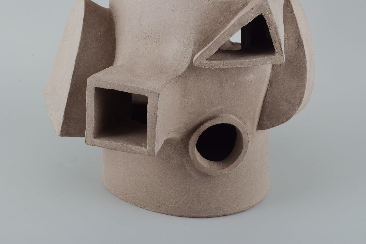 Unik monumental kubistisk skulptur i rå, uglasert ler.