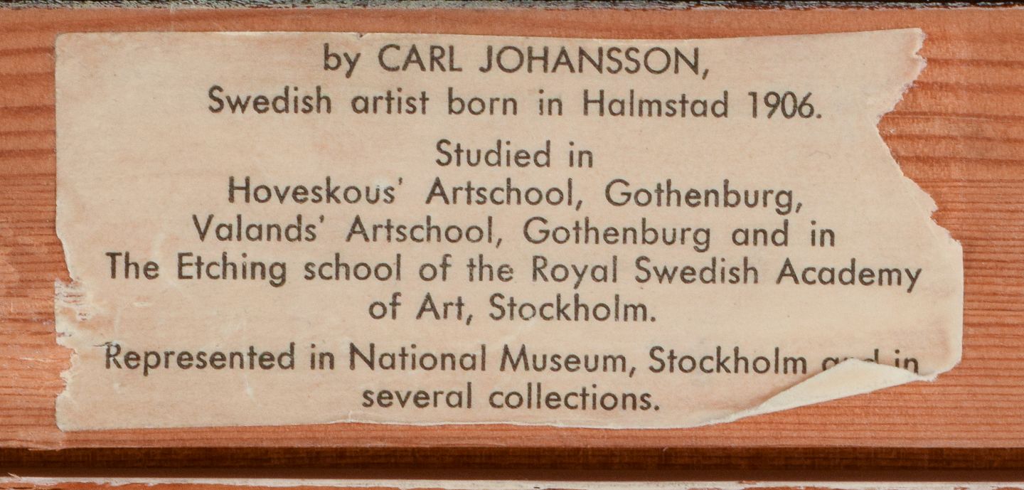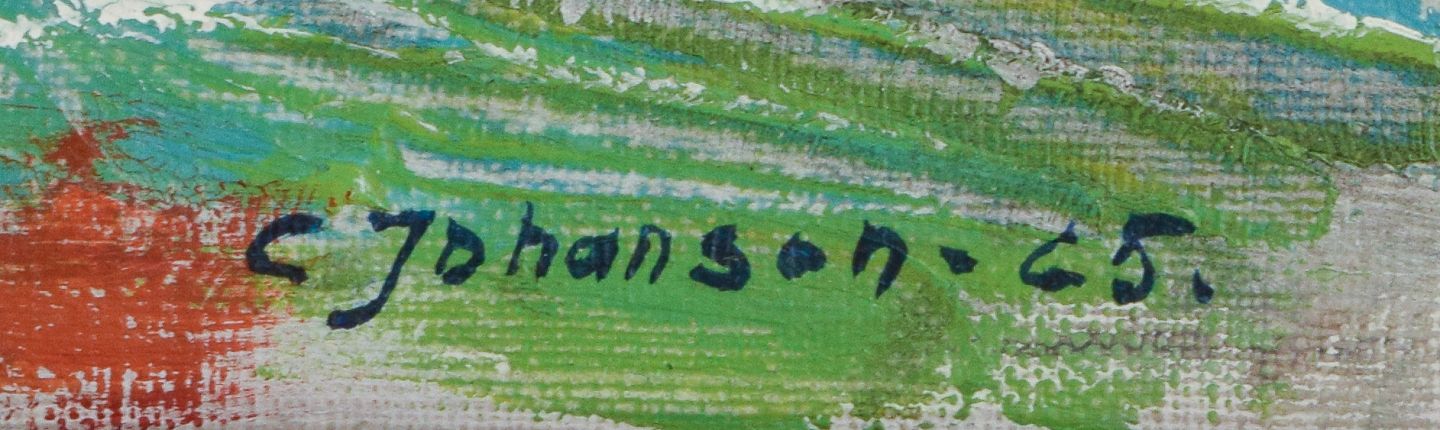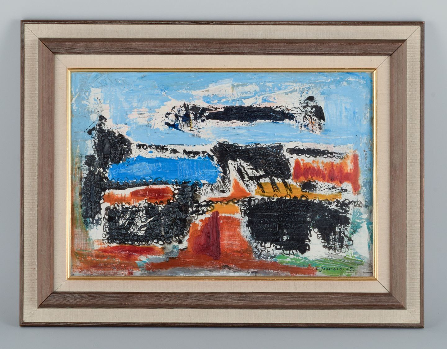 Carl Johansson (1906-1993), svensk kunstner. Astrakt komposition. Olie på plade. Signeret og dateret 1965. I perfekt stand. Mål: 45,0 x 30,0 / Total 58,5 x 45,0 cm.