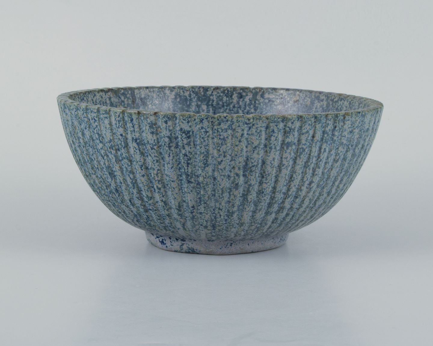 Arne Bang, keramikskål i rillet design, glasur i blå nuancer Model nr. 123. 1940/50’erne. Perfekt stand. Håndsigneret. Mål: D 18,5 x H 9,0 cm.