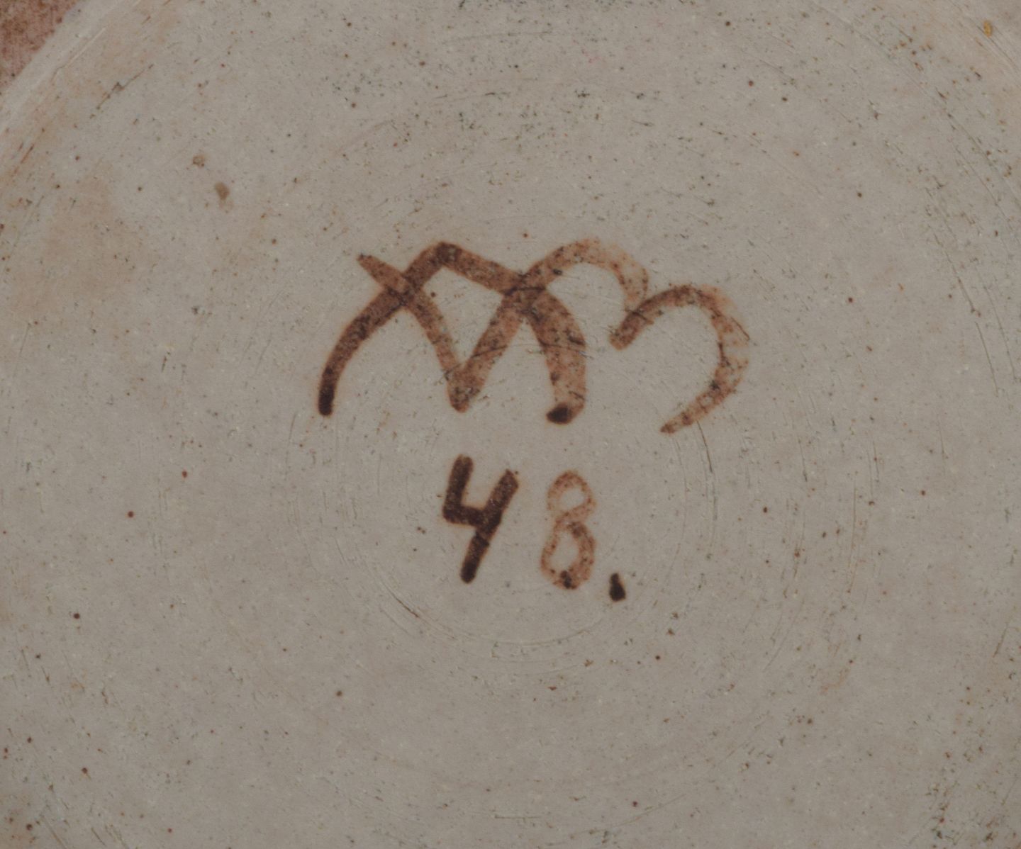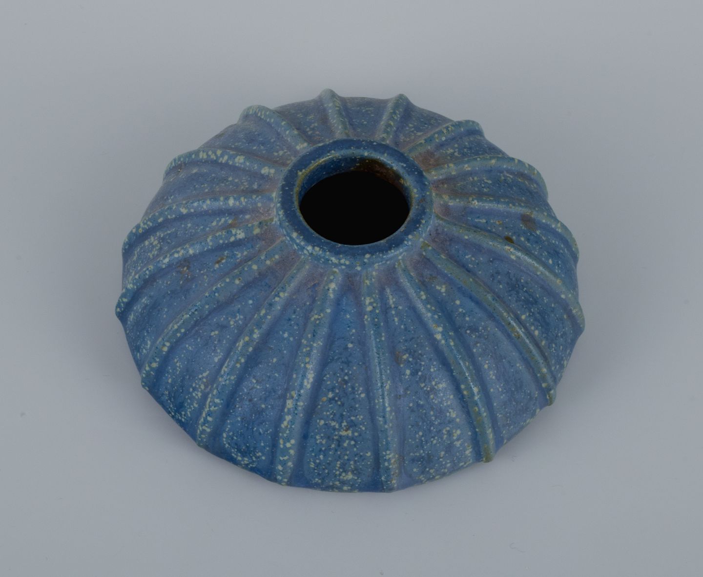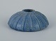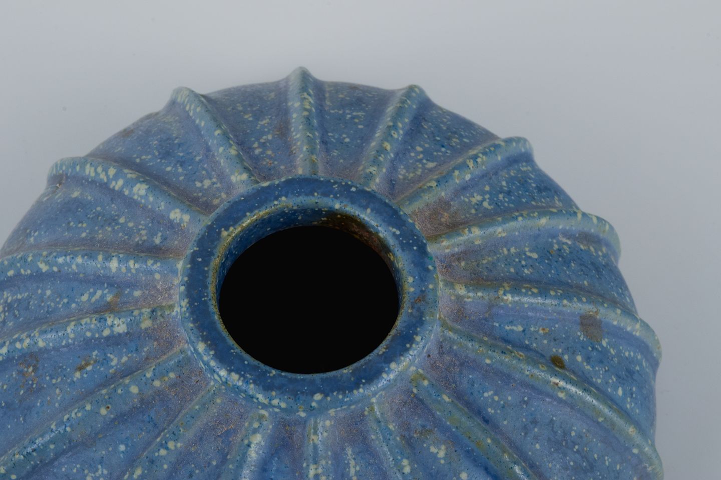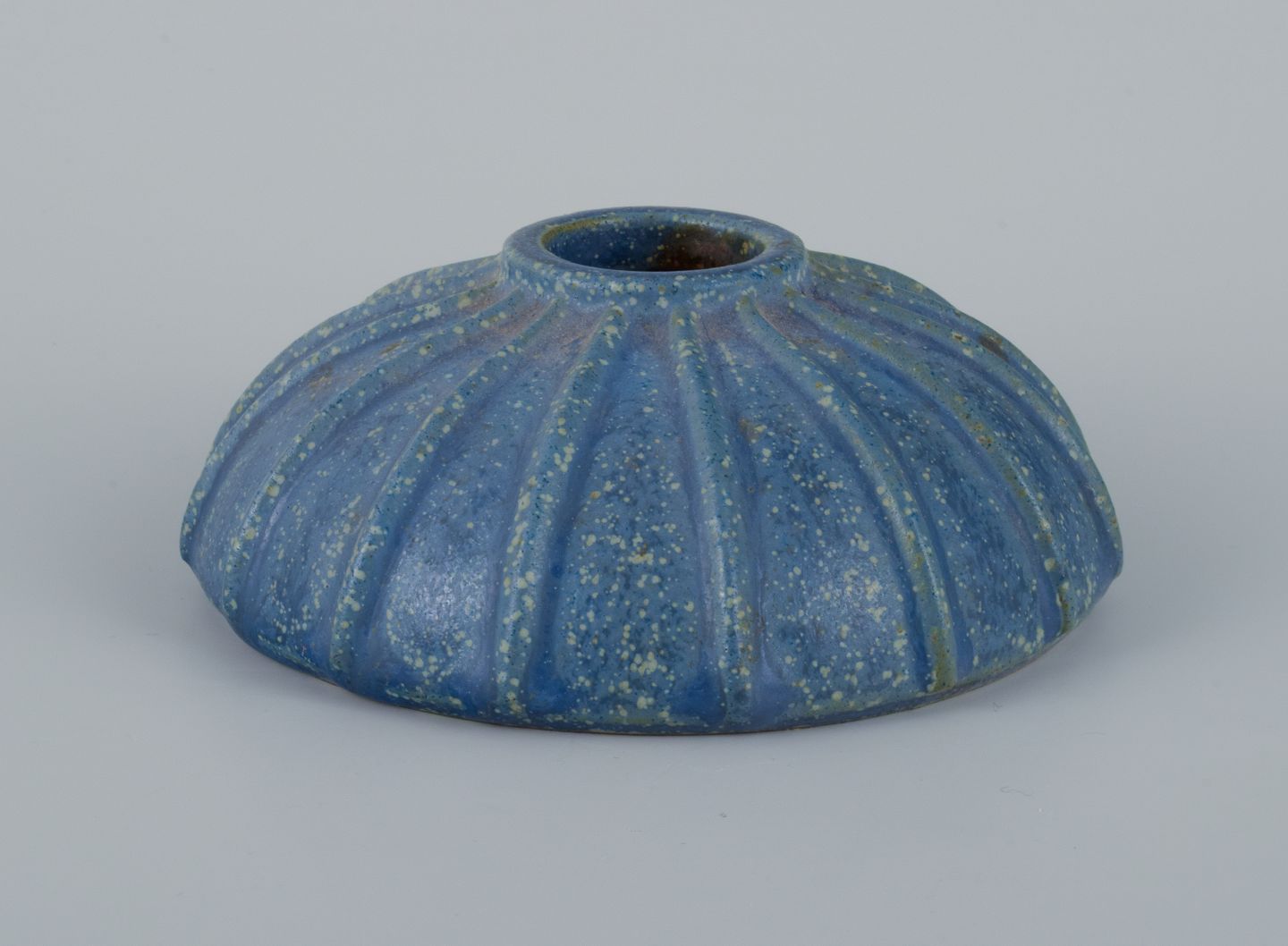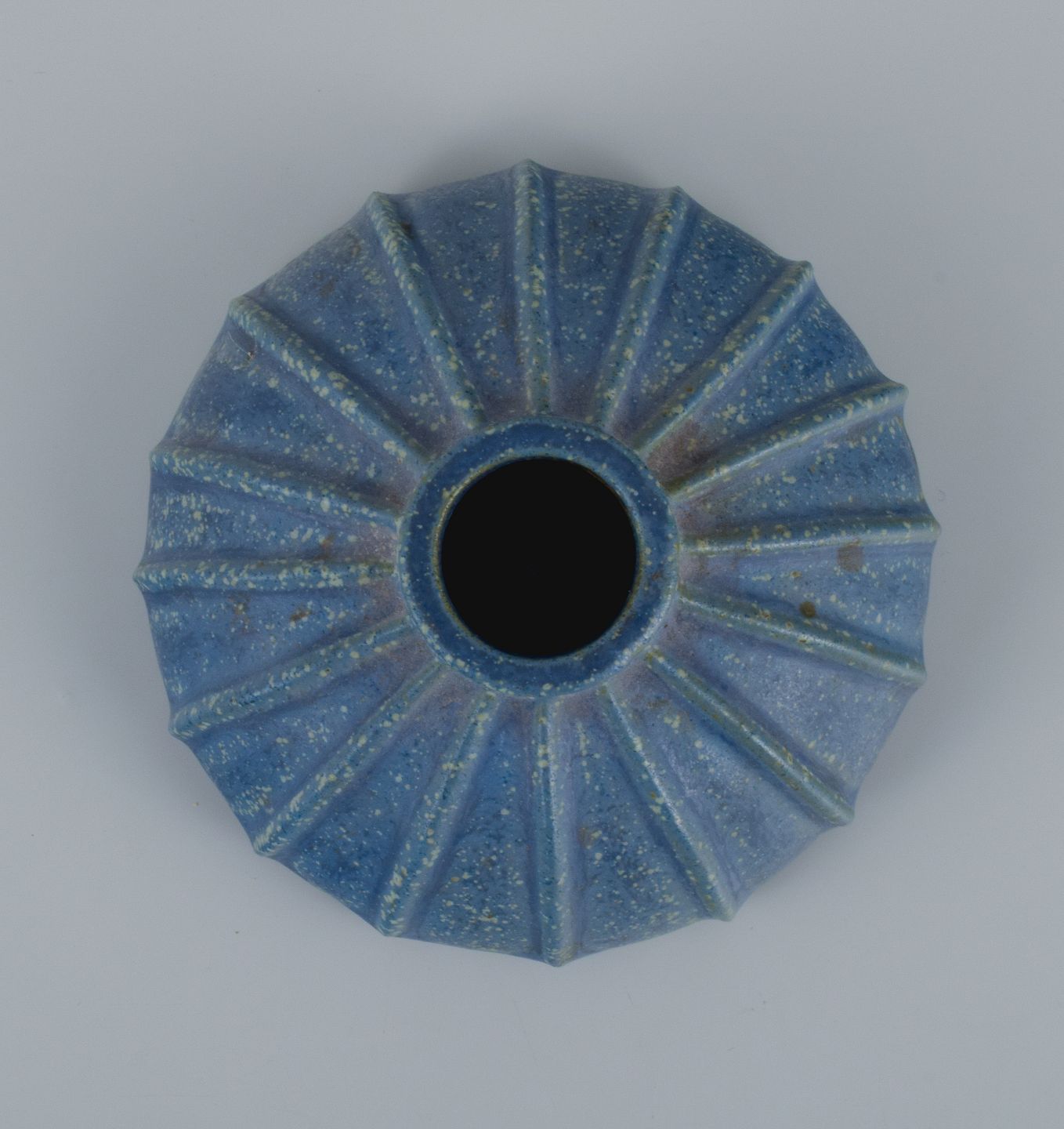 Arne Bang, lav og rund keramikvase i rillet design med glasur i blå nuancer. Model 48. 1940/50’erne I perfekt stand. Håndsigneret. Mål: D 13 x H 4,5 cm.