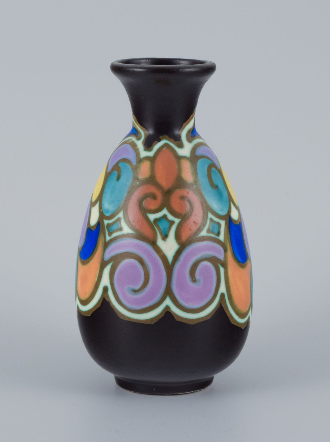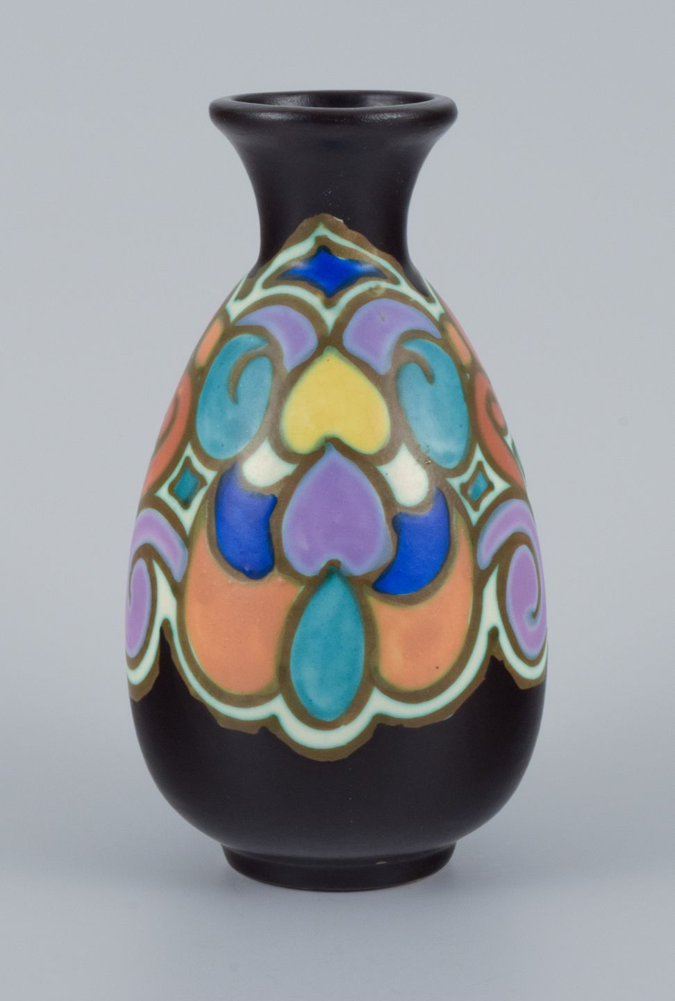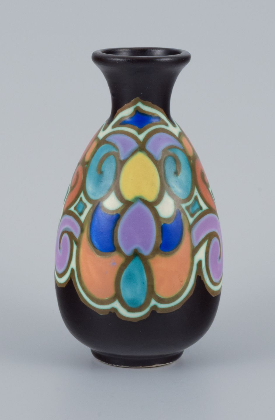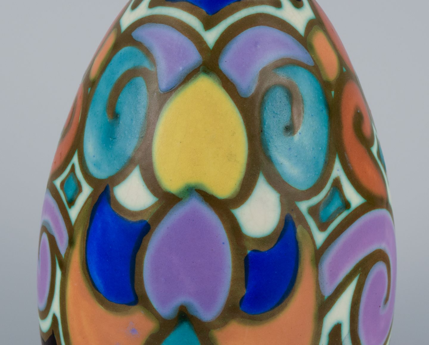 Gouda, Holland, art nouveau hånddekoreret keramikvase. Ca. 1920’erne. Stemplet. I perfekt stand. Mål: H 17,5 x D 9,5 cm.