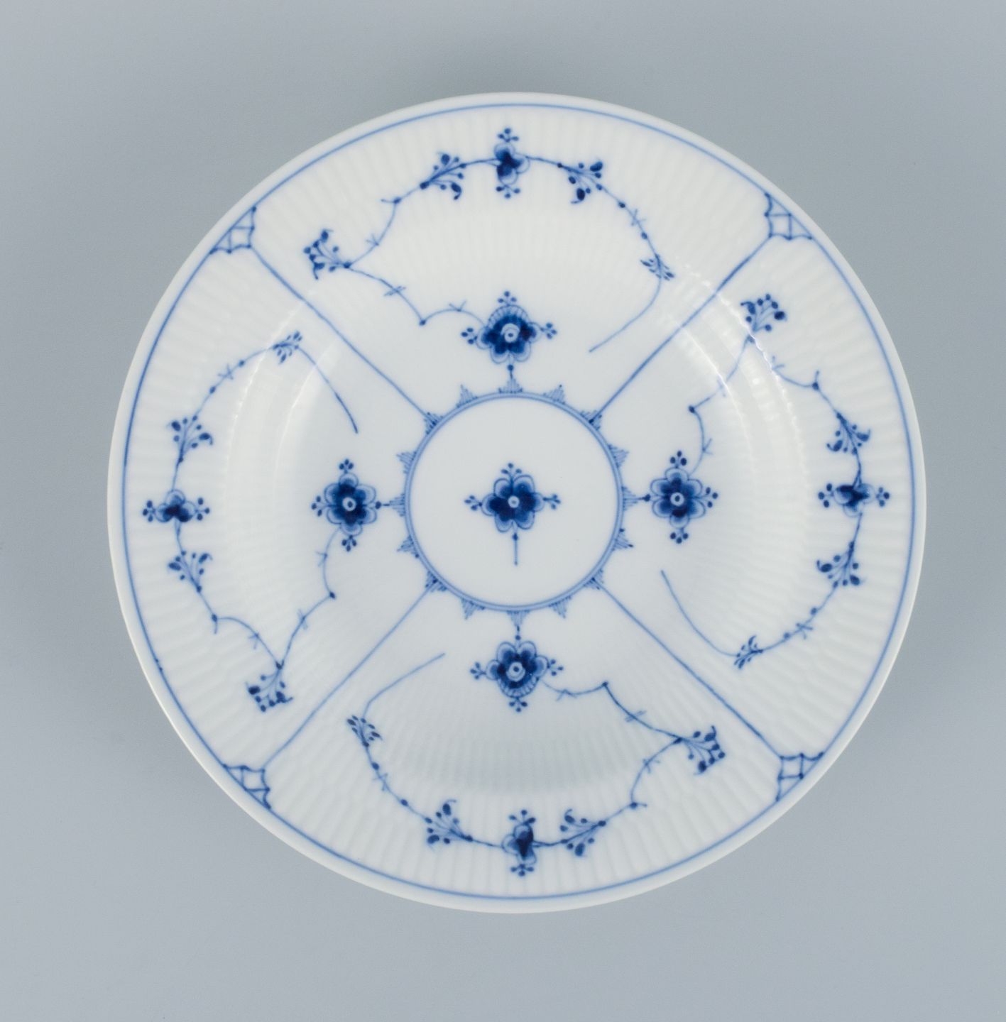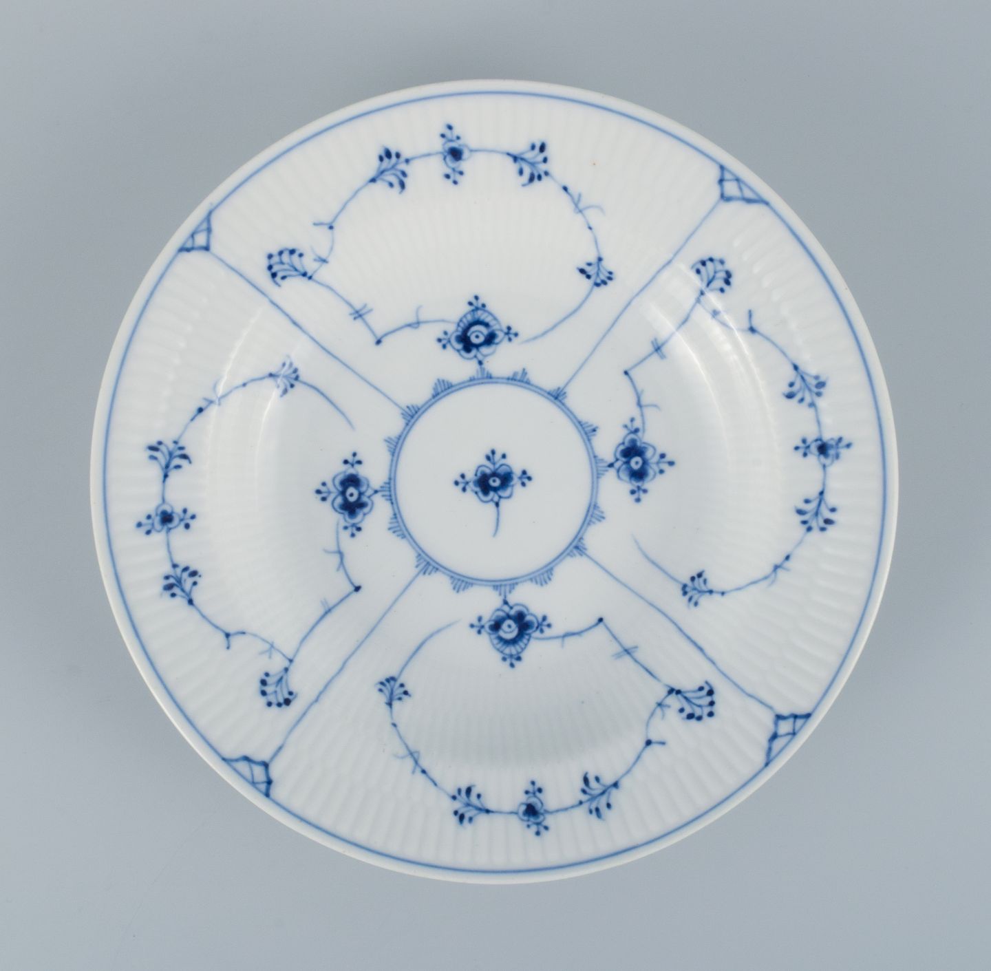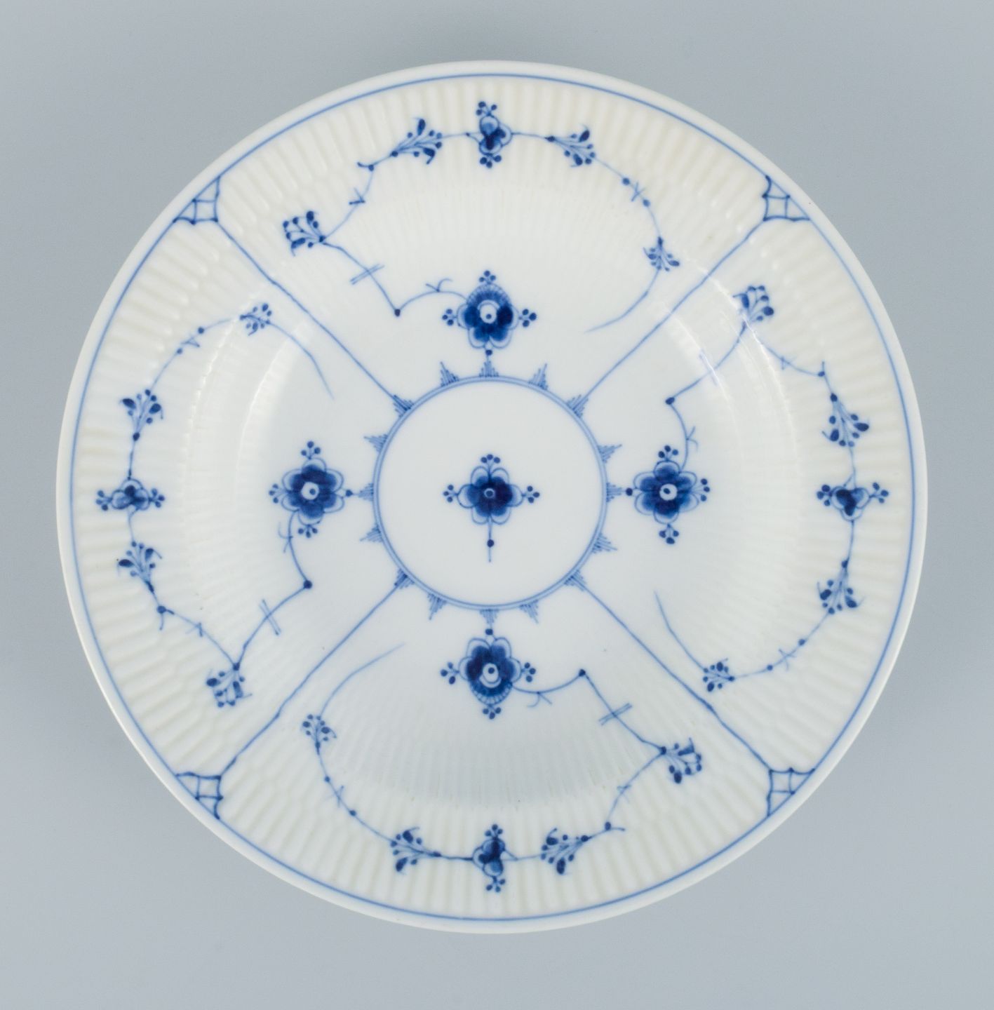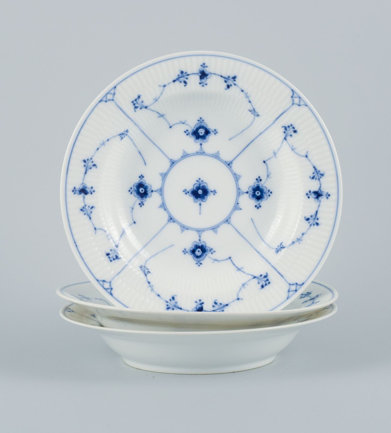 Royal Copenhagen, tre Musselmalet riflet dybe tallerkener. Modelnummer 1/165. Tidligt 1900-tallet. I perfekt stand. Første sortering. Stemplet. Mål: 24,5 x H 5,0 cm.
