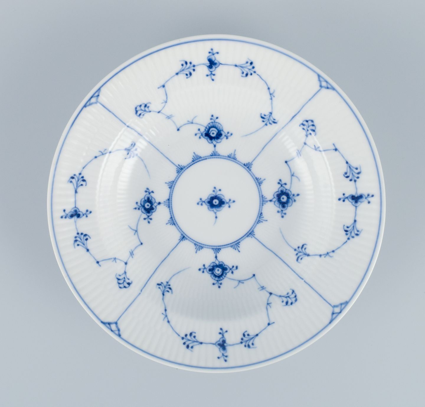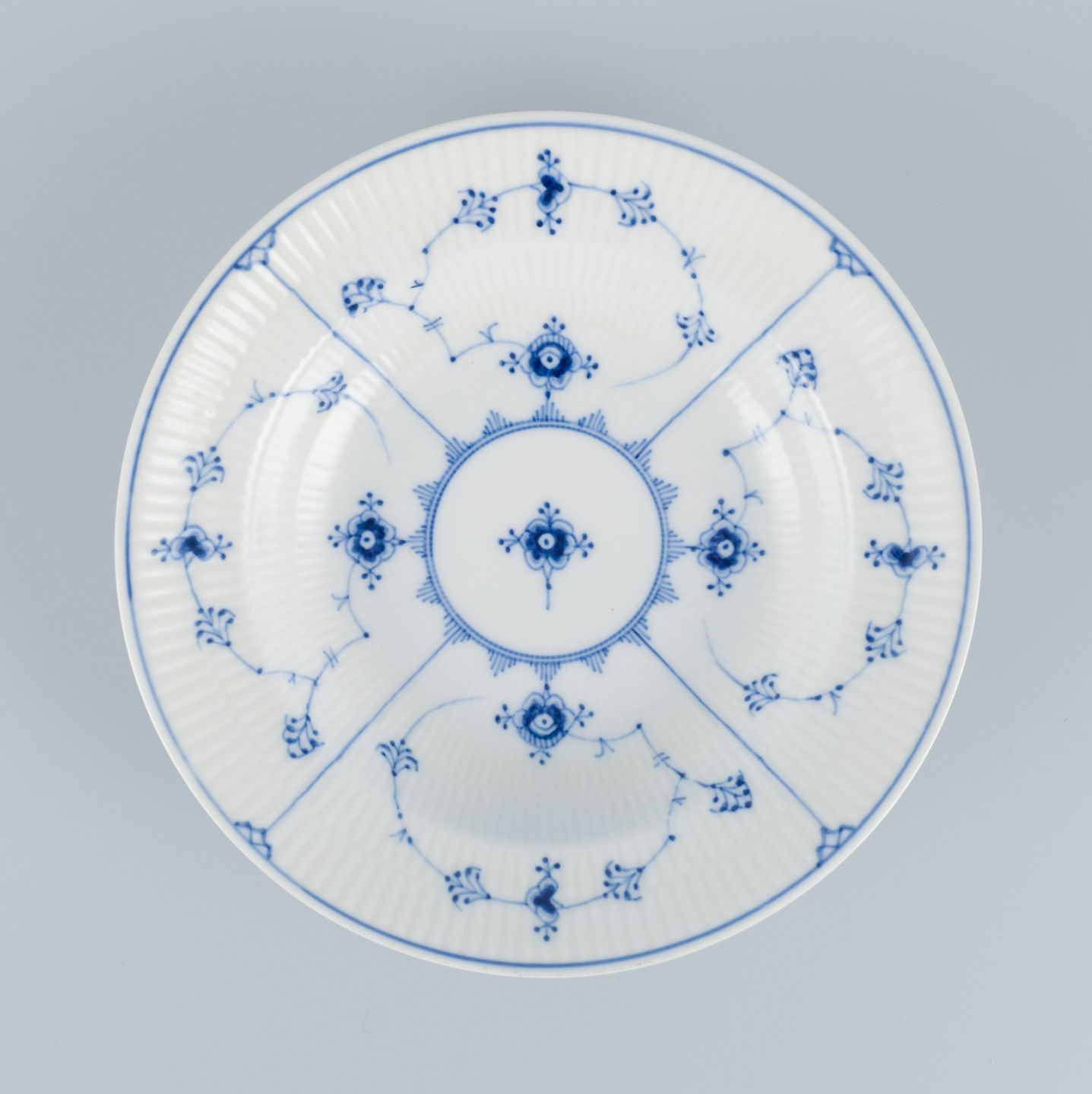Royal Copenhagen, Musselmalet Riflet, et sæt på to dybe tallerkner. Model 1/167. Første sortering. Perfekt stand. Stemplet. Mål: D 23,3 x H 5,0 cm.