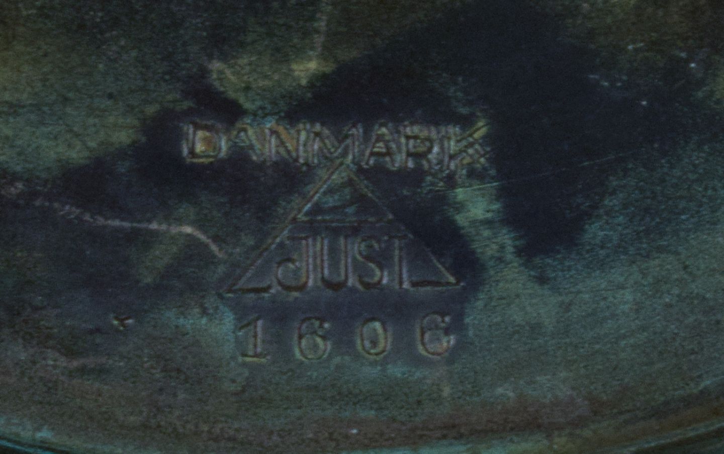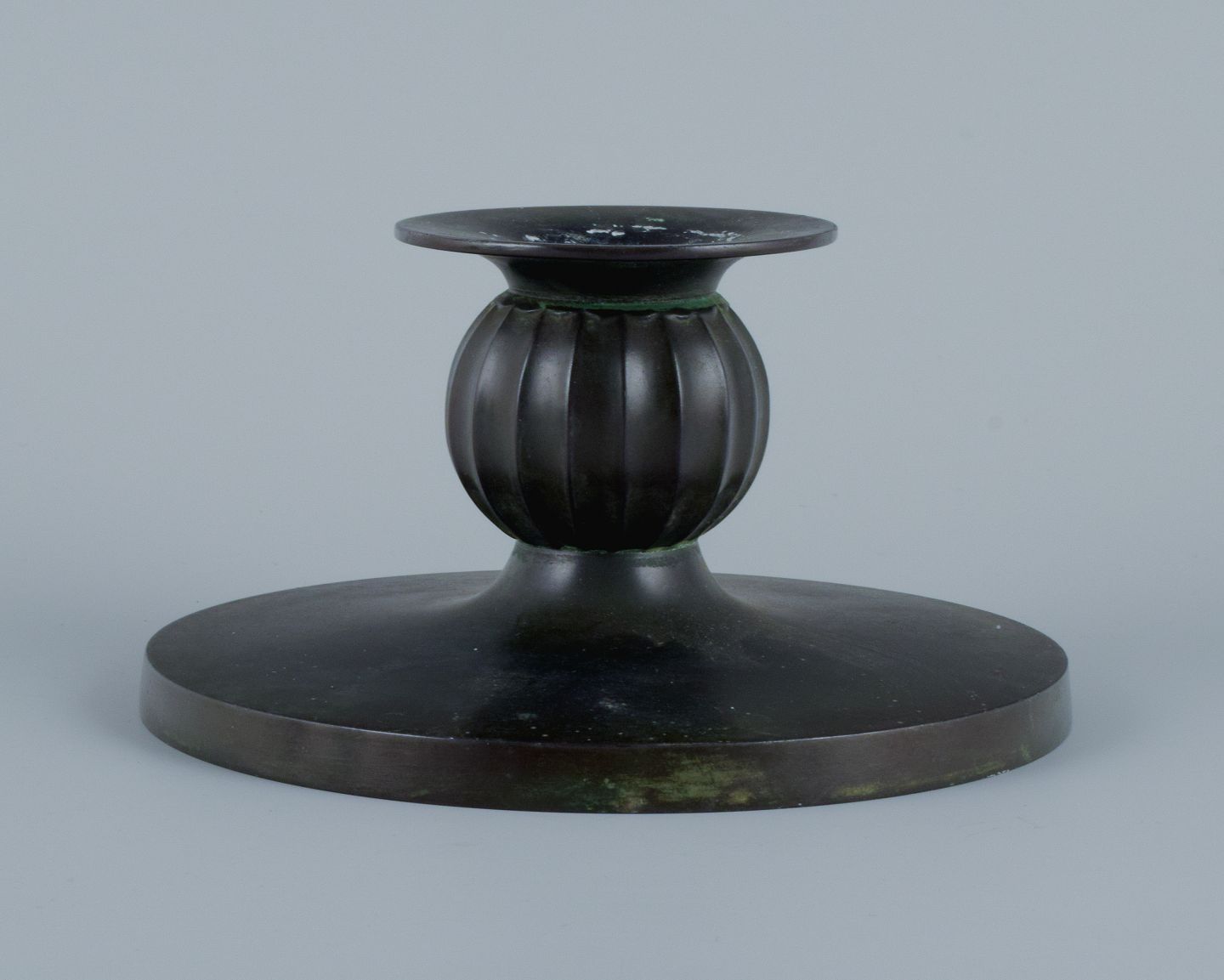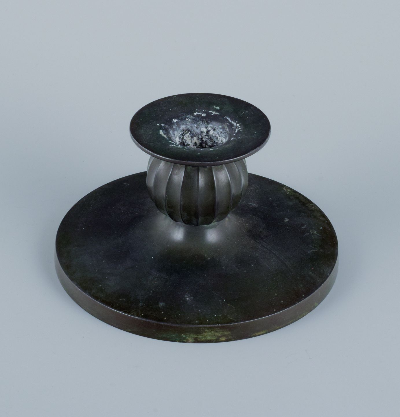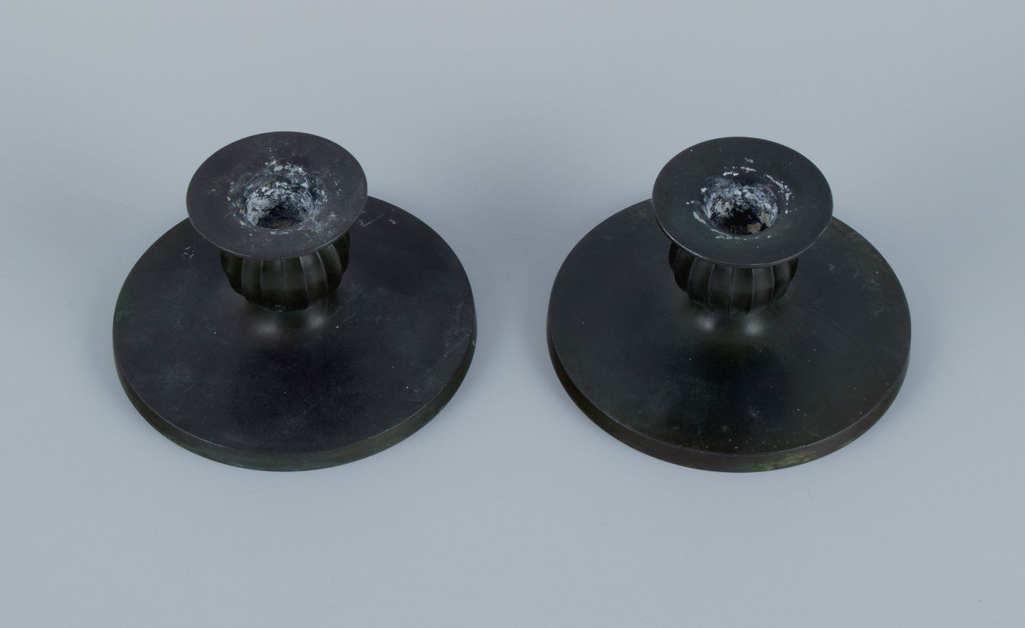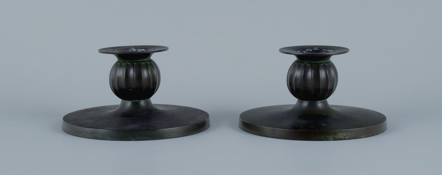 Just Andersen, et par Art Deco stager i diskometal. 1940’erne. Modelnummer 1606. Stemplet. I god stand, brugspræg og enkelte ridser. Mål: D 12,5 x H 7,0 cm.