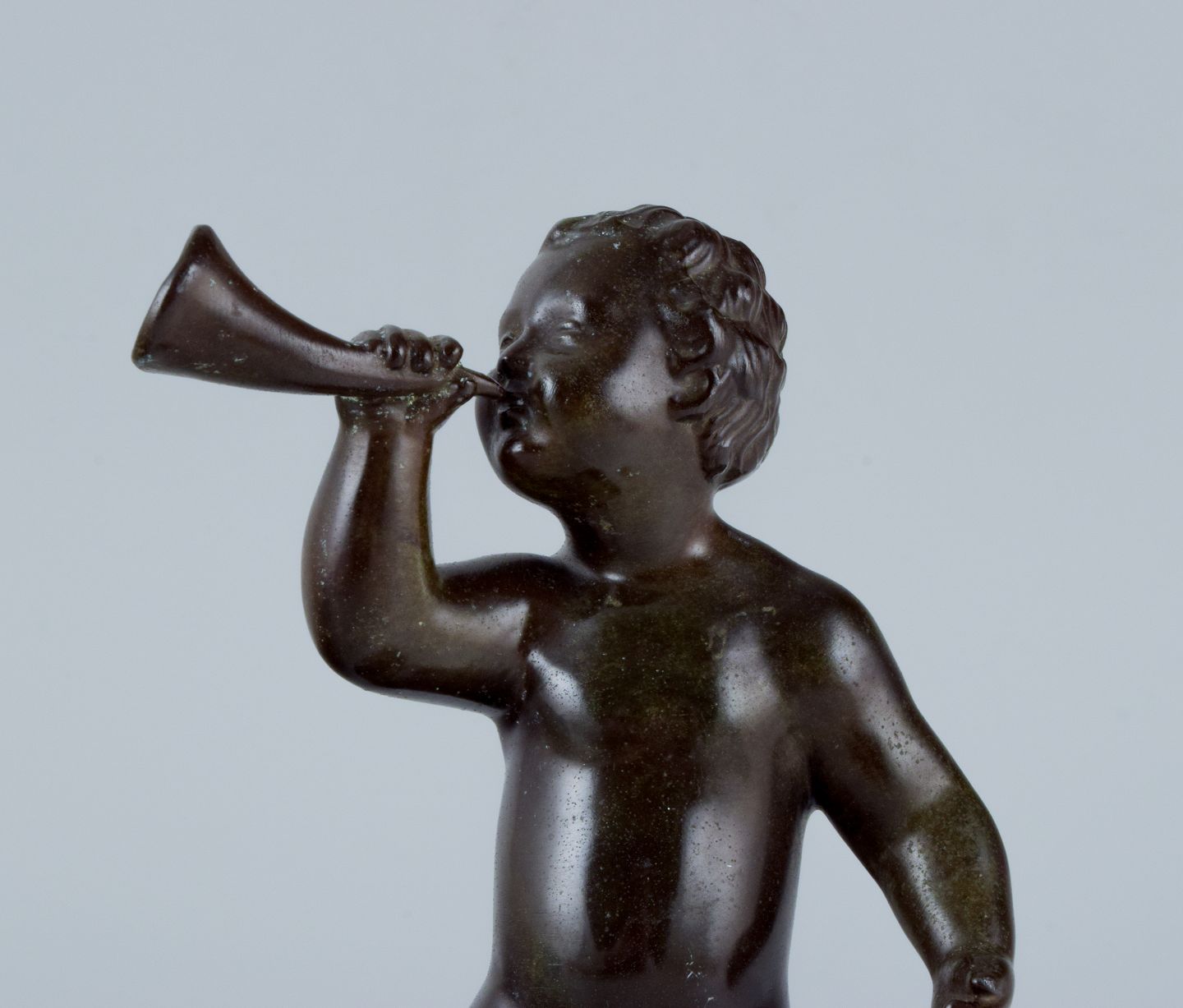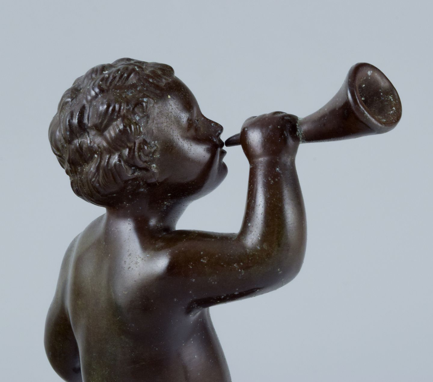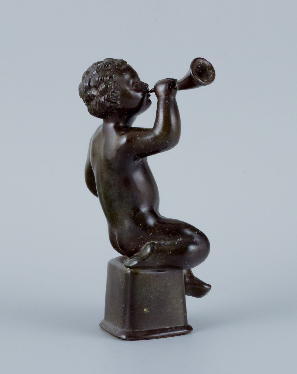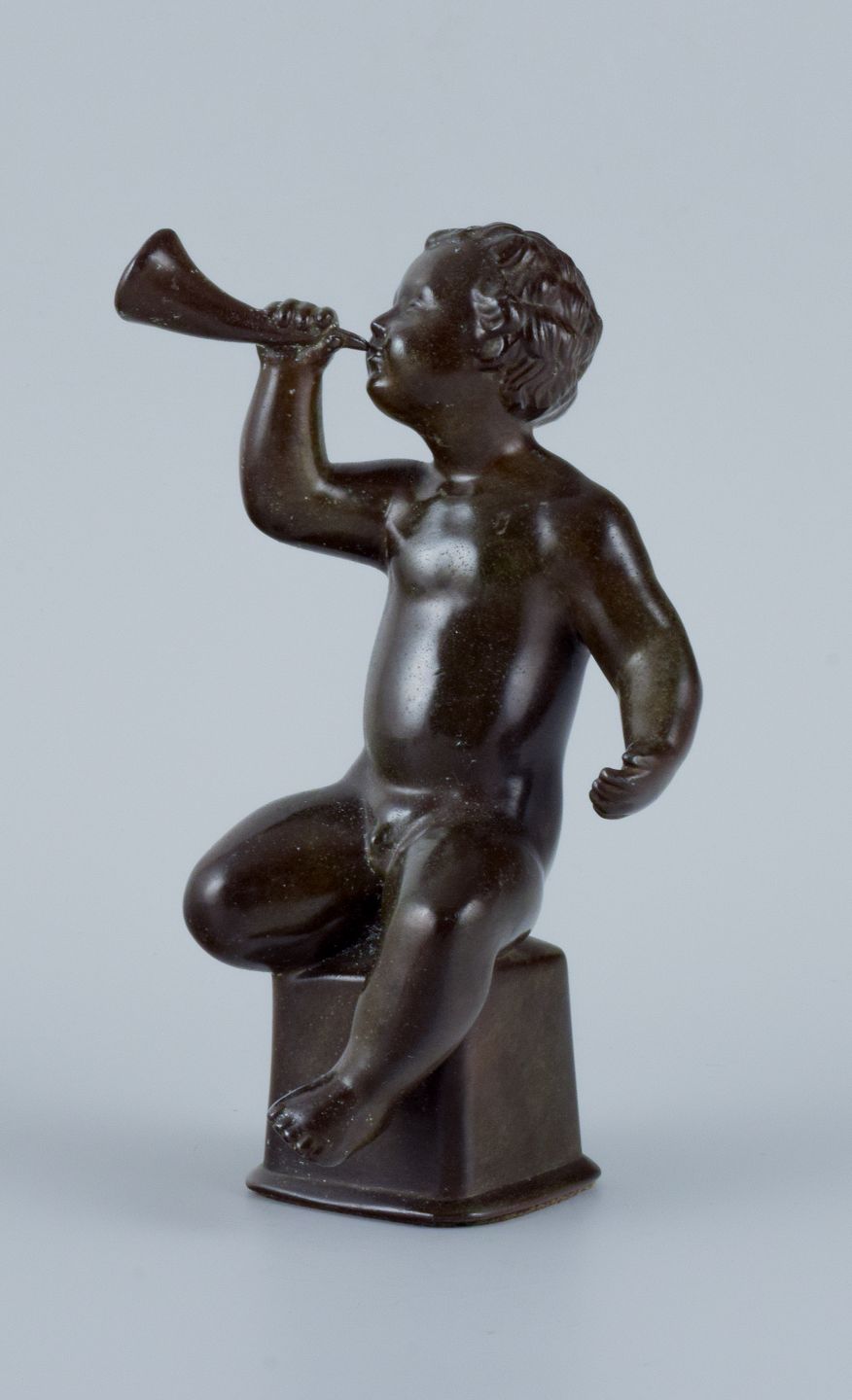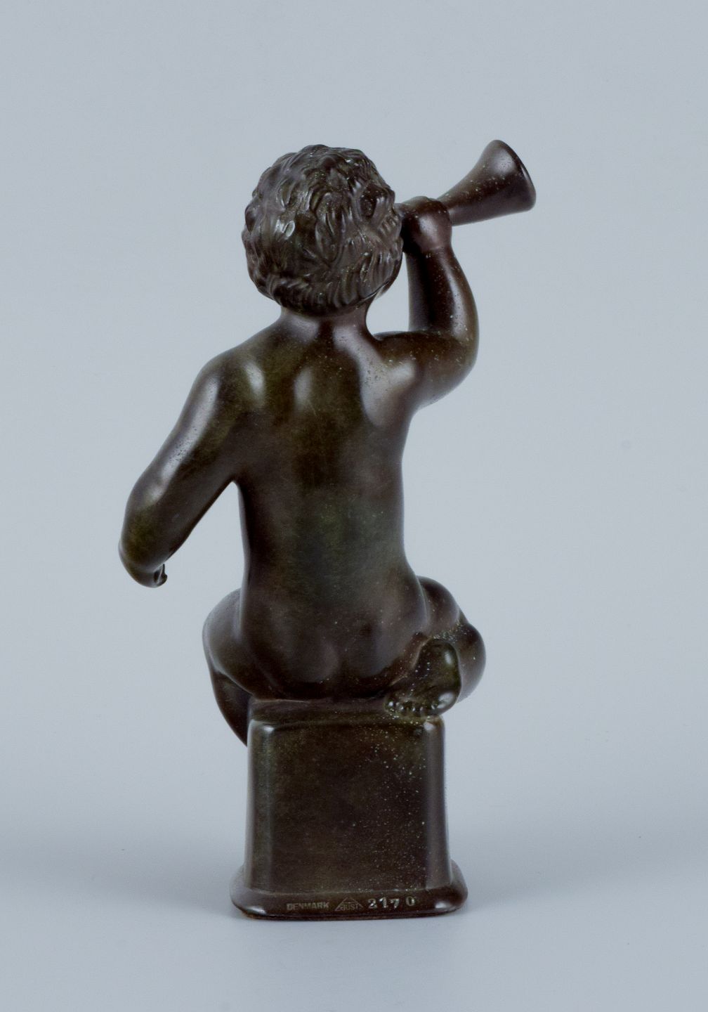 Just Andersen, skulptur i diskometal, nøgen dreng blæser i horn. I flot stand med god patina. 1940’erne. Model 2170. Mål: H 18,0 x D 10,0 cm.