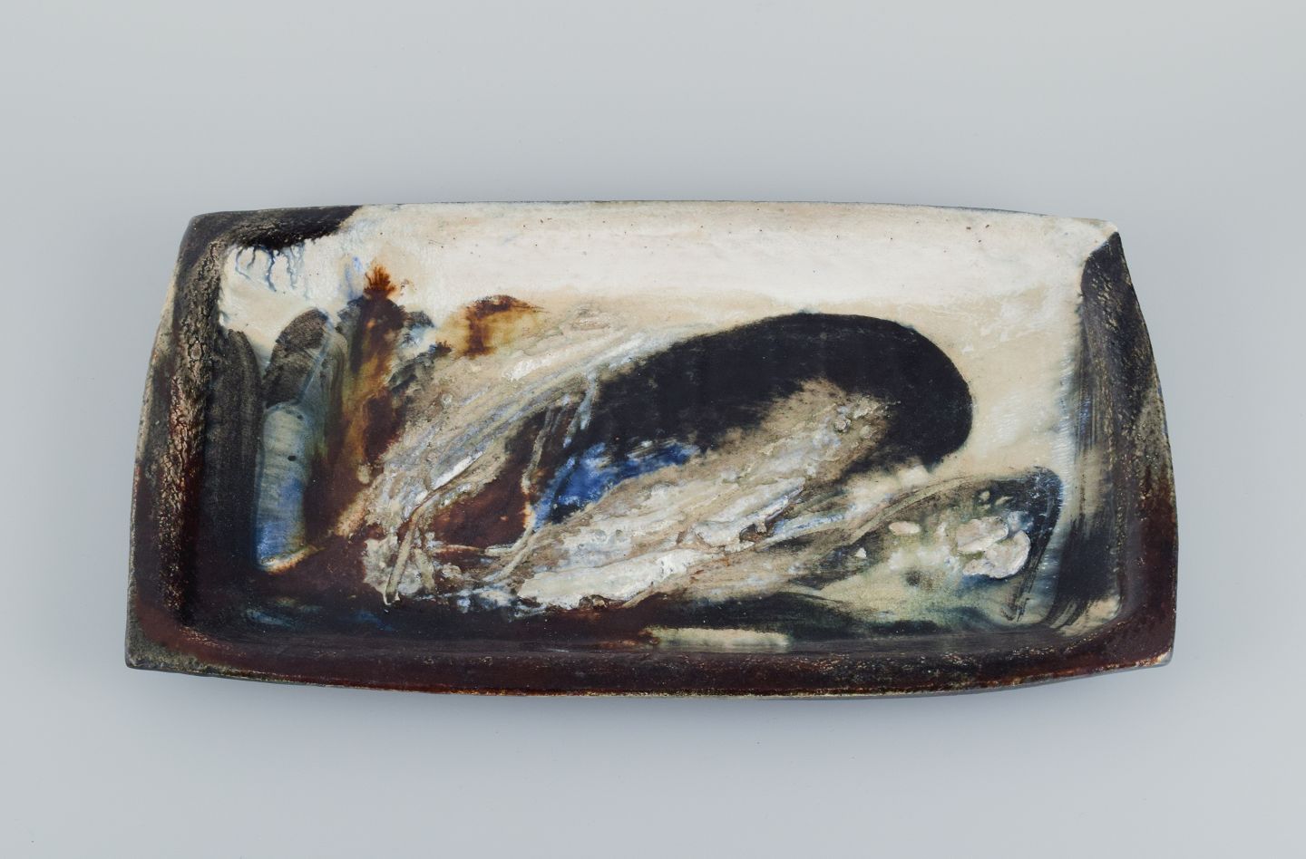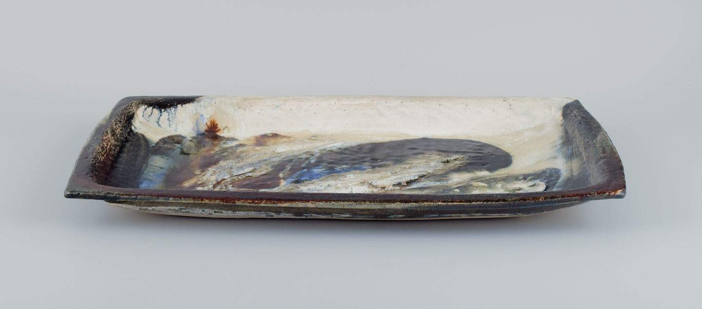 Jeppe Hagedorn-Olsen, unikaskål i stentøj med abstrakte motiver. 1970’erne I perfekt stand. Stemplet. Mål: L 46,0 x B 26,0 x H 3,5 cm.