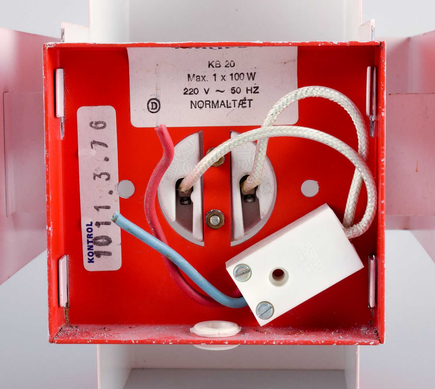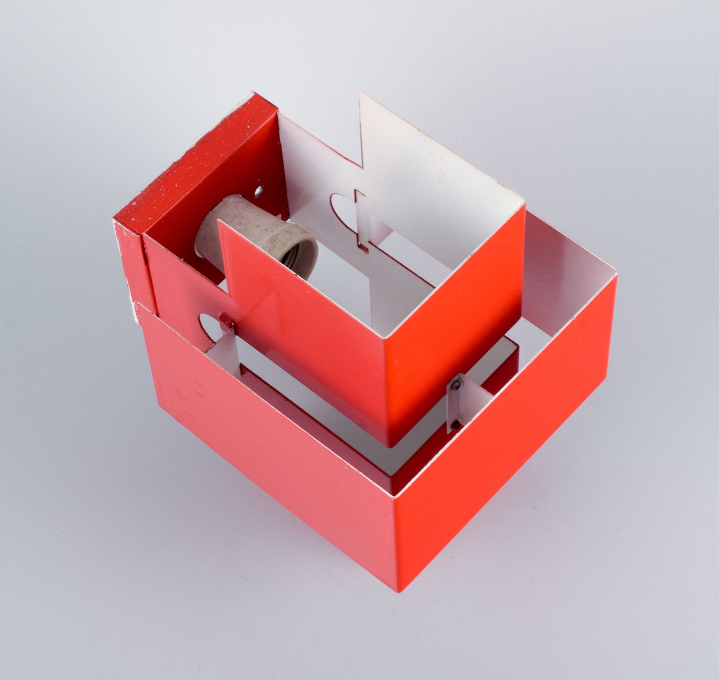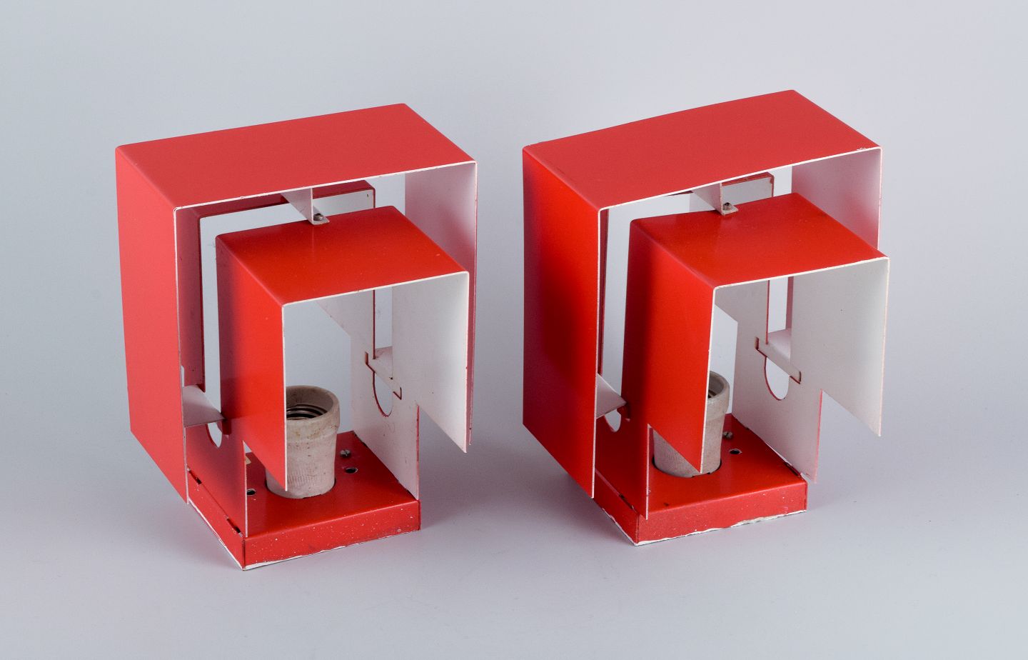 Philips, Holland. Et par væglamper af rødlakeret metal. 1970'erne. Fremstår med brugsspor. Mål: H 20,0 x D 20,0 cm.