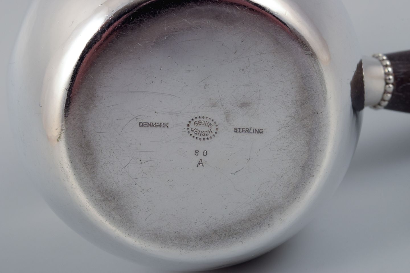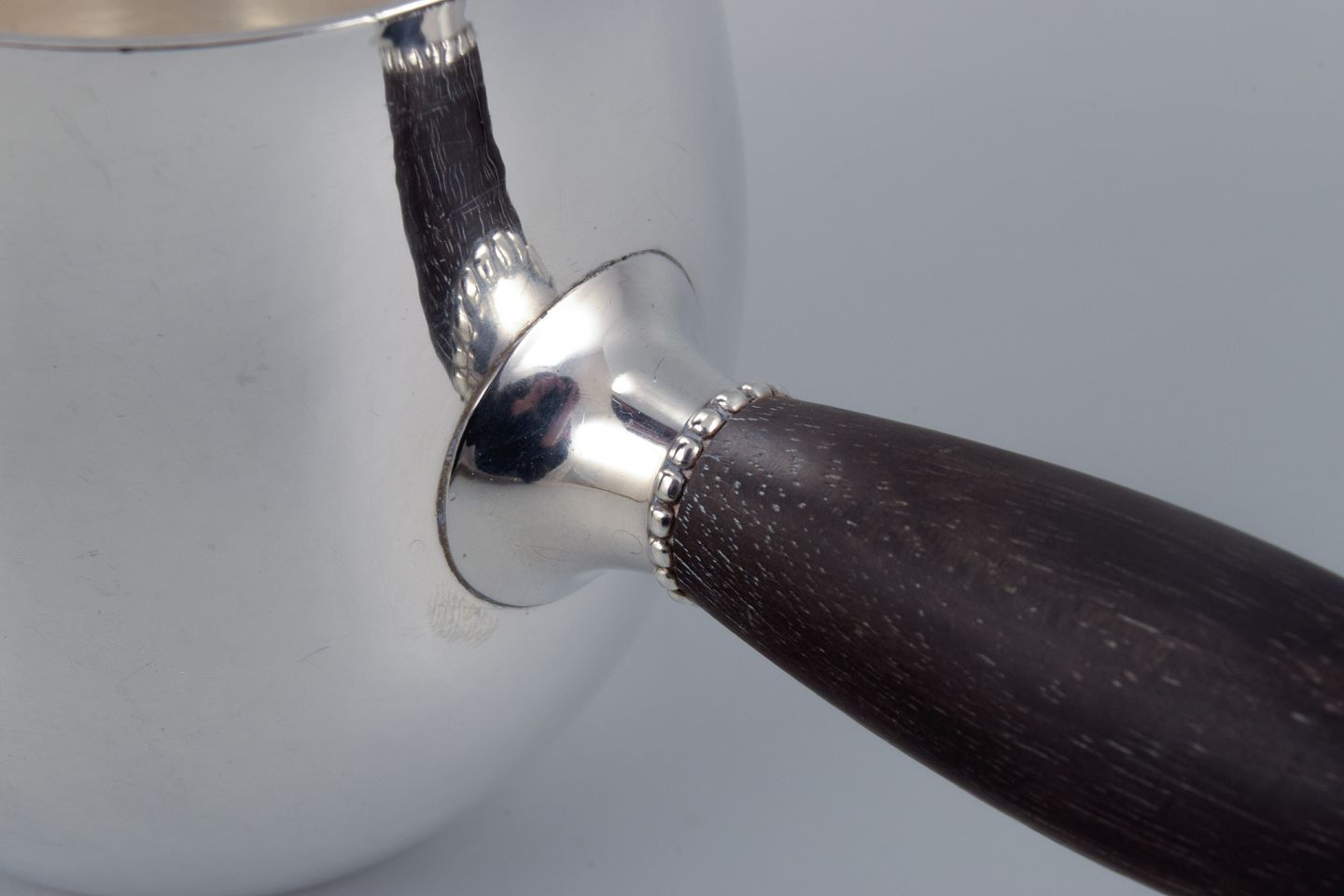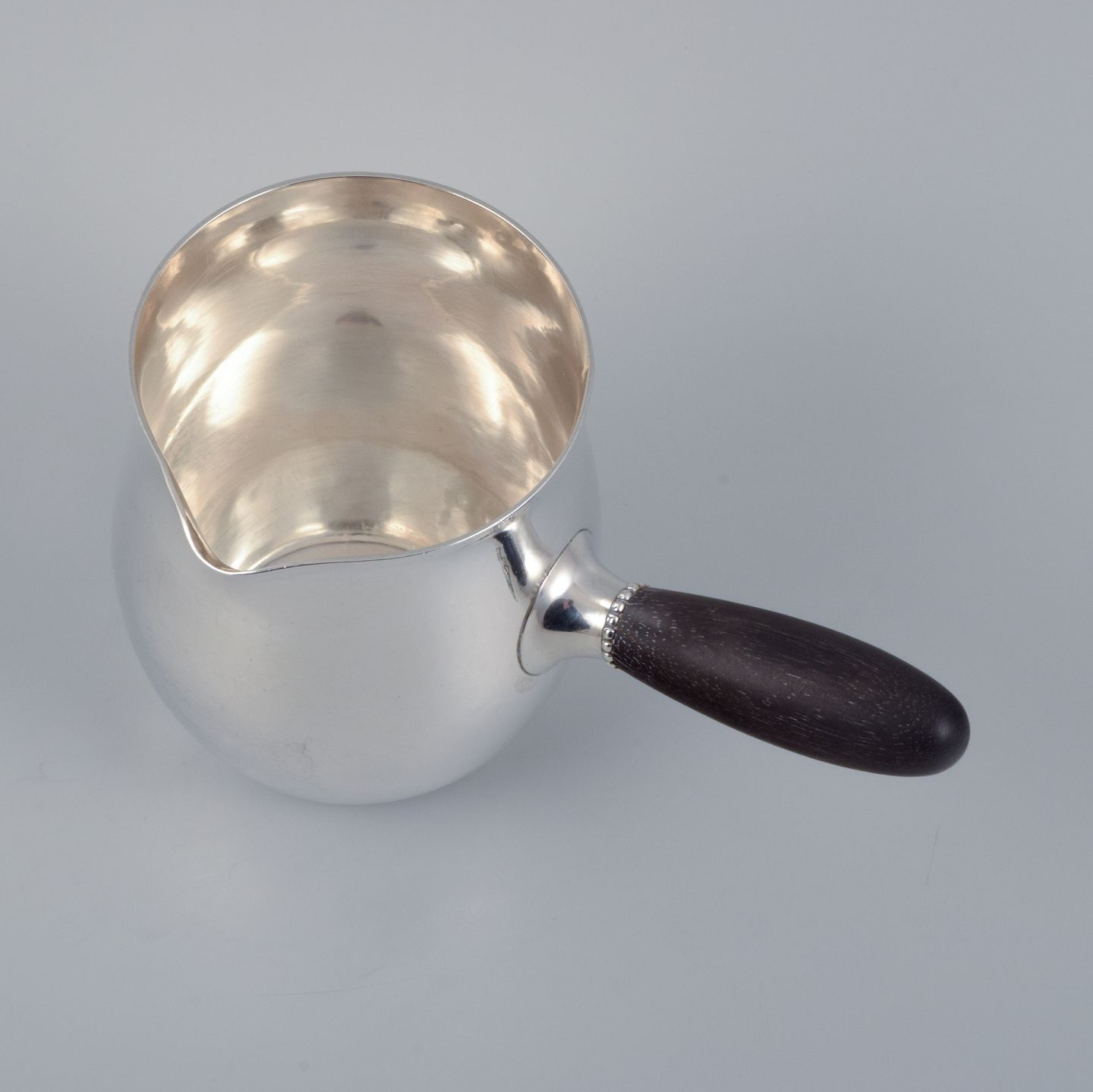 Georg Jensen art nouveau mælkekande i sterlingsølv med hank i ibenholt. Modelnummer 80A. Designet i 1915. I flot stand. Stemplet. Mål: H 9,2 x D 7,8 cm.