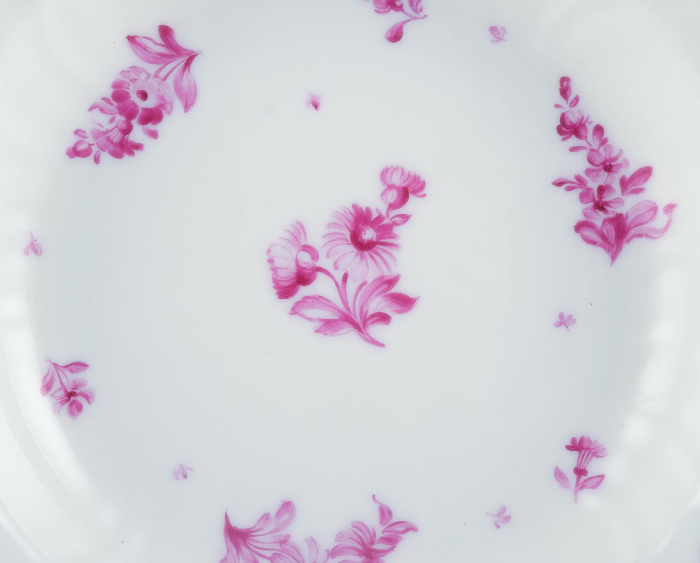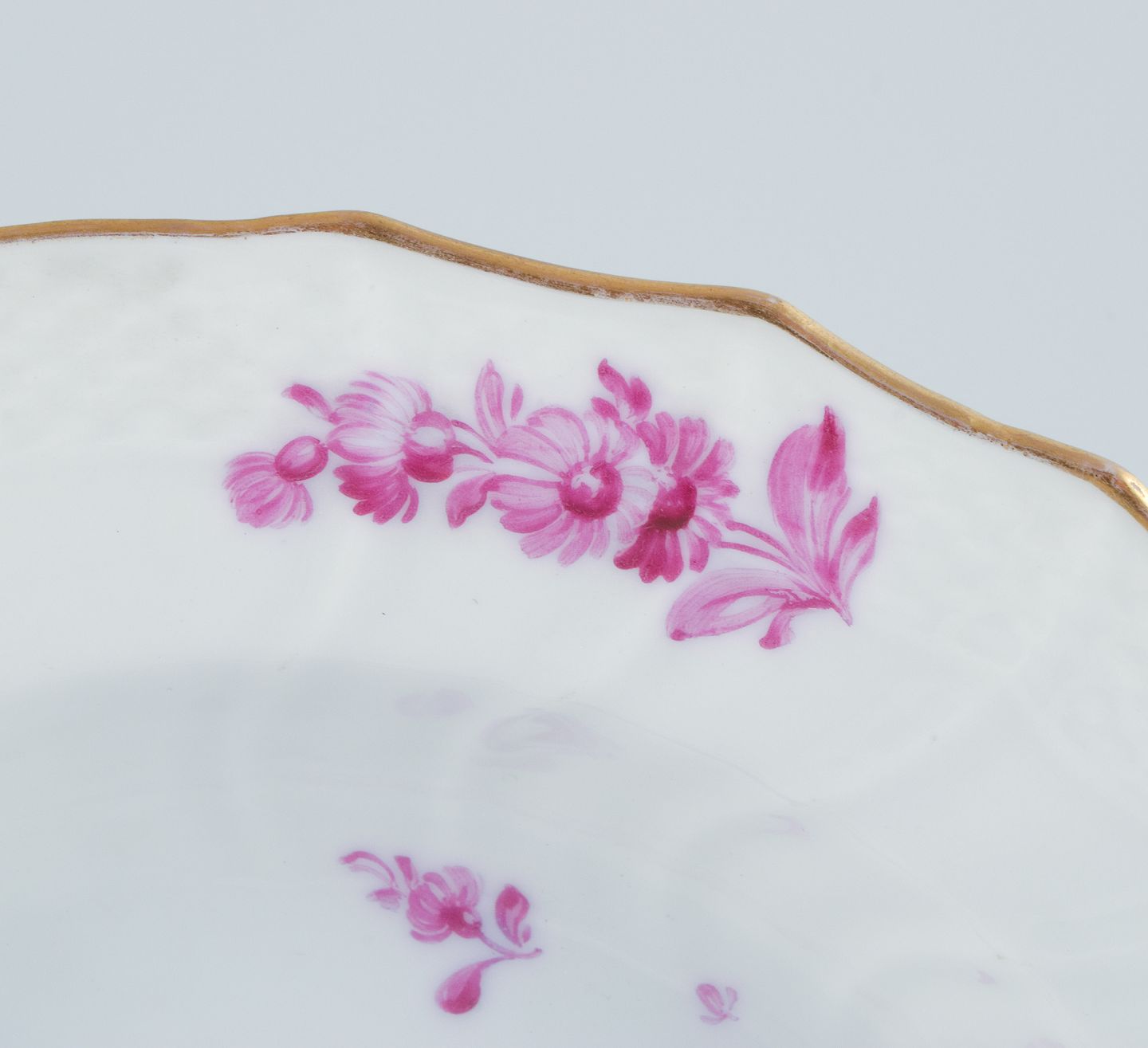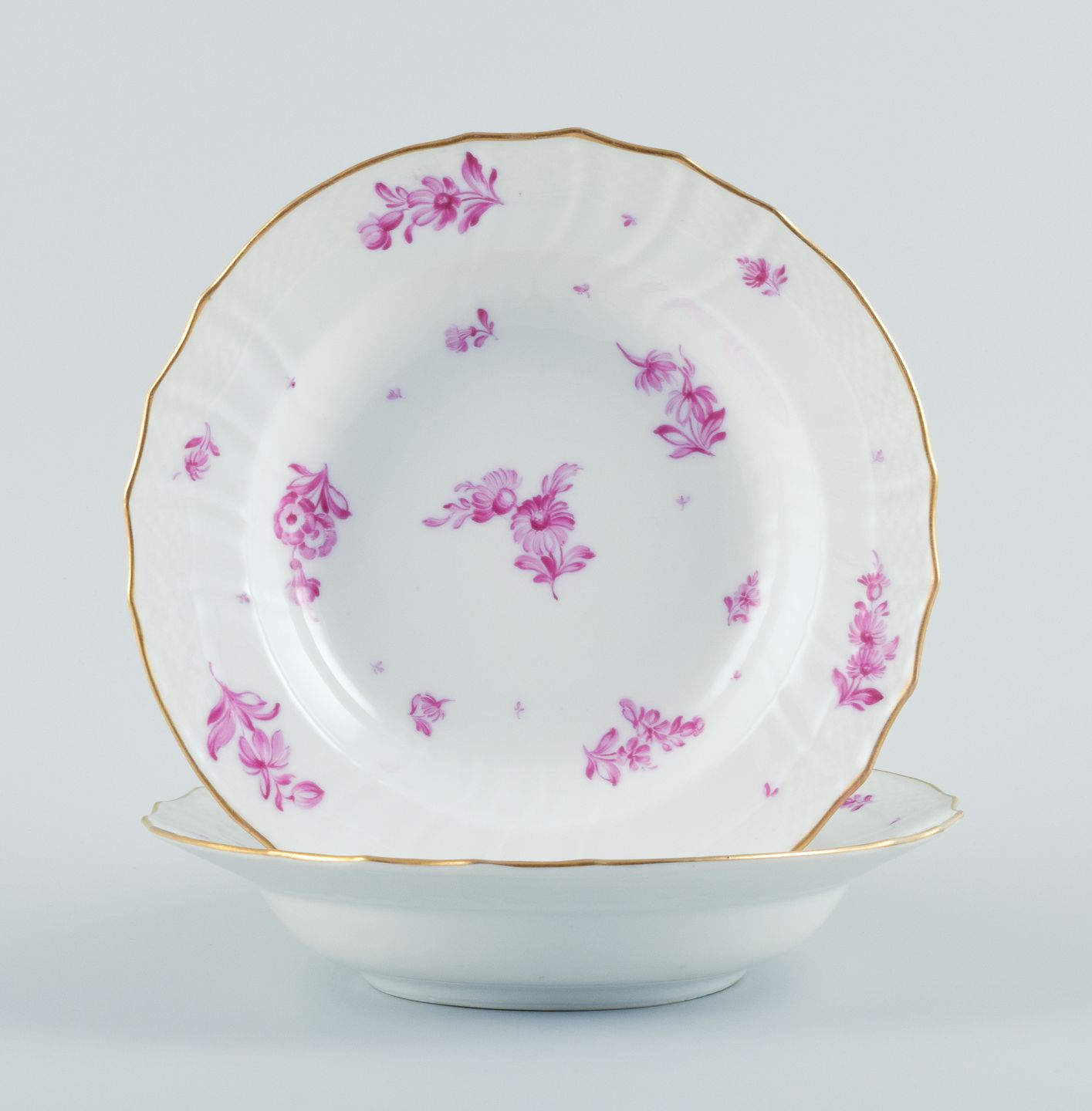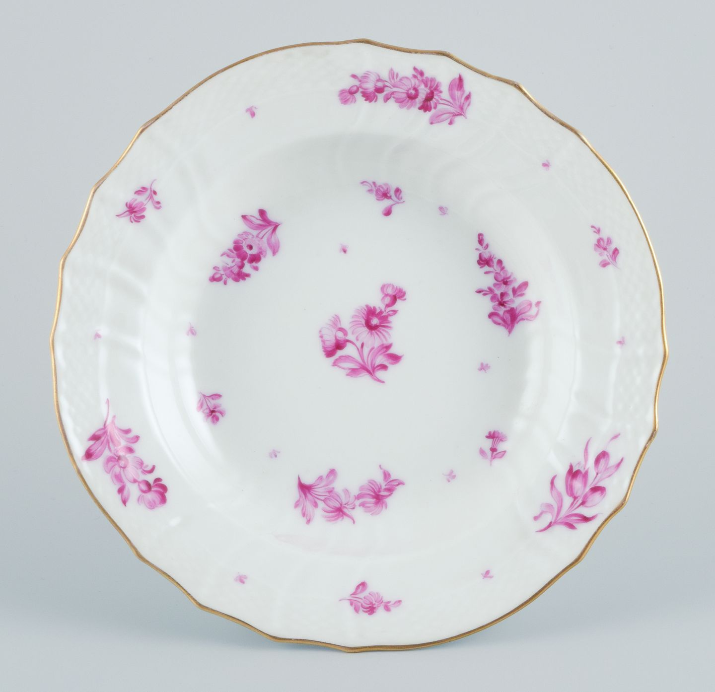 Royal Copenhagen, to dybe tallerkner håndmalet med purpur blomster og guldkant. Ca. 1900. Første sortering. I flot stand. Mål: D 22,5 x H 5,0 cm.