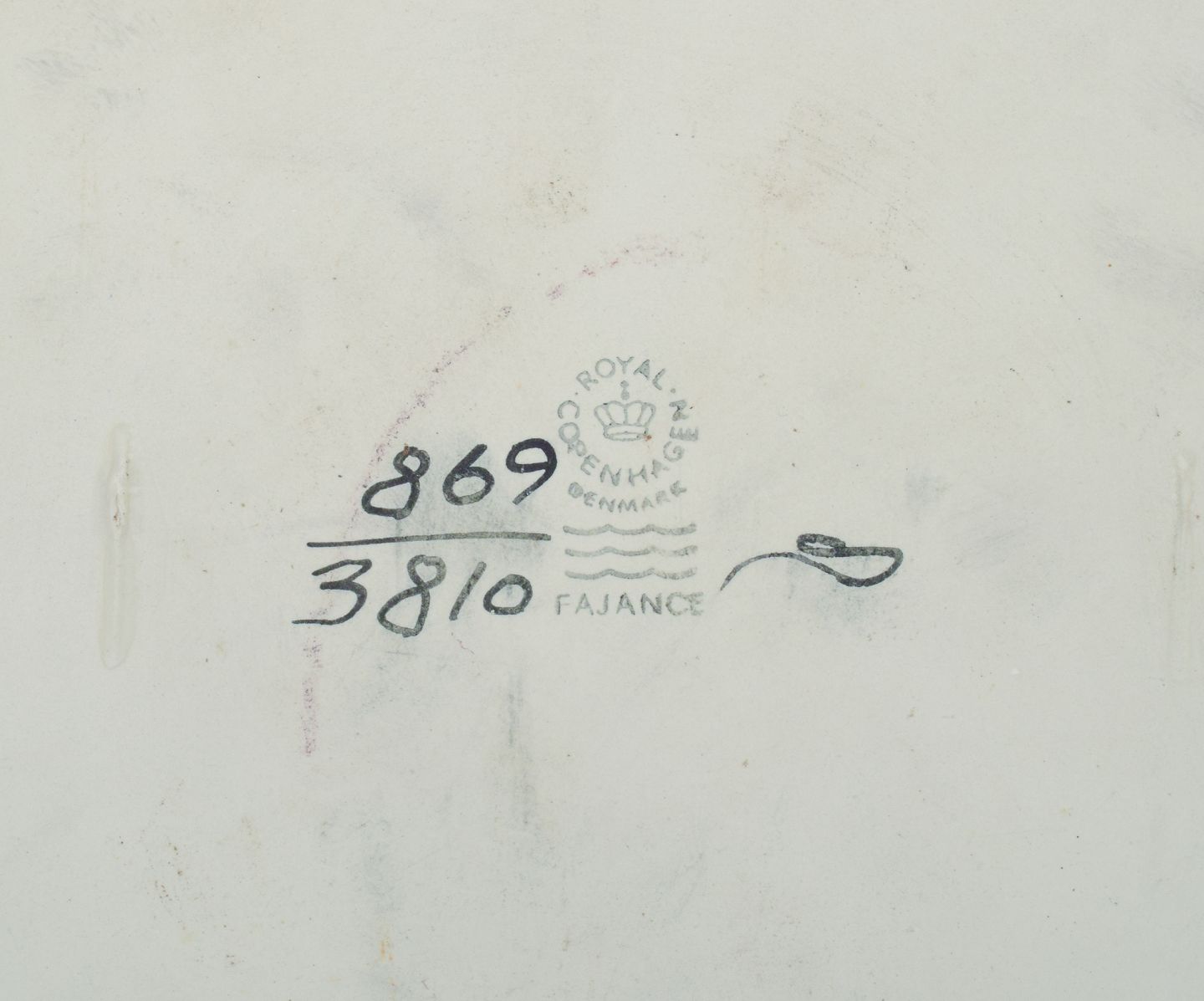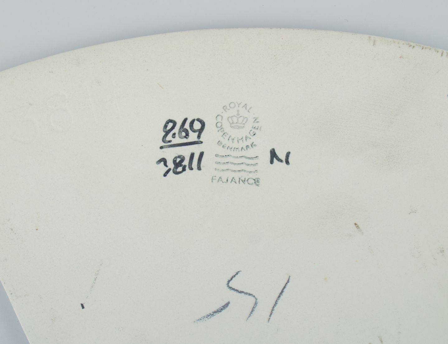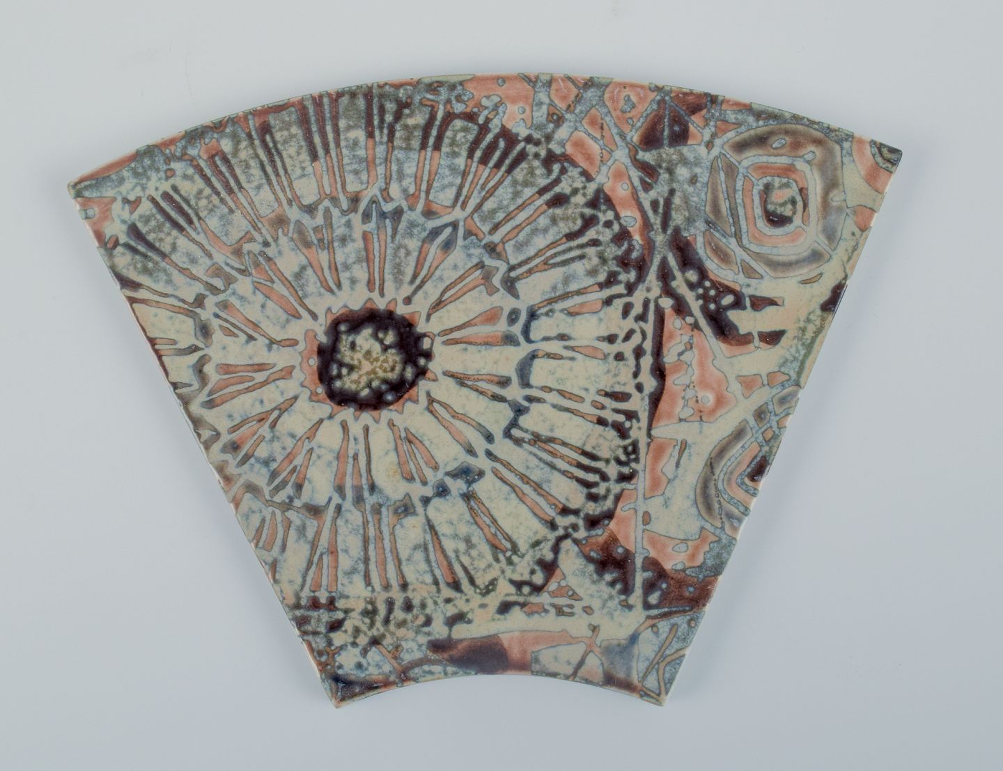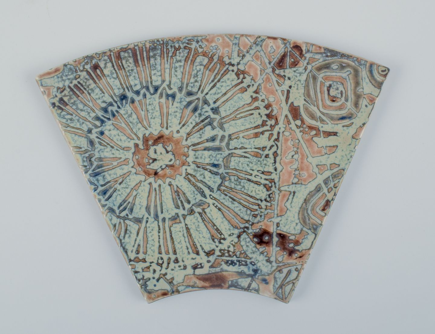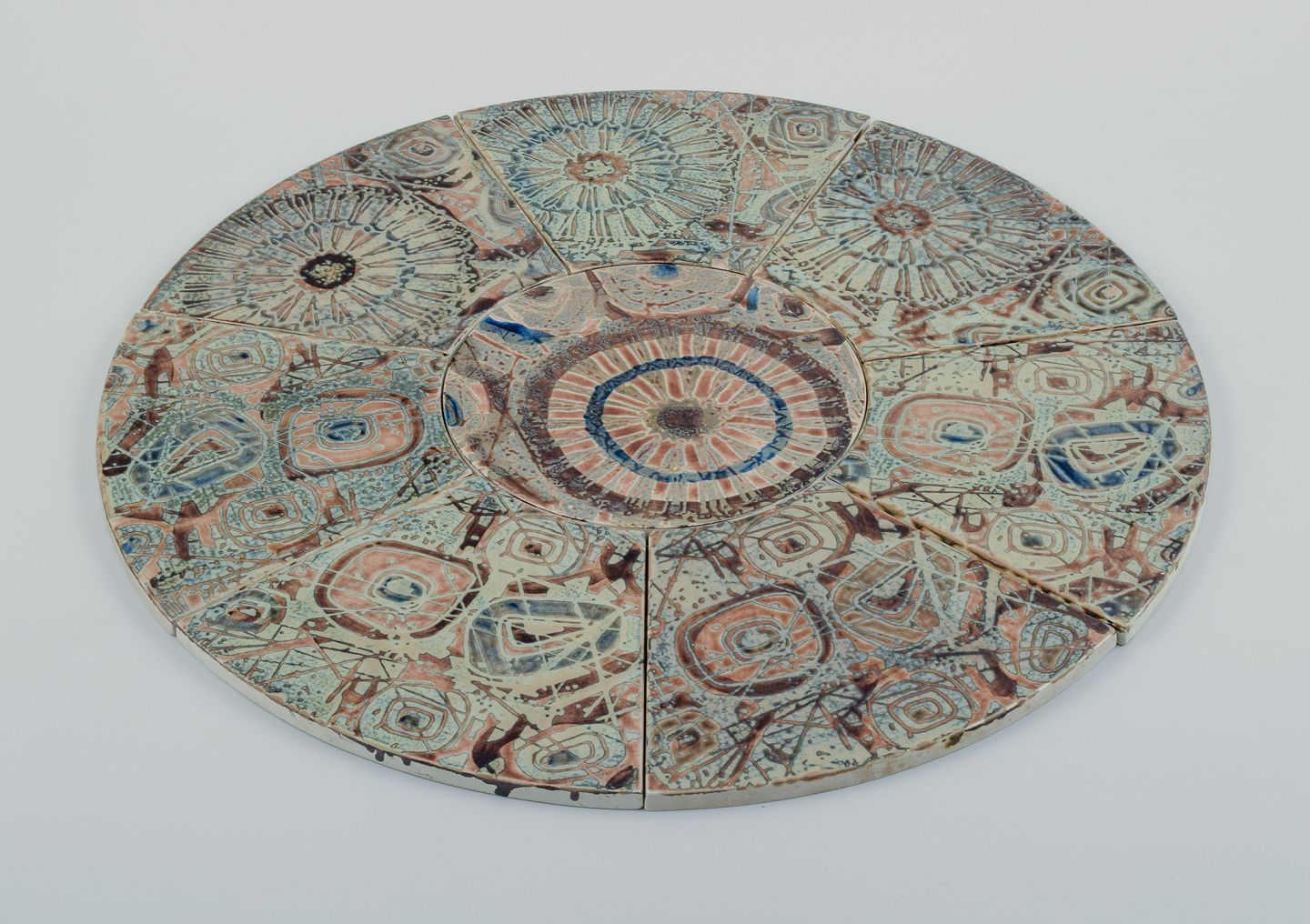 Royal Copenhagen, otte Baca fajancekakler med mønstret glasur i brun, blå, grøn og sandfarver.