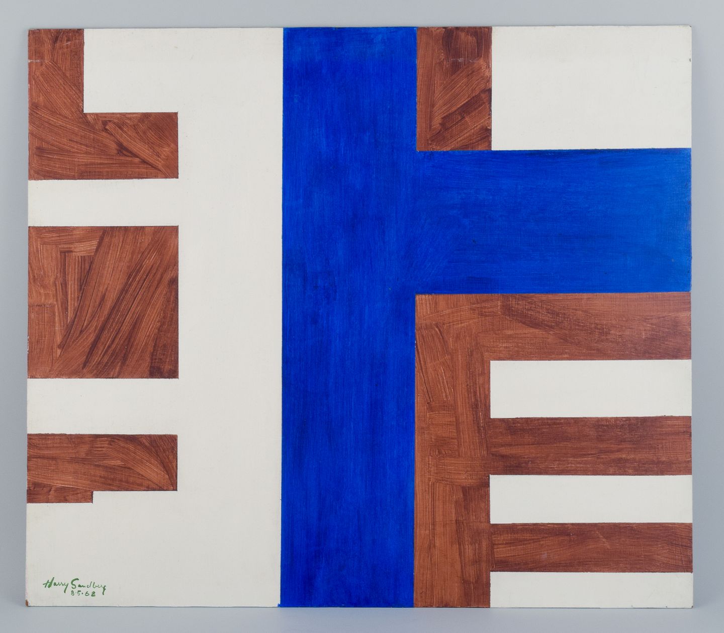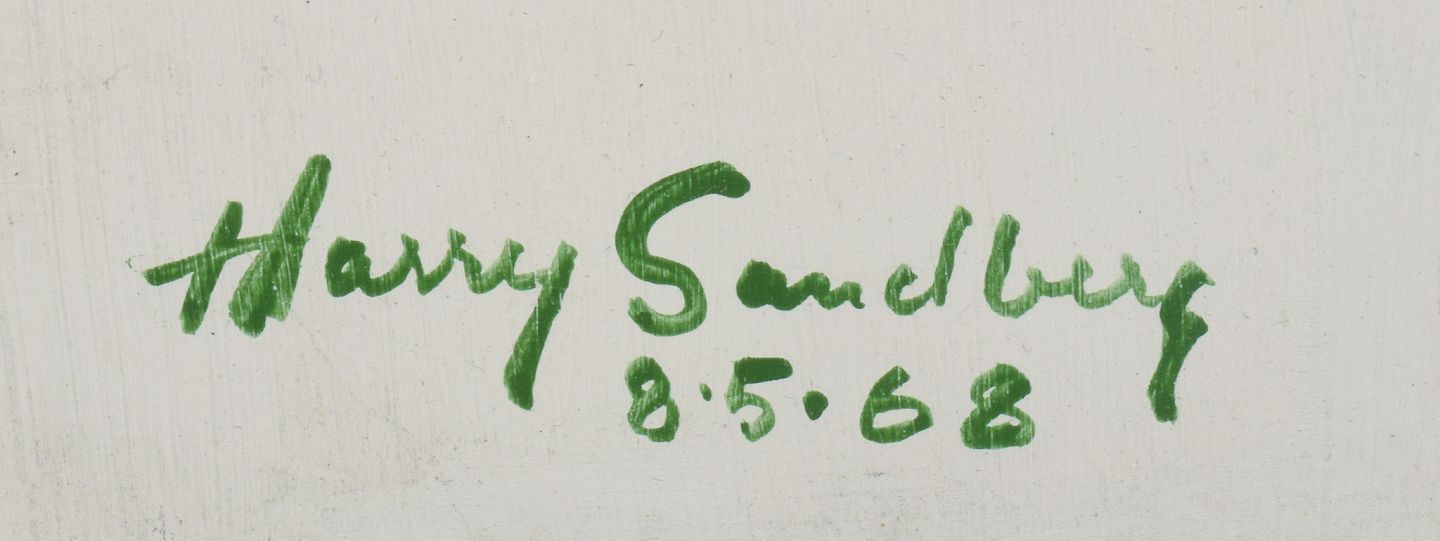 Harry Sandberg, svensk kunstner, abstrakt komposition. Olie på plade. 1968. Signeret. I flot stand. Mål: B 70 cm. x H 61 cm.