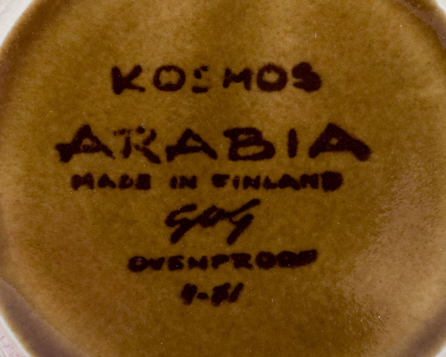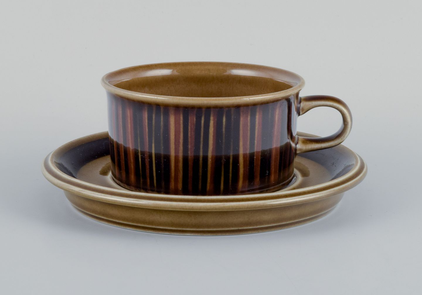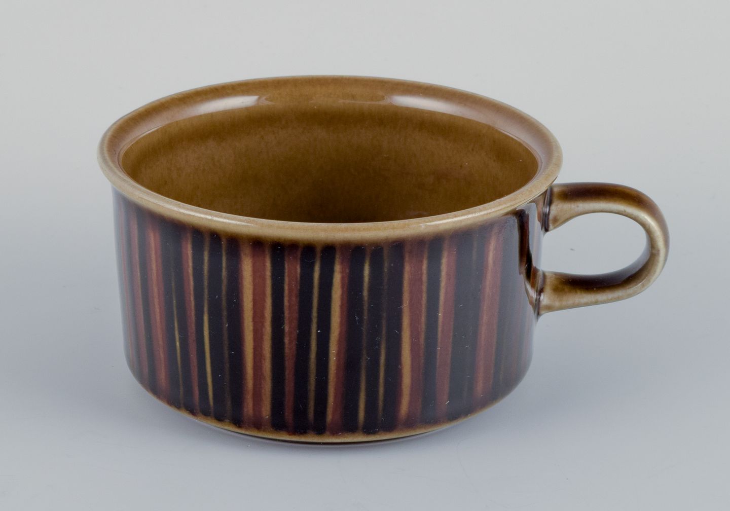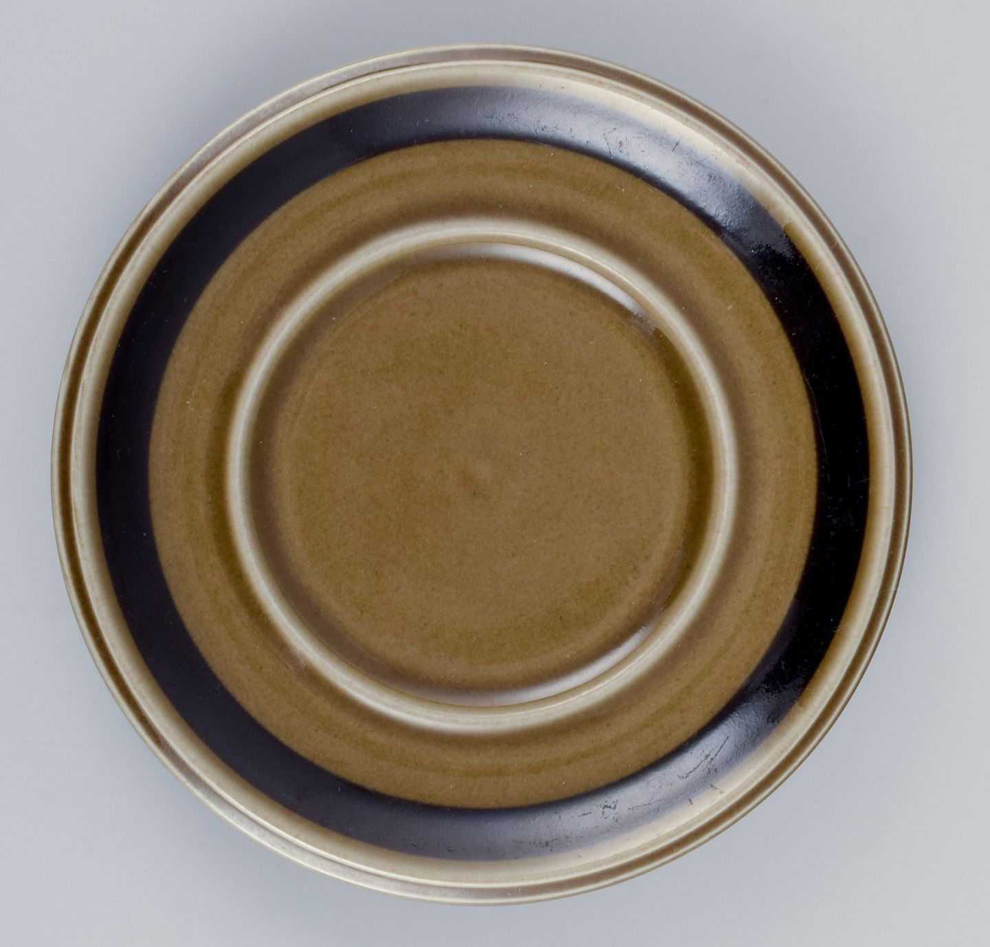 Gunvor Olin-Grönqvist for Arabia. ”Cosmos”, tre par tekopper med tilhørende underkopper. Stentøj i retrostil. Glasur i grønbrune toner.