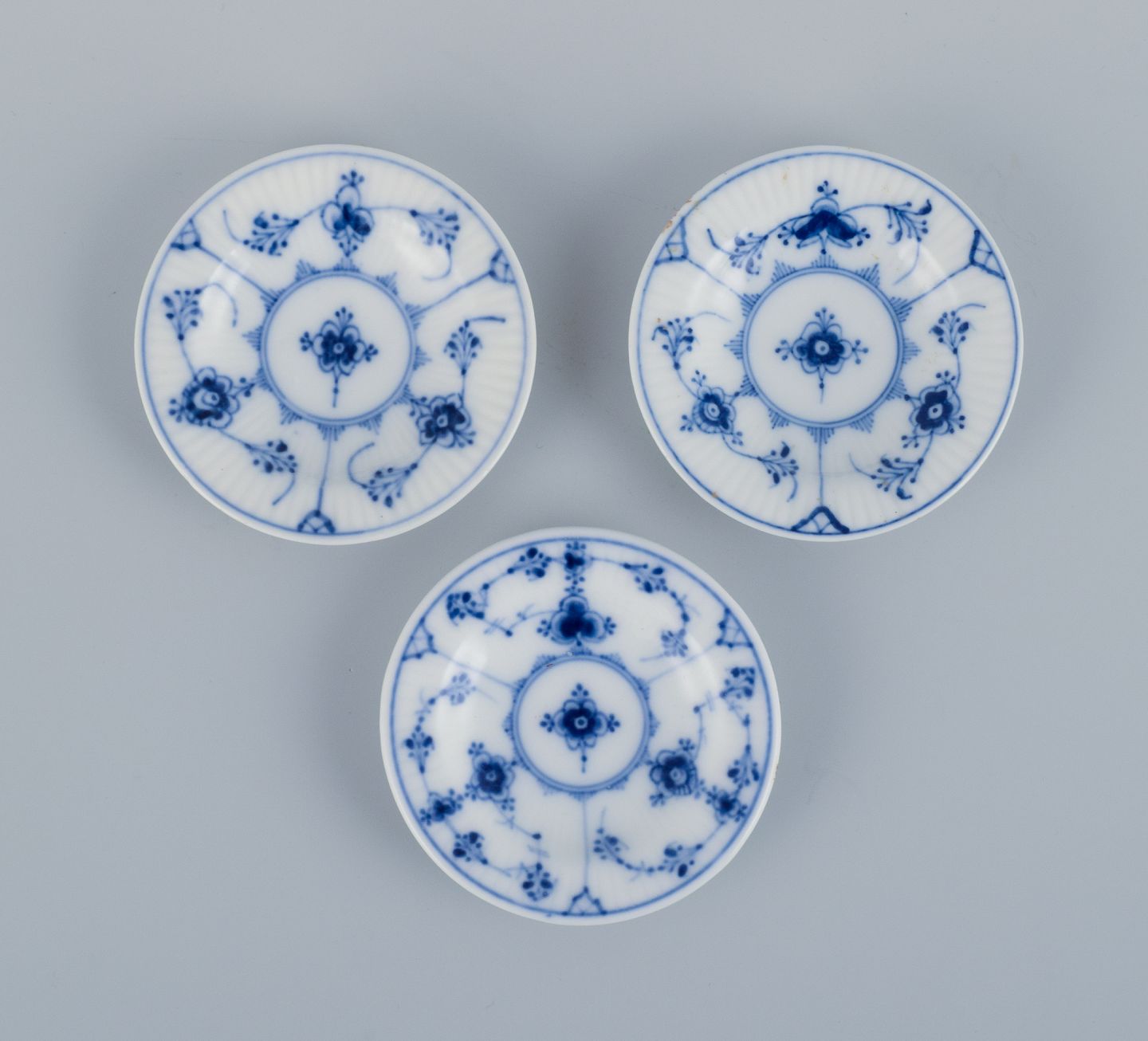 Royal Copenhagen Musselmalet Riflet, tre kaviarskåle. Modelnummer: 1/7 og 1/420 Ca. 1920. Stemplet. Første sortering. Perfekt stand. Mål: D 7,2 cm.