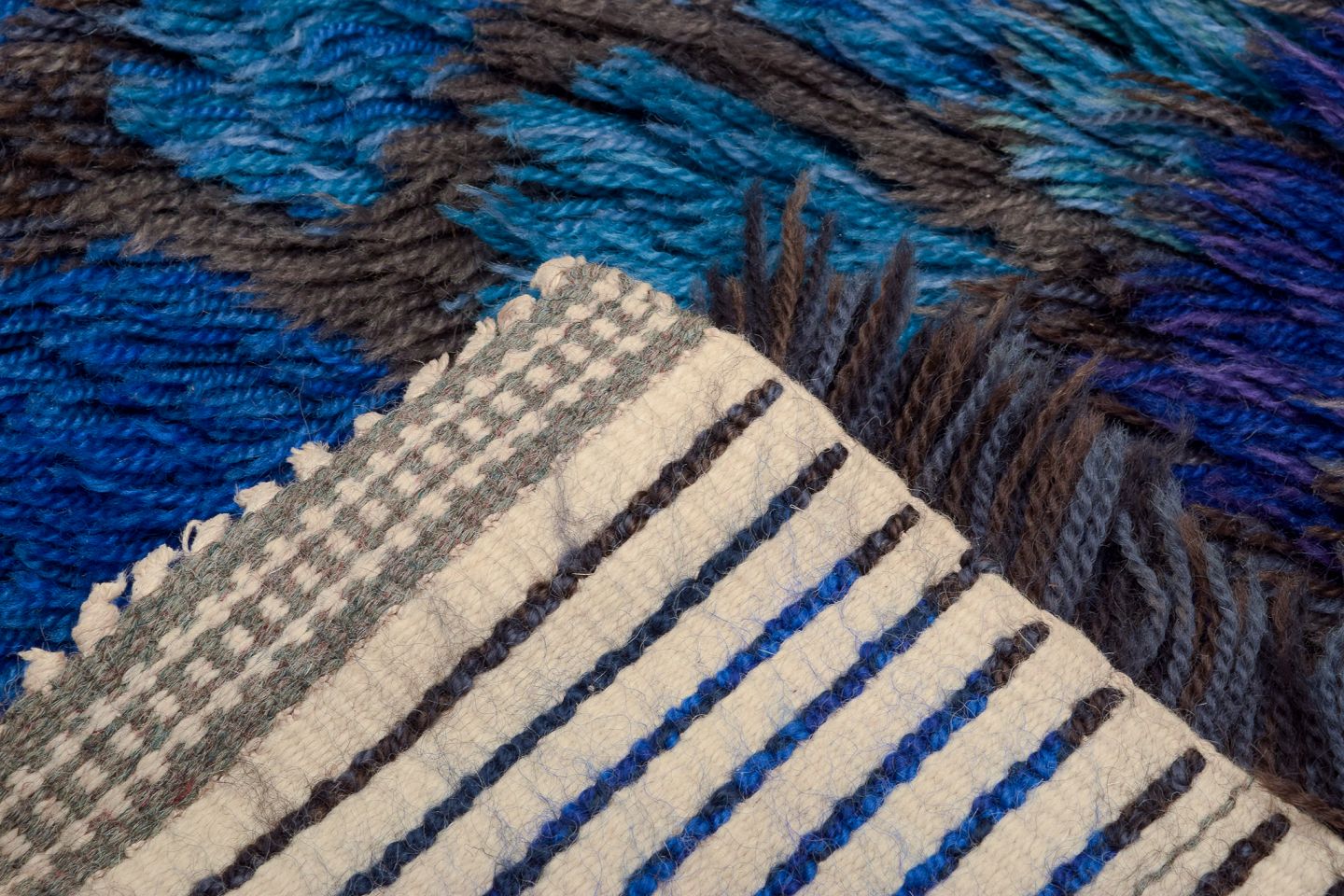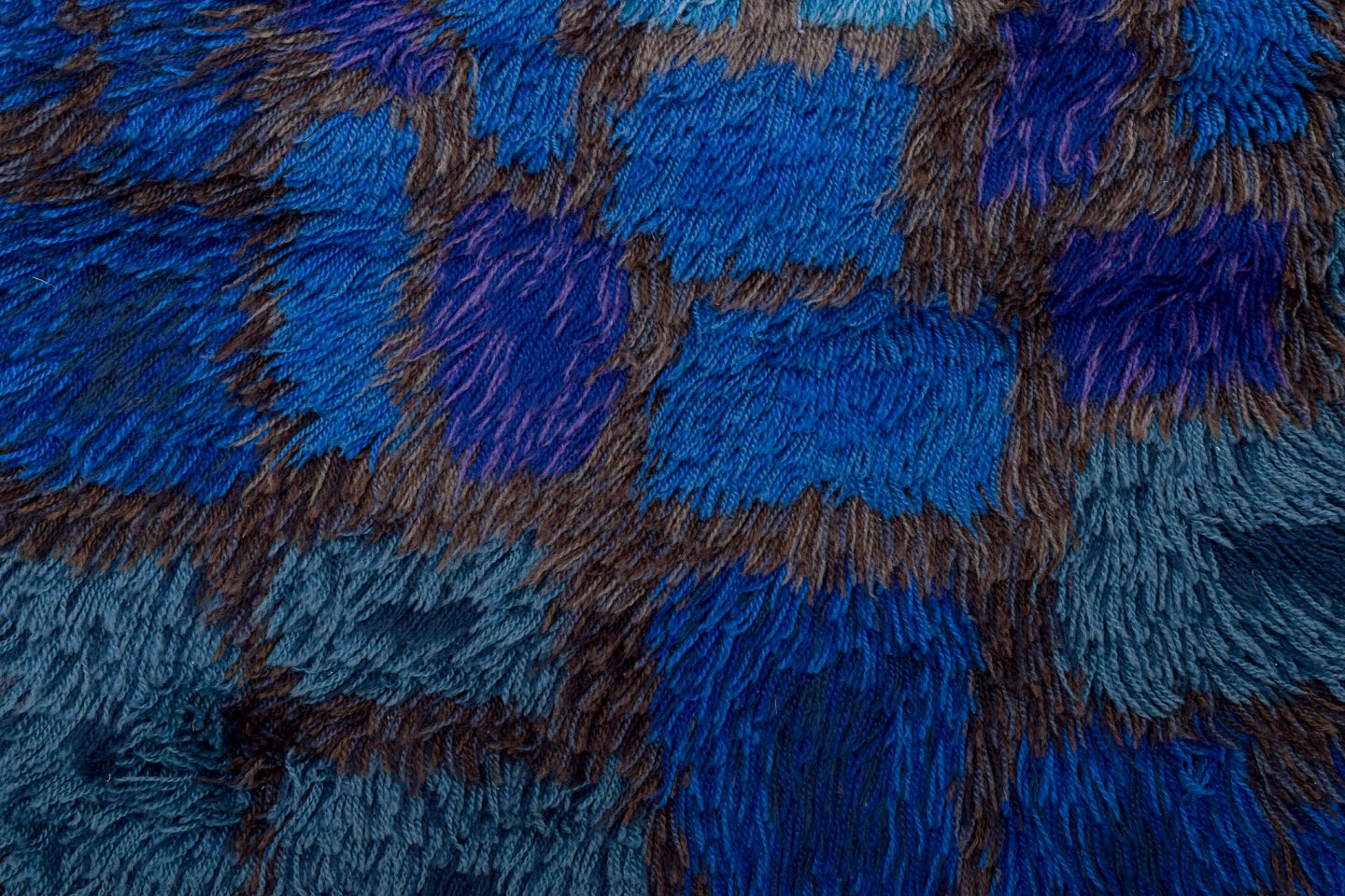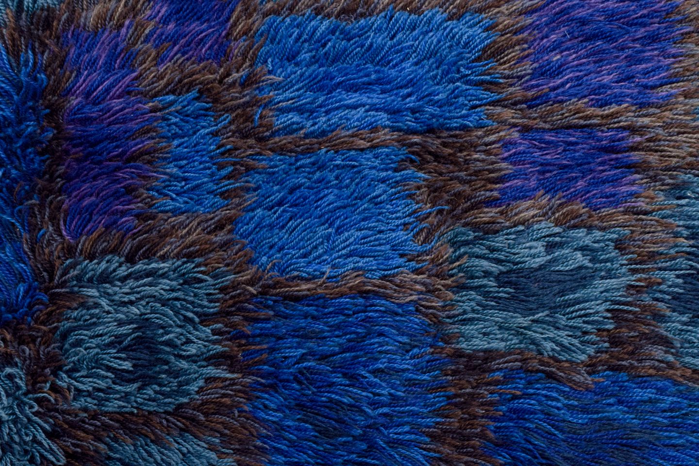 Sverige, ryatæppe i blå nuancer. Geometriske felter. Modernistisk design. 1970’erne. I flot stand. Mål: 133 cm. x 78 cm.