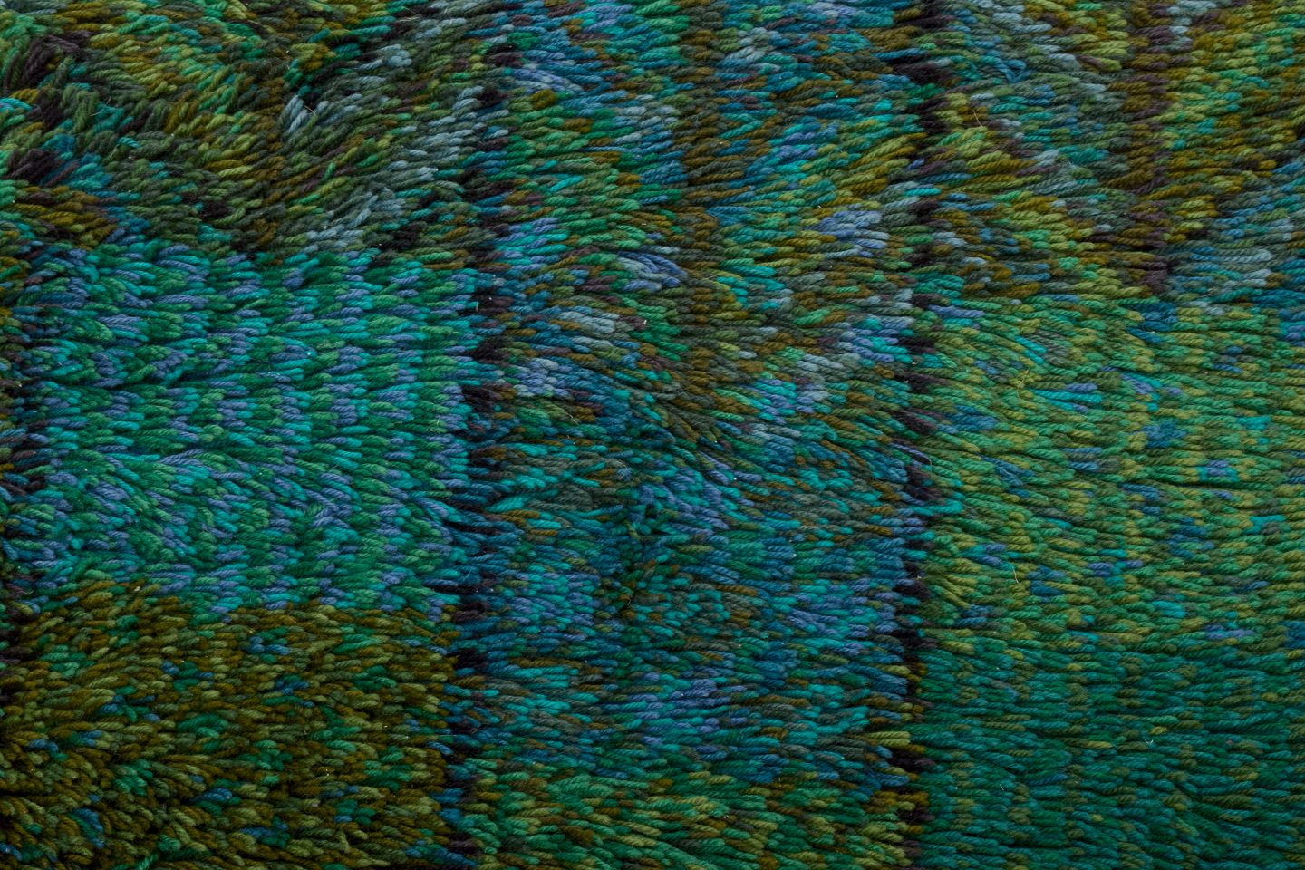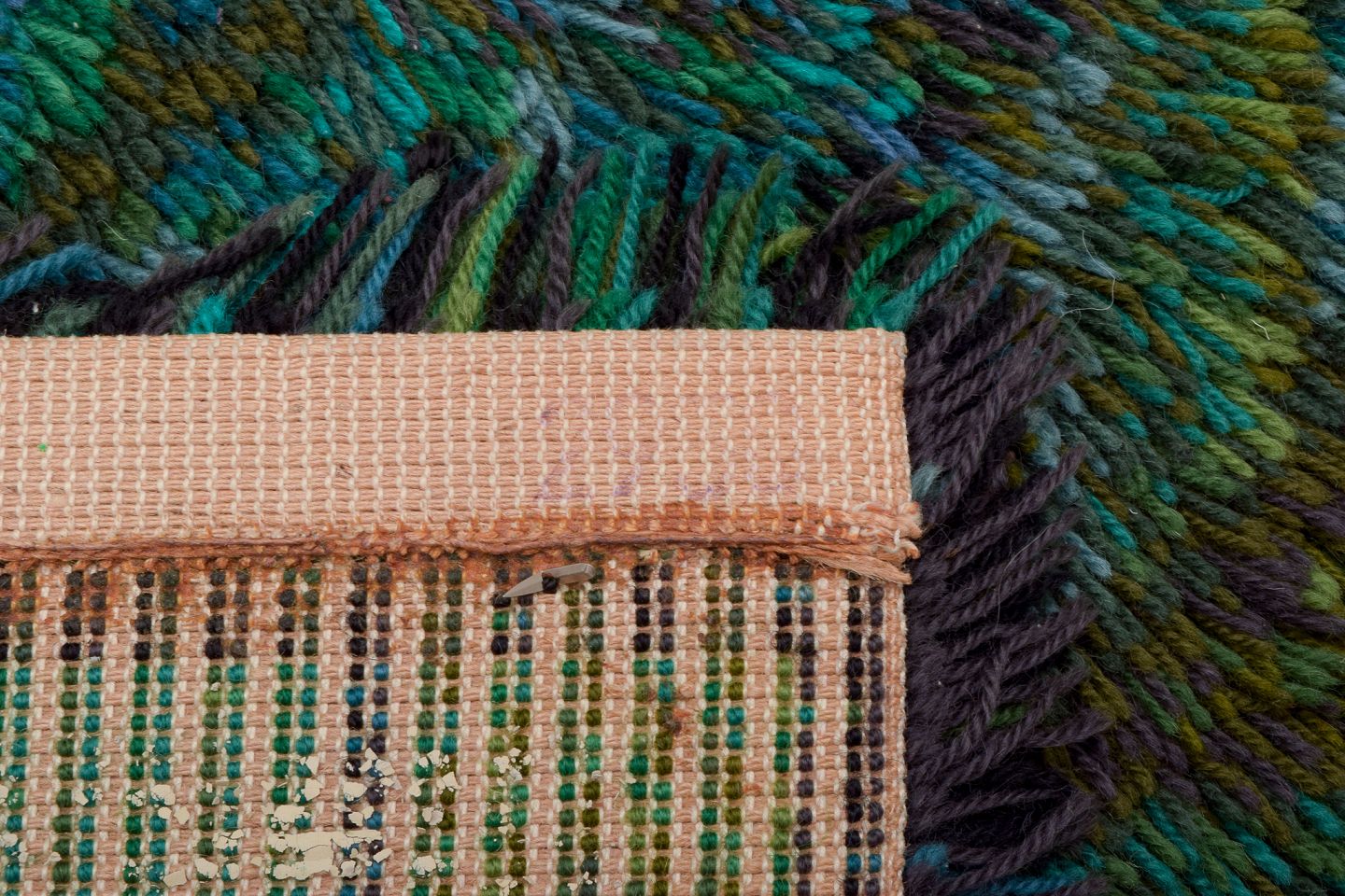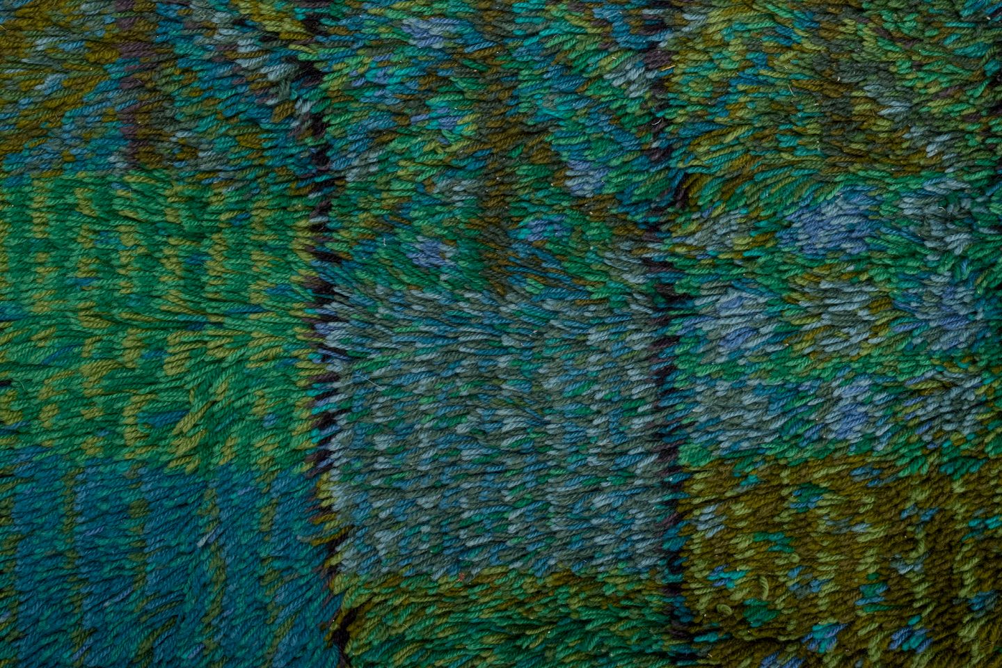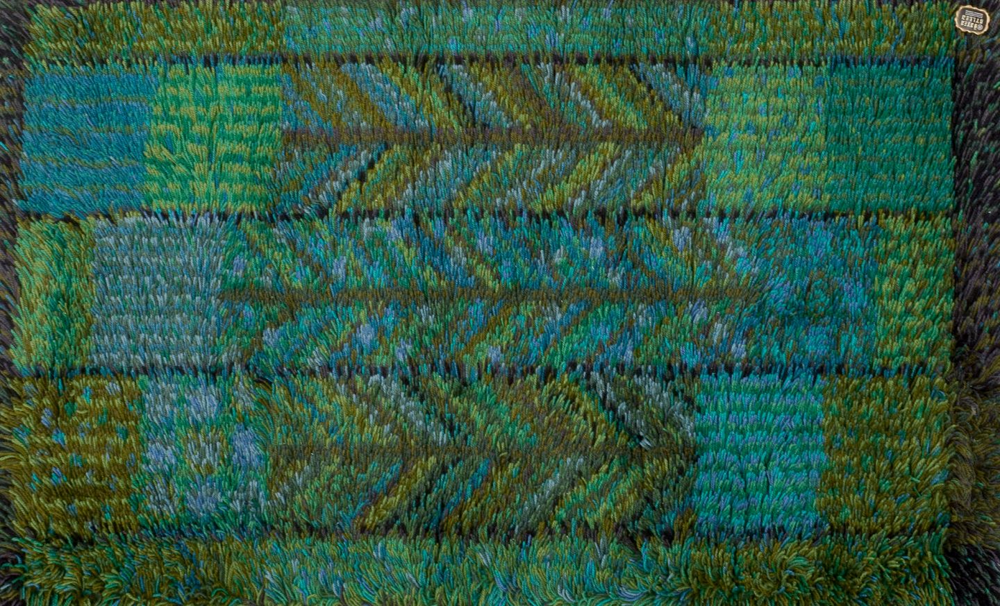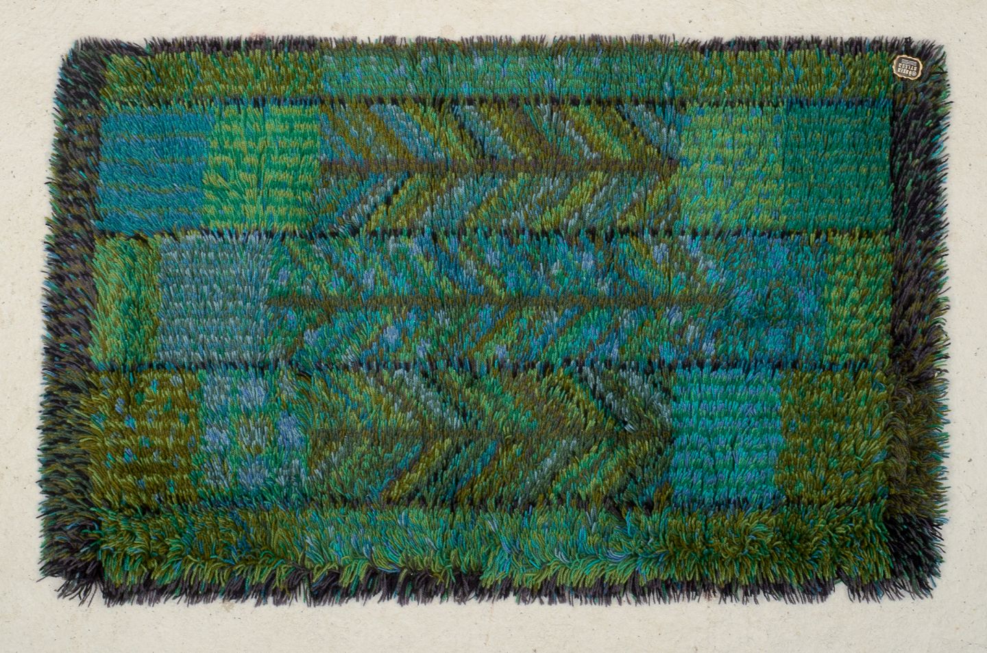 Marianne Richter, Sverige, ”Östergyllen” ryatæppe i grønne nuancer. Modernistisk design. 1970’erne. I flot stand. Med markat. Mål: 117 cm. x 74 cm.