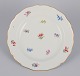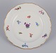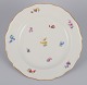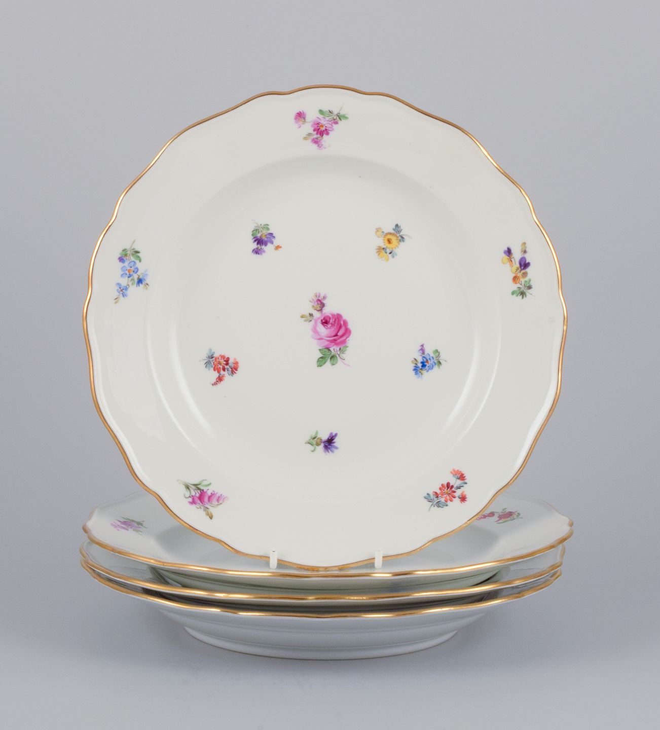 Meissen, Tyskland. Et sæt på fire middagstallerkner i porcelæn håndmalet med forskellige polykrome blomstermotiver samt guldkant.